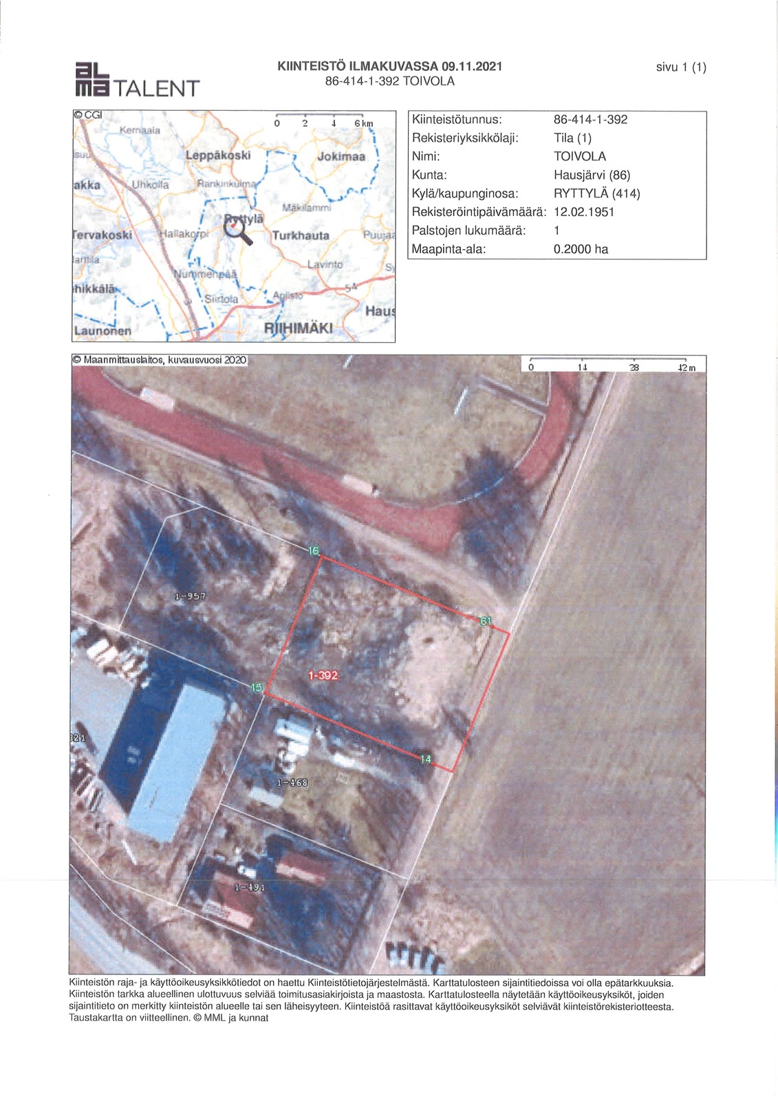 Toivola niminen tila 2000 m², jossa mahdollisuus suurehkon OKT:n rakentamiseen. Kaavan mukainen rakennusoikeus e=0,30. Tilalla valmiina vesi- , viemäri,- ja sähkölittymä, joka sisältyy hintaan.