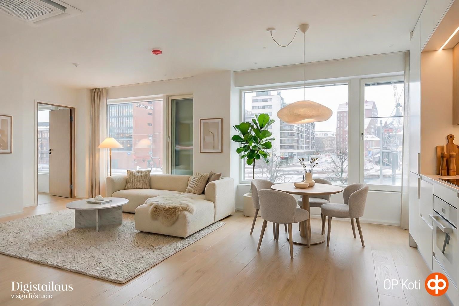 Uusi muuttovalmis 2. kerroksen näköalahuoneisto, jossa korkeatasoiset vaaleat sisustusratkaisut ja silmiä hivelevät kaupunki- ja satama-allas näkymät. Tilava olohuone avokeittiöineen on kodin sydän ja säilytystilaa on riittävästi. Erittäin laadukas kylpyhuone, jossa arkeen kuuluva pyykkihuolto on kauniisti piilotettu maitolasiovien taakse. Sisustusarkkitehti Henna Mannisen suunnittelemista sisustusvaihtoehdoista tähän asuntoon on valittu modernin pehmeä Arkki.