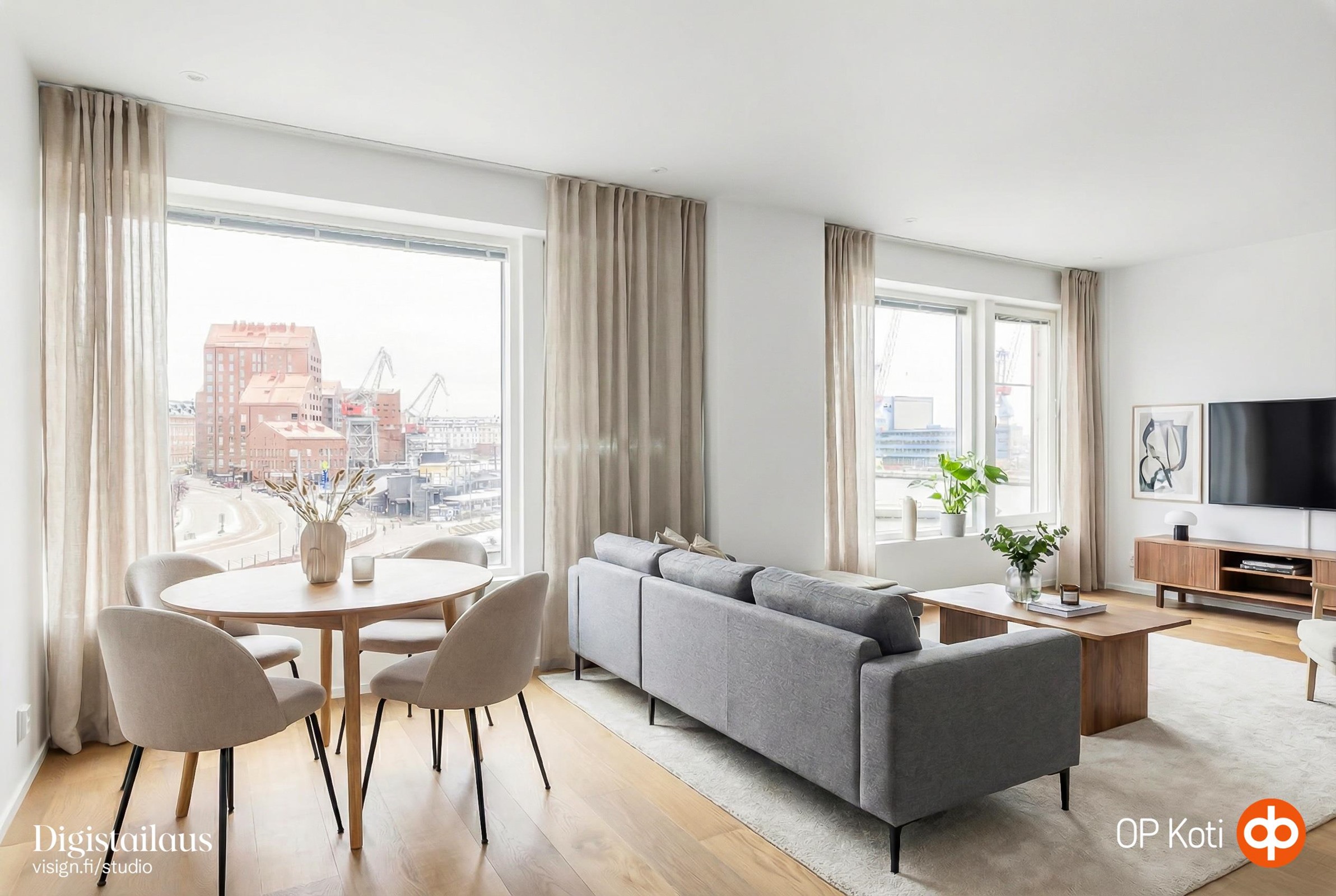 Uusi muuttovalmis 5. kerroksen näköalahuoneisto, jonka korkeatasoiset sisustusratkaisut huokuvat tummaa arvokkuutta ja jolla on silmiä hivelevät kaupunki- ja satama-allas näkymät. Tämän ylellisyyttä henkivän huoneiston sydän on yhdistetty avara olohuone, ruokailutila ja avokeittiöratkaisu saarekkeineen, joka katsoo Hietalahdenrannan satama-altaille ja kaupungin sykkeeseen. Päämakuuhuone sijaitsee myös Hietalahdenrannan puolella ja sieltä on suora käynti saunalliseen kylpyhuoneeseen. Kaksi pienempää makuuhuonetta, joista toinen on parvekkeellinen, sijaitsevat sisäpihan puolella. Kodinhoidolle on varattu kokonaan oma, erillinen tilansa. Säilytystilaa on reilusti. Sisustusarkkitehti Henna Mannisen suunnittelemista sisustusvaihtoehdoista tähän asuntoon on valittu Fontti.