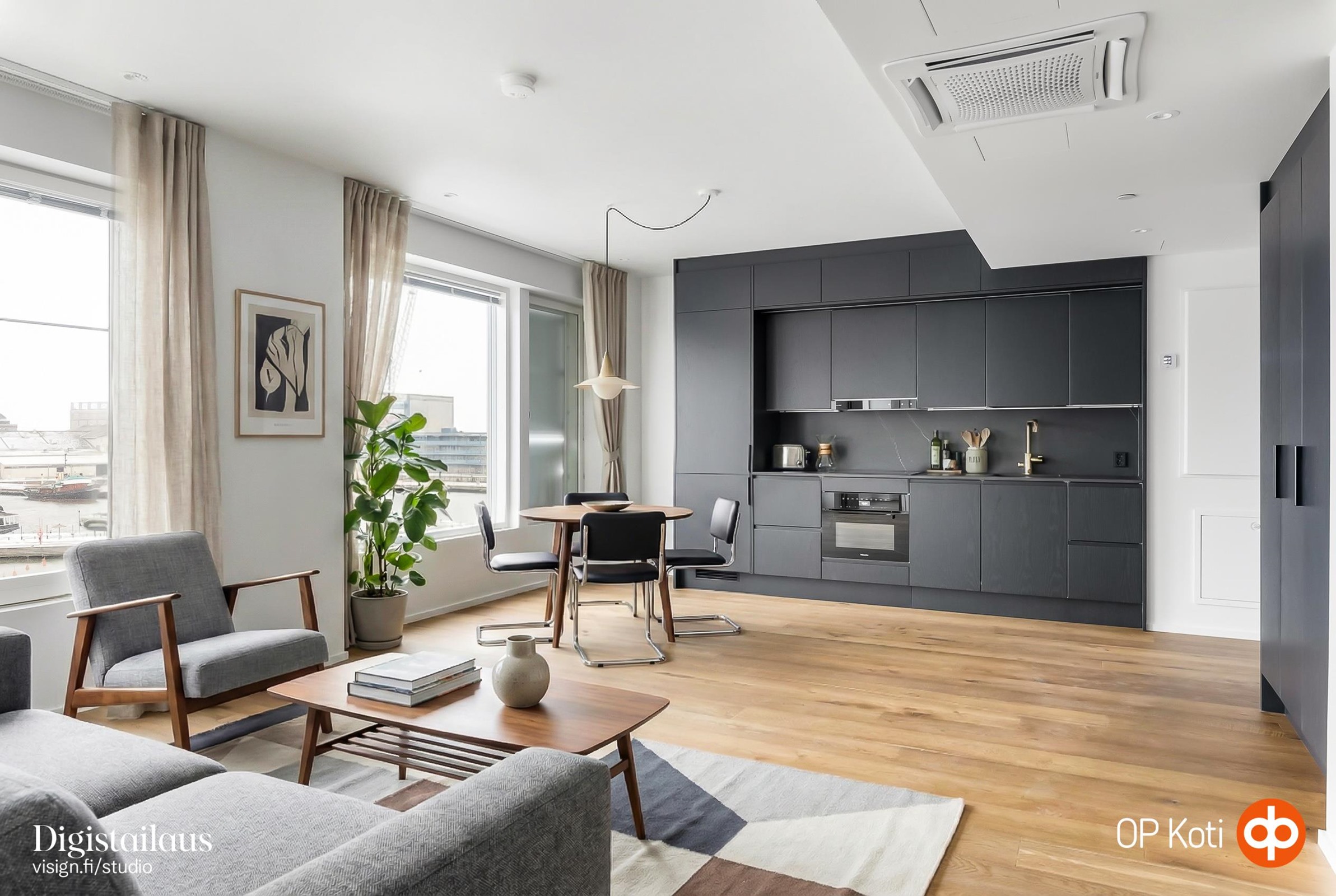 Uusi muuttovalmis näköalahuoneisto korkeatasoisin vaalein sisustusratkaisuin ja silmiä hivelevin kaupunki- ja satama-allas näkymin. Tilava olohuone avokeittiöineen on kodin sydän ja säilytystilaa on riittävästi. Erittäin laadukas kylpyhuone, jossa arkeen kuuluva pyykkihuolto on kauniisti piilotettu maitolasiovien taakse. Sisustusarkkitehti Henna Mannisen suunnittelemista sisustusvaihtoehdoista tässä asunnossa on oleskelutilojen tummaa, arvokkuutta huokuvaa Fonttia saniteettitilojen Kolumni-konseptin laattoihin sekä seinä- ja kattopaneeleihin ja mustiin yksityiskohtiin heloissa, väliovien painikkeissa ja saunan lasiseinän mustissa kehyksissä.