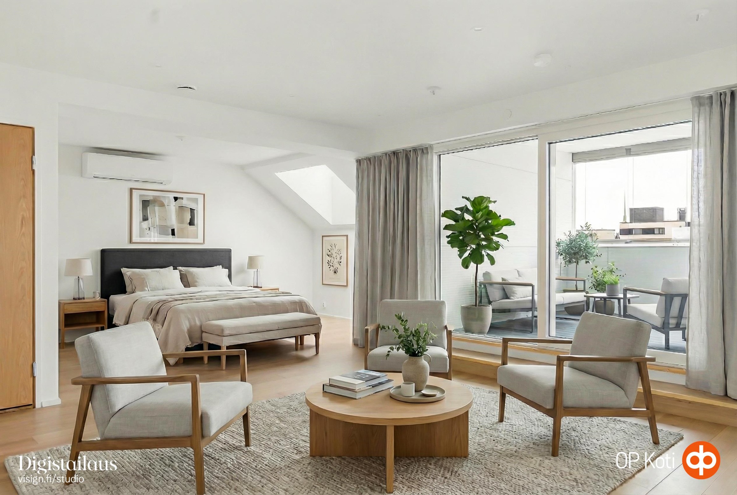 Tämä uusi muuttovalmis upea 2-tasoinen kokonaisuus 8. - 9. kerroksissa on toteutettu erittäin laadukkain ja arvokkuutta huokuvin sisustusratkaisuin. Yläkerrassa ylellisyyden tunnetta lisäävät kattoikkunat ja suuri lasitettu terassiparveke etelään sekä tyylikäs saunaosasto sadesuihkuineen ja ammeineen. Täältä löytyy omat tilansa myös kodinhoitoon ja ihana avara tila oleskeluun tai masterbedroomiksi. Sisääntulokerroksessa on lämminhenkiset läpitalon oleskelutilat ja makuuhuone, josta kulku sisäpihanpuolen parvekkeelle. Sisustusarkkitehti Henna Mannisen suunnittelemista sisustusvaihtoehdoista tähän asuntoon on valittu modernin pehmeä Arkki.