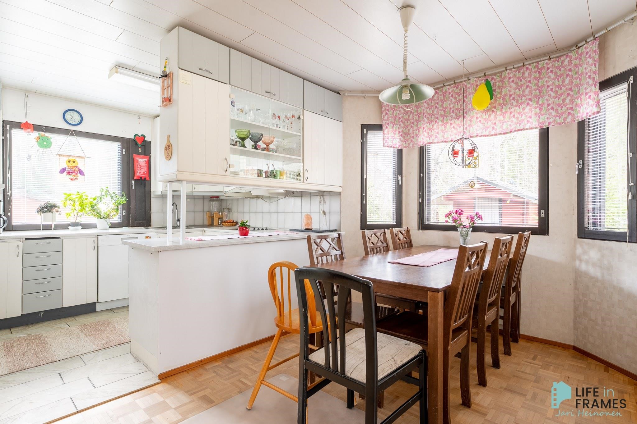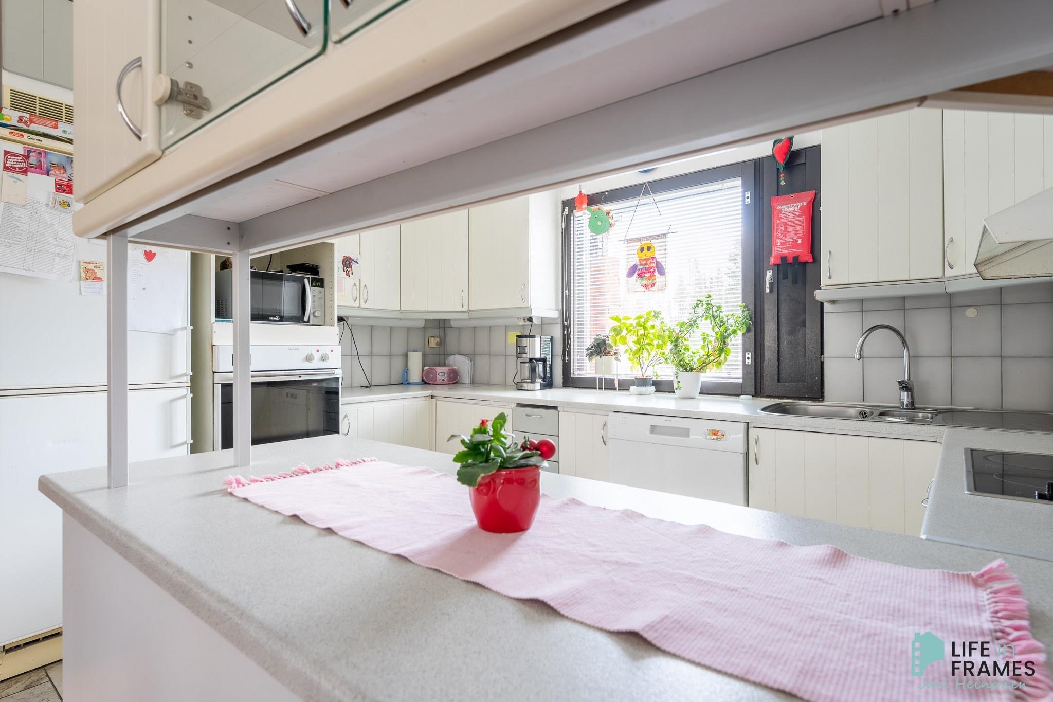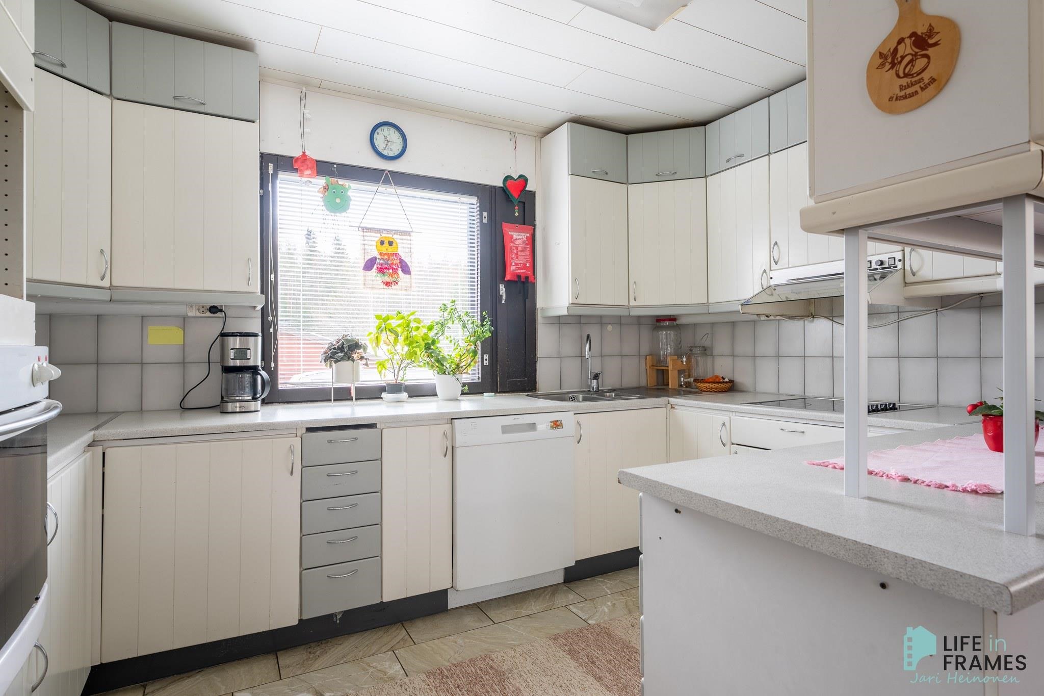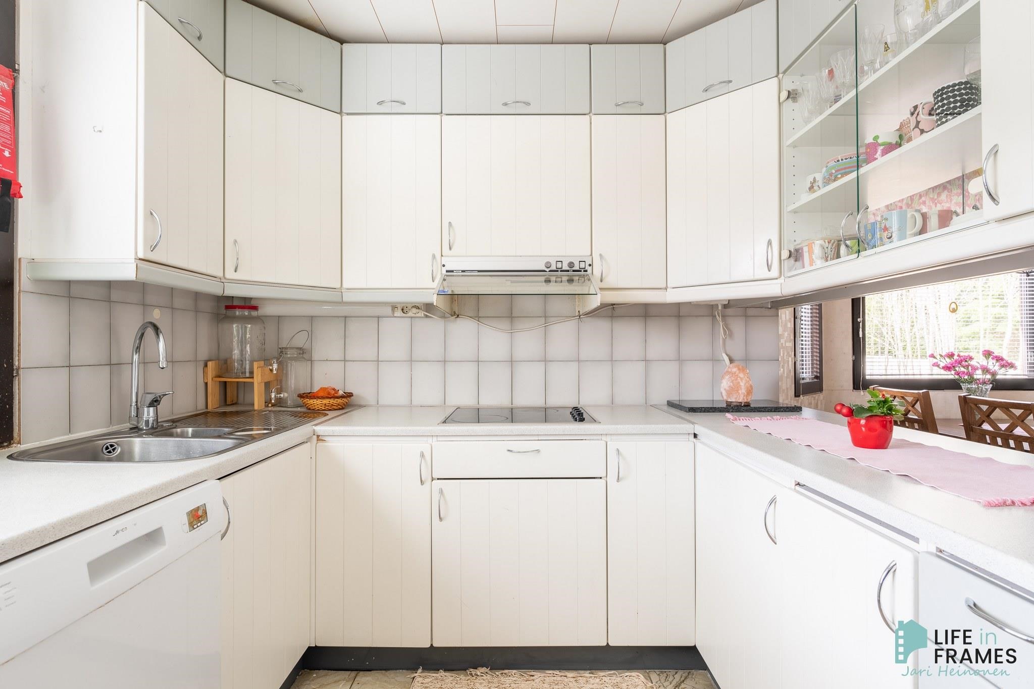 - Jääkaappi, erillisuuni, liesitaso, liesituuletin, astianpesukone, kaapistot, kiinteät valaisimet.