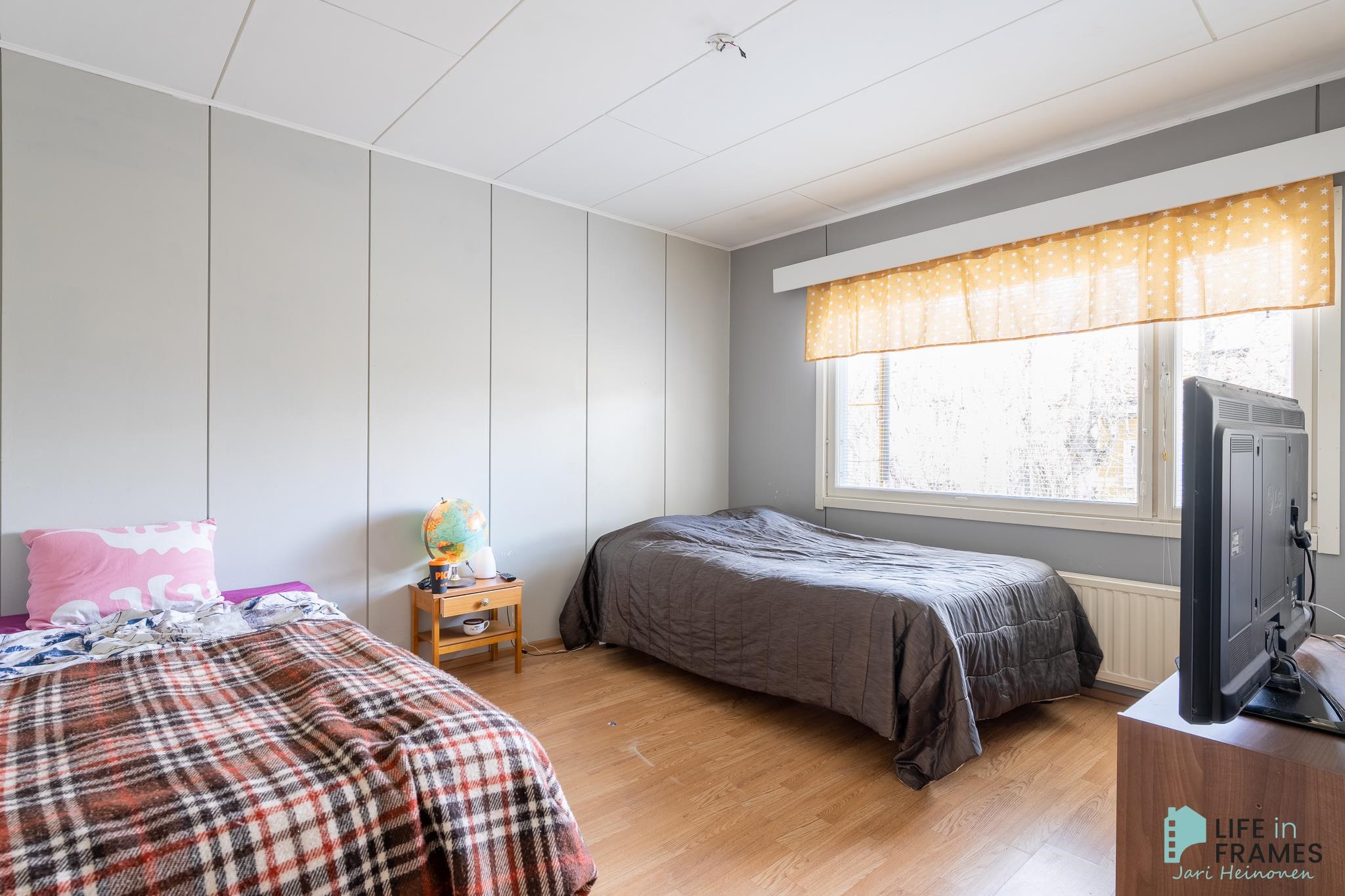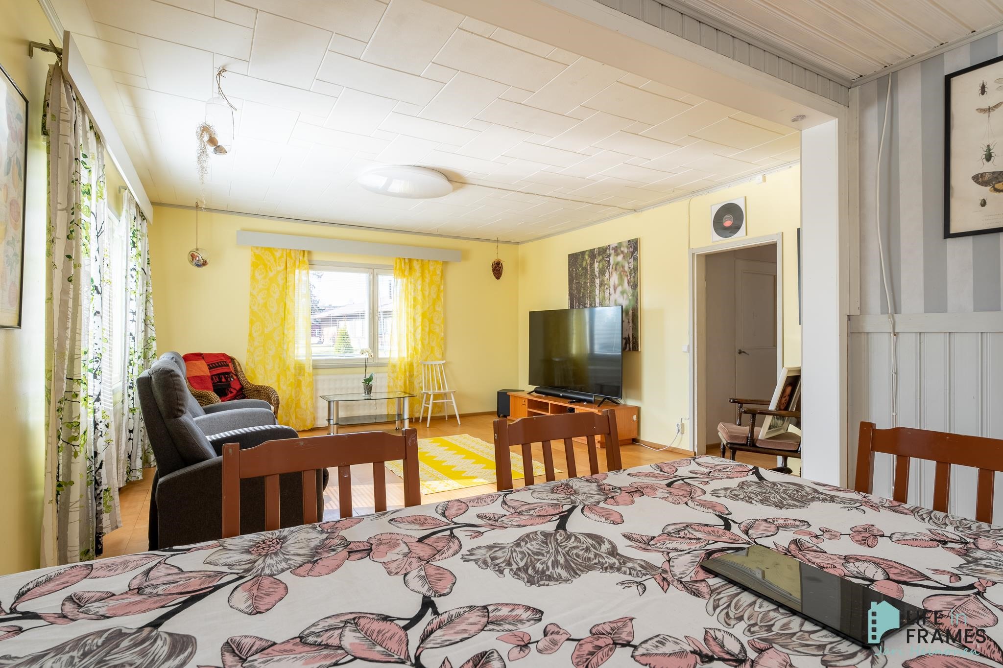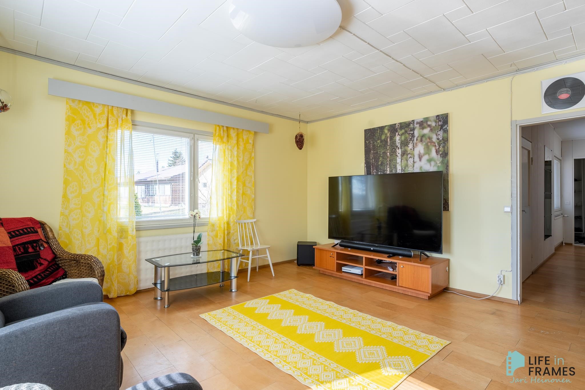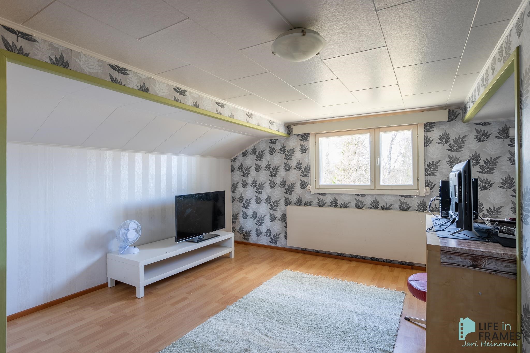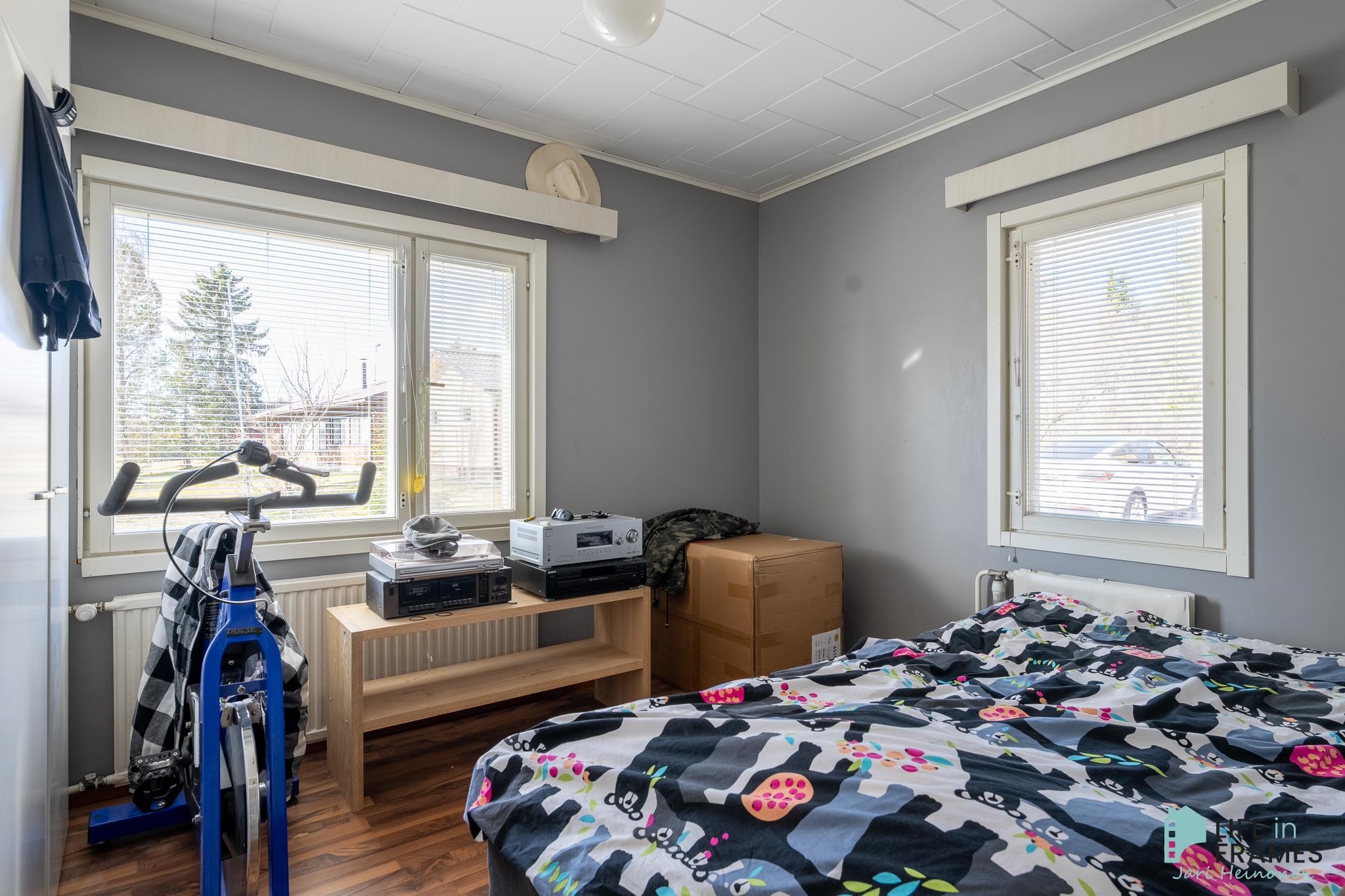 Huonetilat: Seinissä tapetti tai maali ja laittassa parketti, laminaatti tai vaneri..