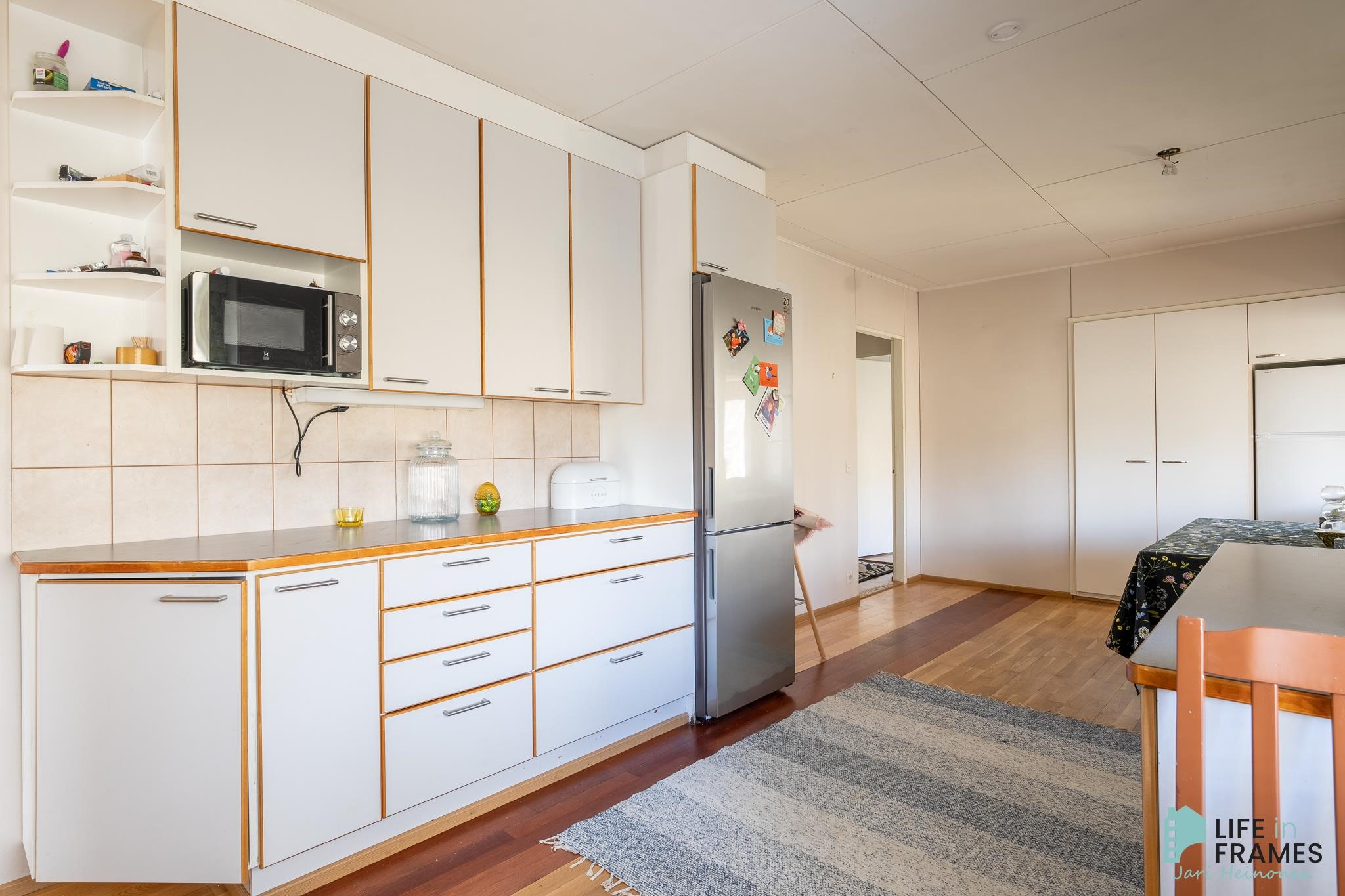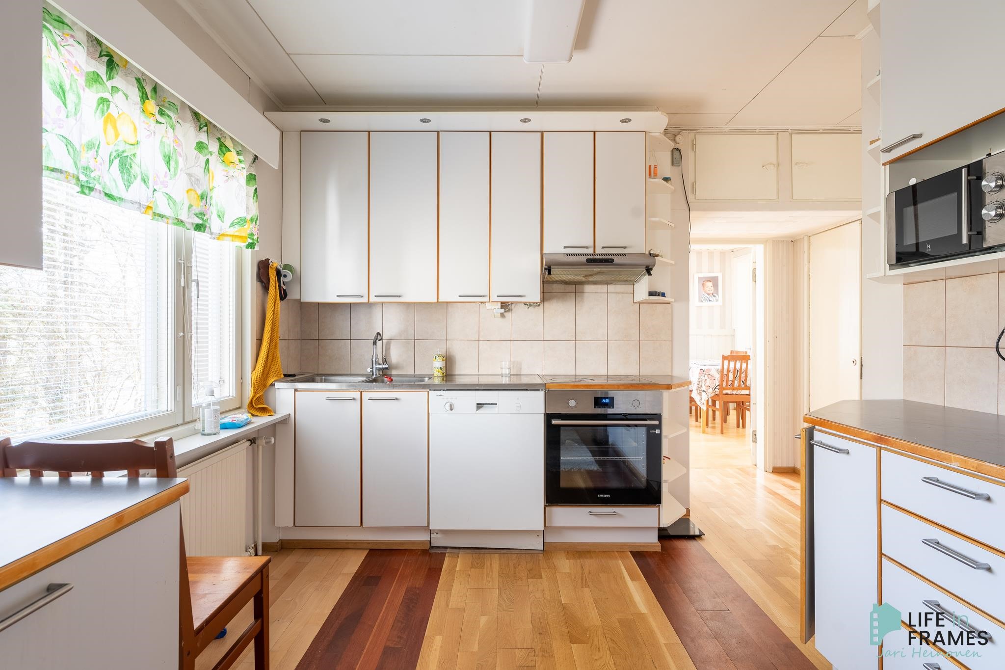 - Jääkaappipakastin (2023), erillisuuni (2023), liesitaso (keraaminen liesitaso), keraaminen liesi, liesituuletin, leivinuuni, astianpesukone, kaapistot, kiinteät valaisimet.