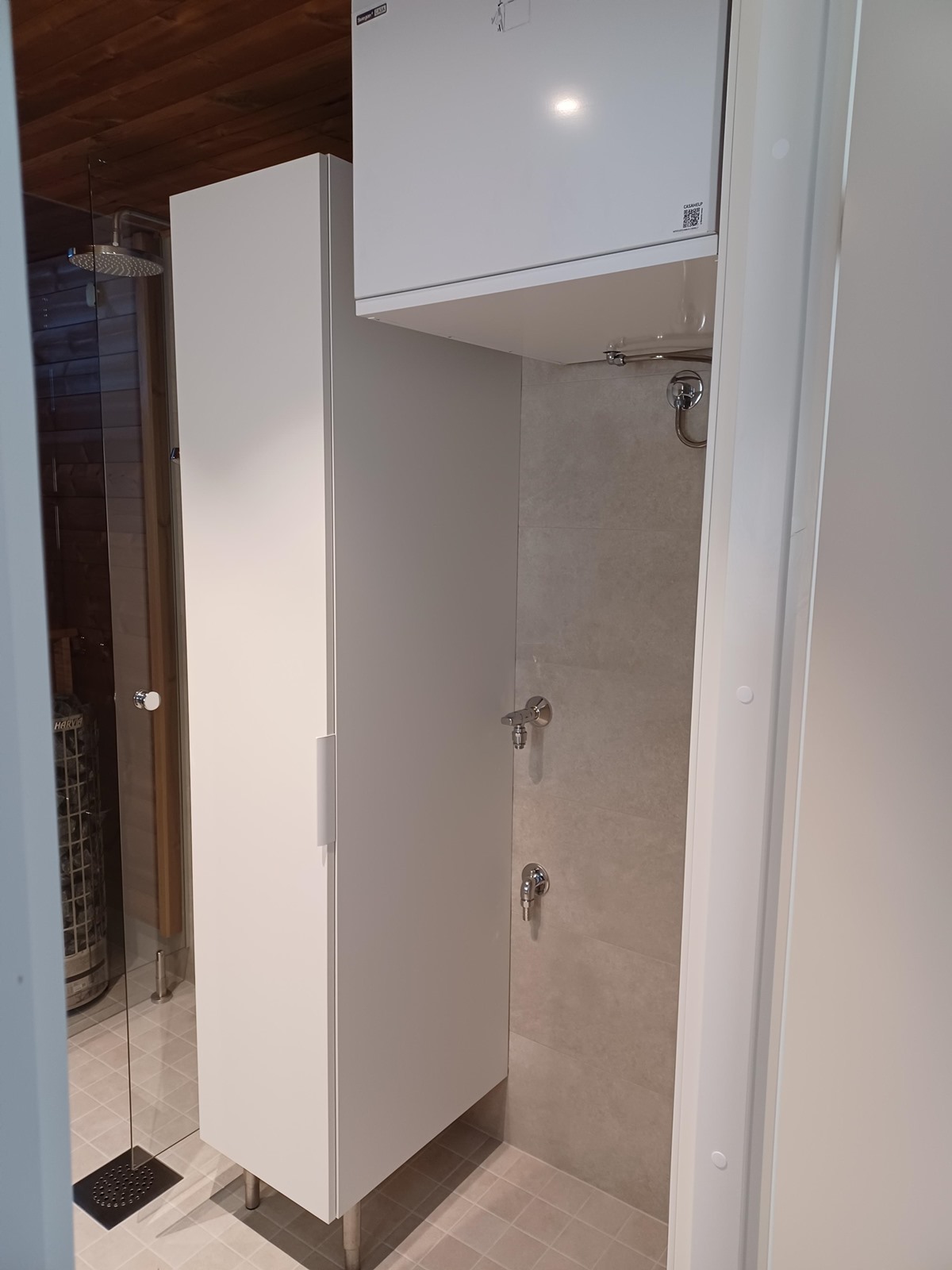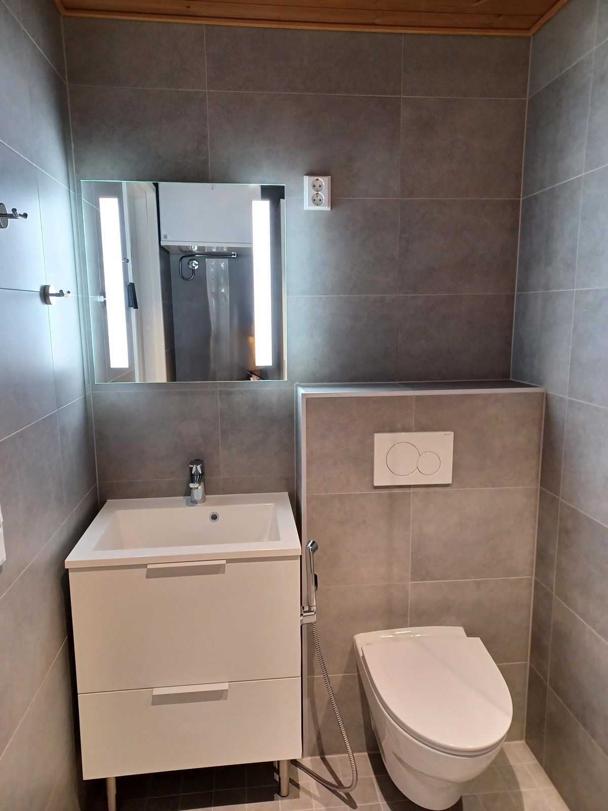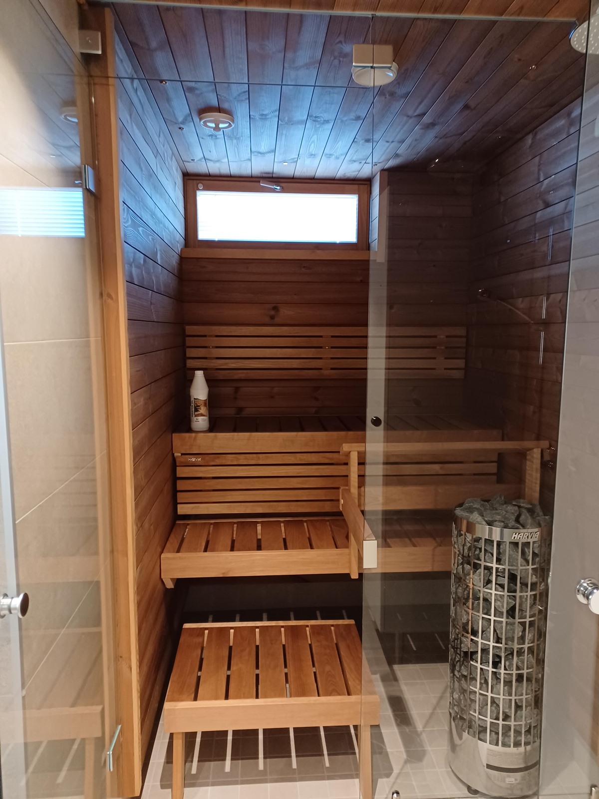 - Sauna, sähkökiuas, kylpyhuone /wc, suihku, suihkuseinä, kaapit, lattialämmitys.