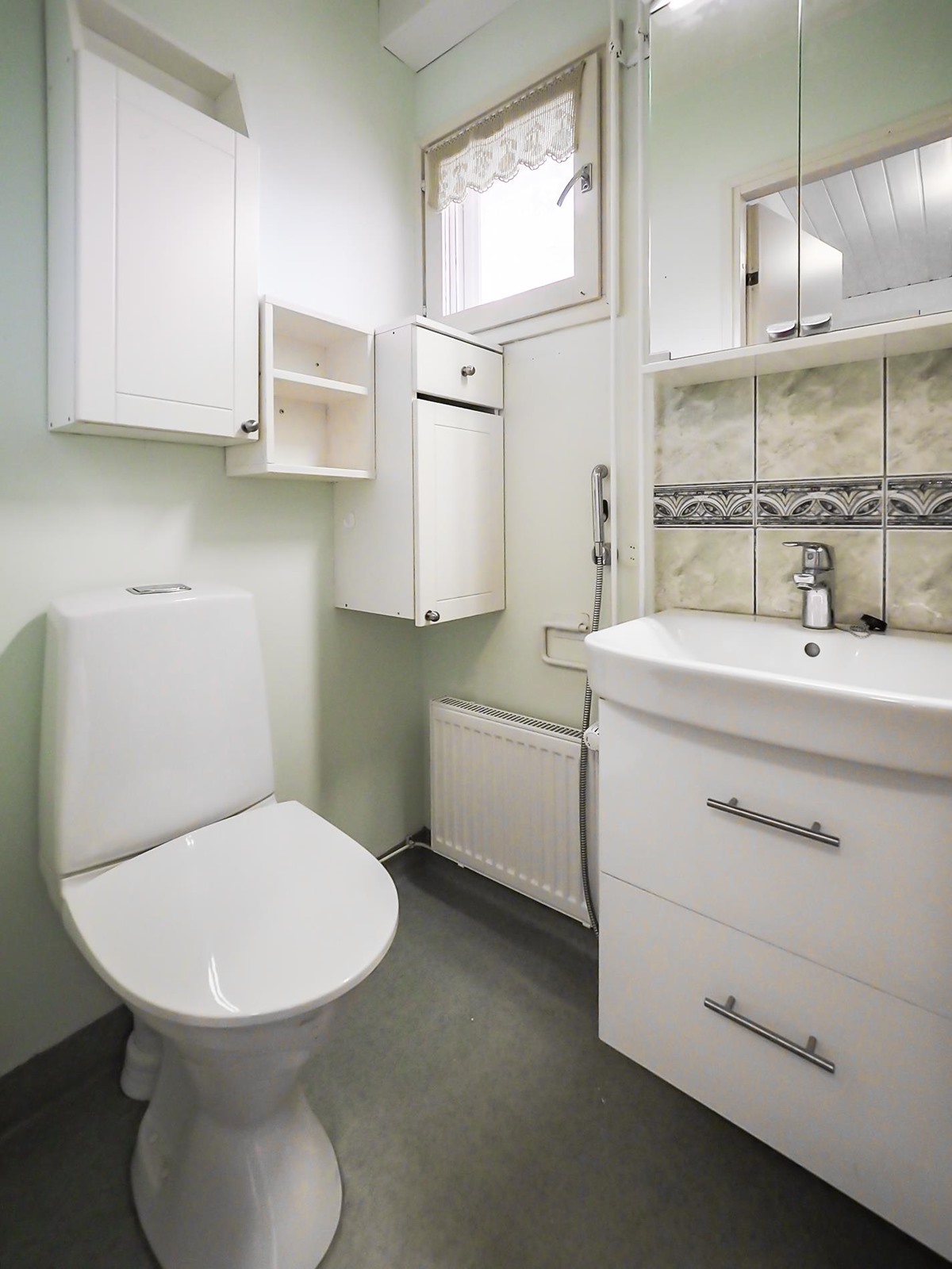 - Sauna, sähkökiuas, kylpyhuone, erillinen wc, suihku, suihkuseinä, peilit, peilikaappi, kaapit, allaskaappi, pesukoneliitäntä, lattialämmitys, kiinteät valaisimet. WC:n kalusteet uusittu noin 2 v. sitten