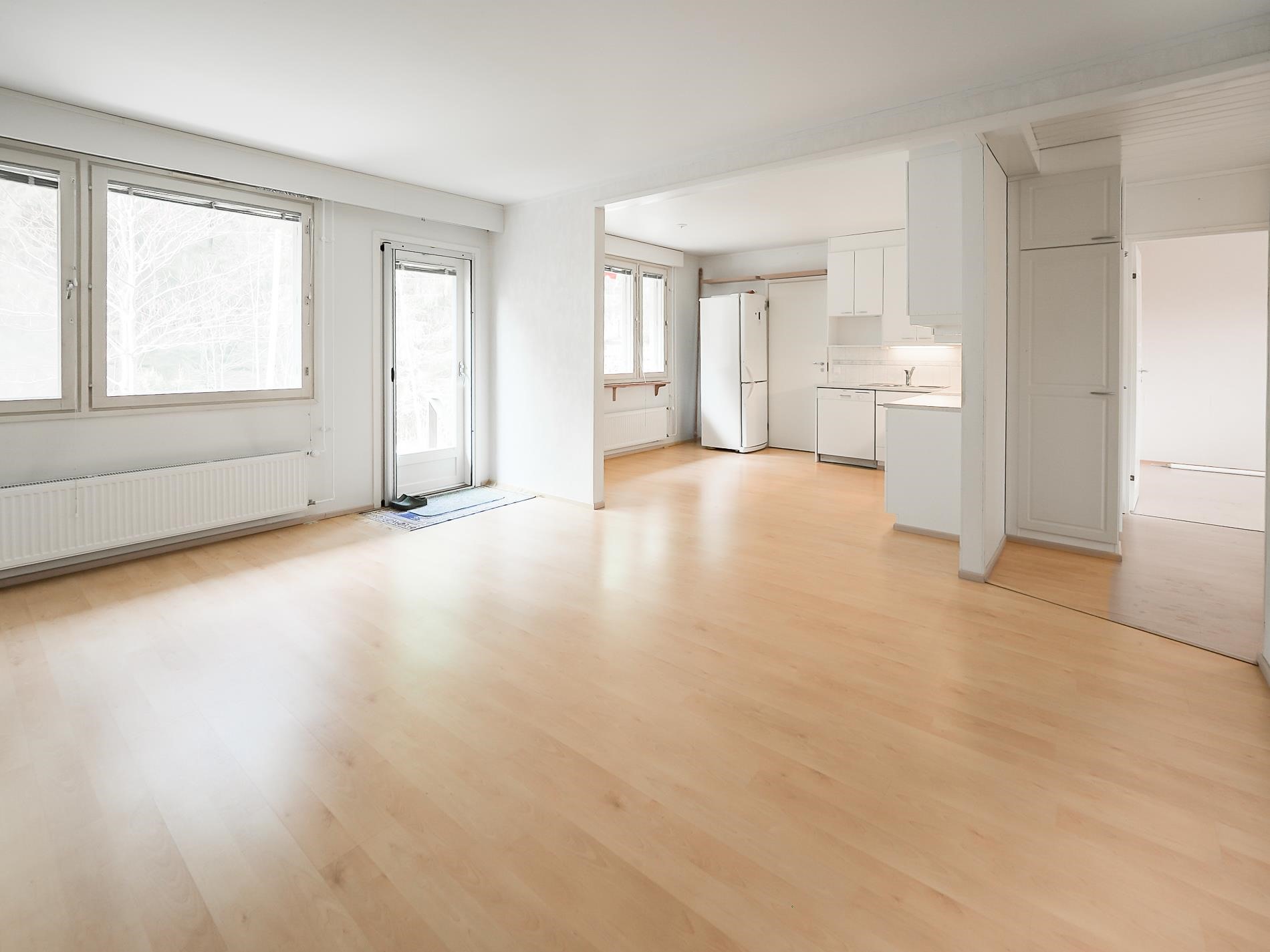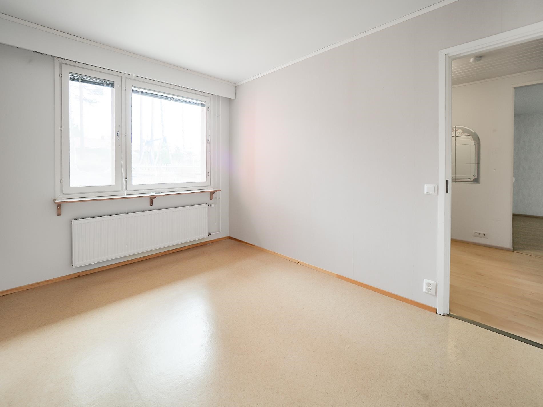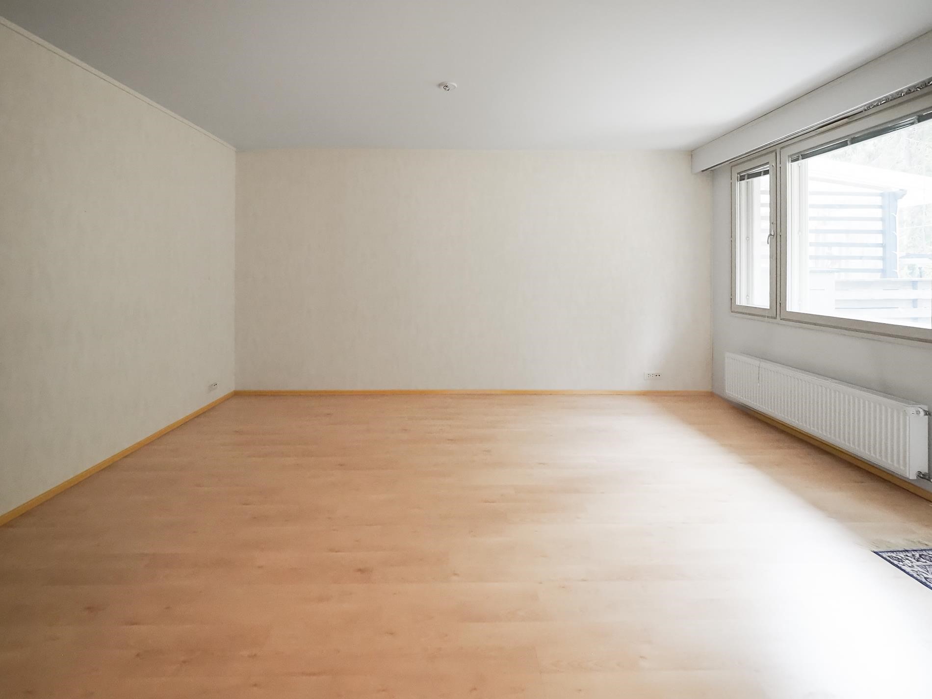 Kodissa on kaksi tilavaa makuuhuonetta, iso olohuone ja keittiö, kylpyhuone ja sauna sekä eteinen ja erillinen wc. Pinnat ovat siistit ja koti on valoisa. Olohuoneesta pääset länteen aukeavalle takapihalle, joka rajoittuu metsään. Kaappitilaa löytyy reiluusti makuuhuoneista ja eteisestä. Keittiössä laskutilaa on enemmän kuin tarpeeksi.