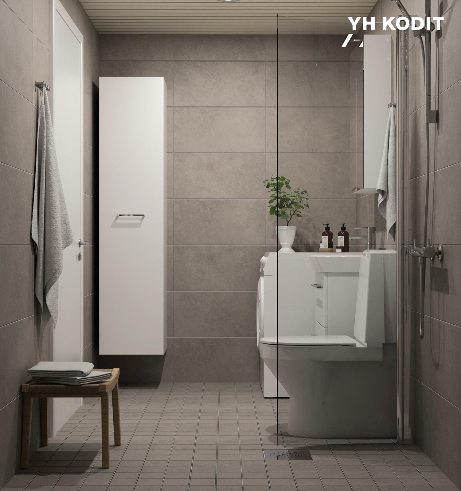- Valtaosassa pesuhuoneita on kääntyvät lasiset suihkuseinäkkeet (yksi tai kaksi suihkuseinää pohjakuvien mukaan) sekä liitäntävaraus pyykinpesukoneelle. Pesuhuoneissa on pesuallas, allaskaappi tai -laatikosto ja valaisinpeilikaappi. Kylpyhuoneiden lattiat ja seinät laatoitetaan ja katto paneloidaan.