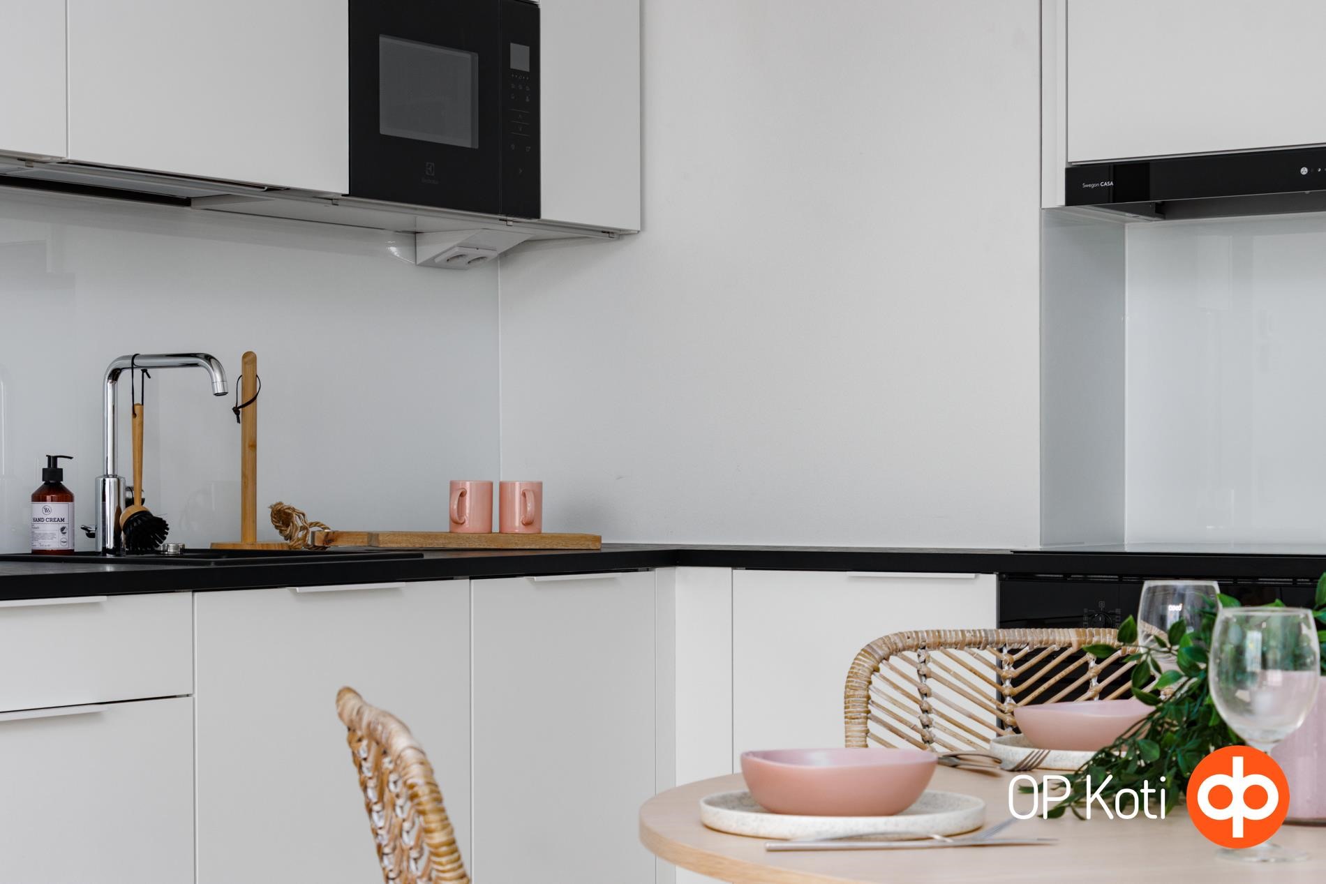 - Jääkaappipakastin (integroitu), erillisuuni, liesitaso (induktio), liesikupu, mikroaaltouuni (integroitu), astianpesukone (integroitu), kaapistot, kiinteät valaisimet. Keittiön työtasot ovat laminaattia ja altaat ovat ruostumatonta terästä tai komposiittia.