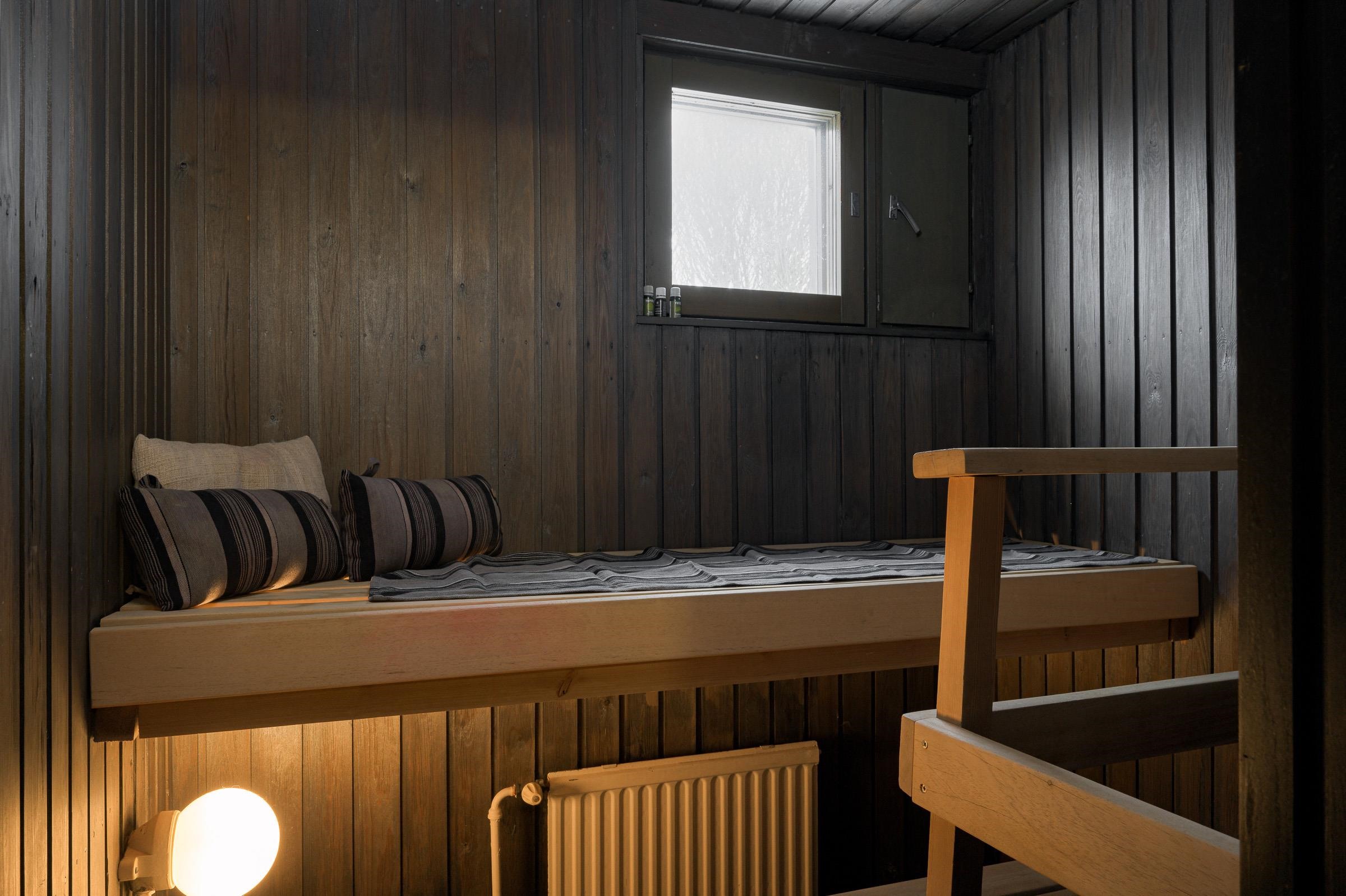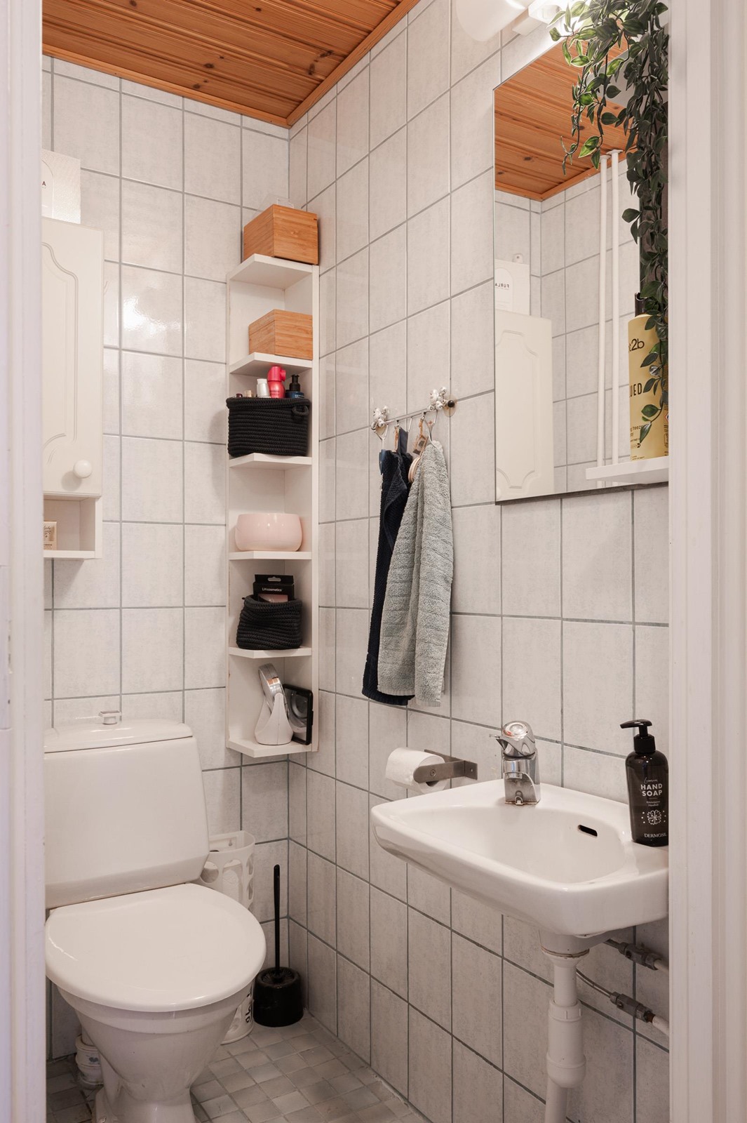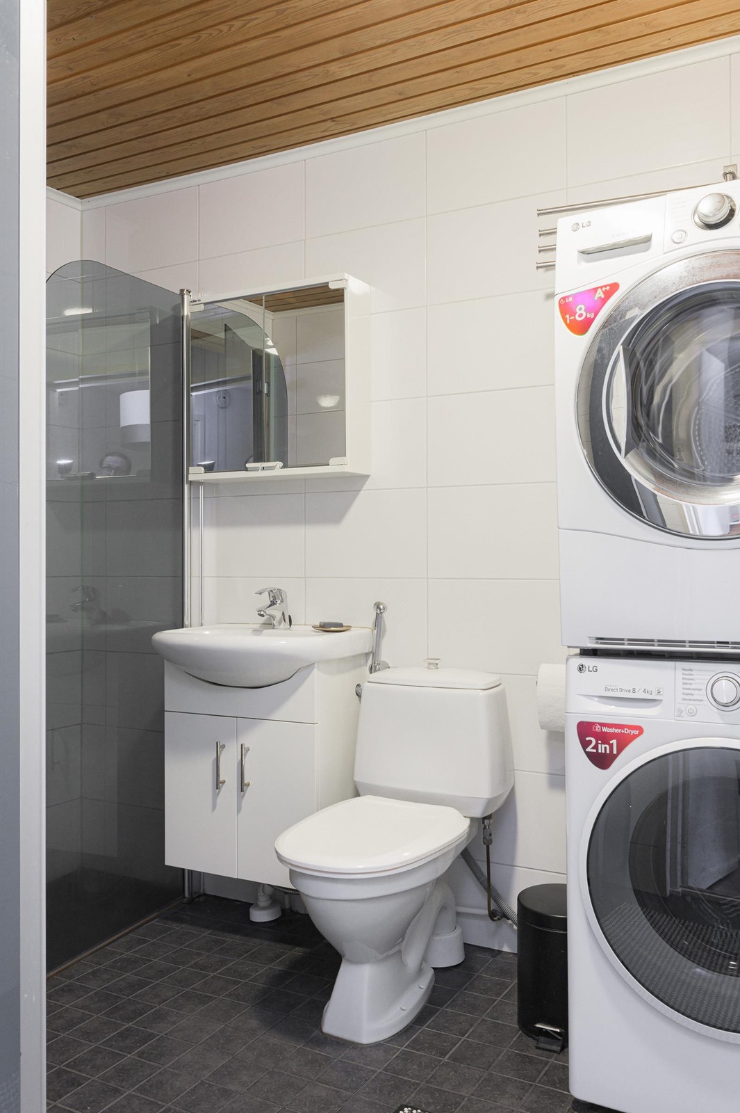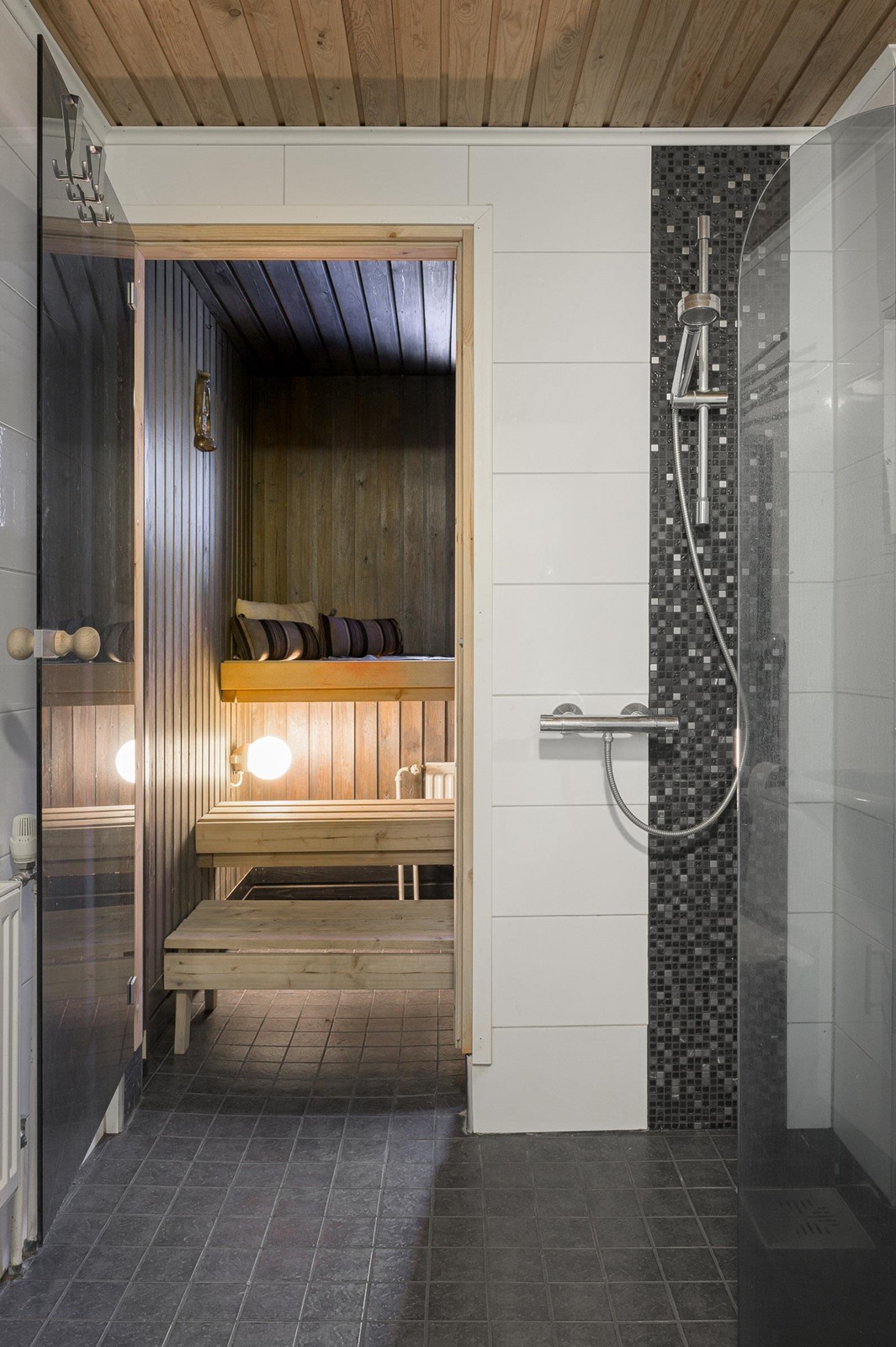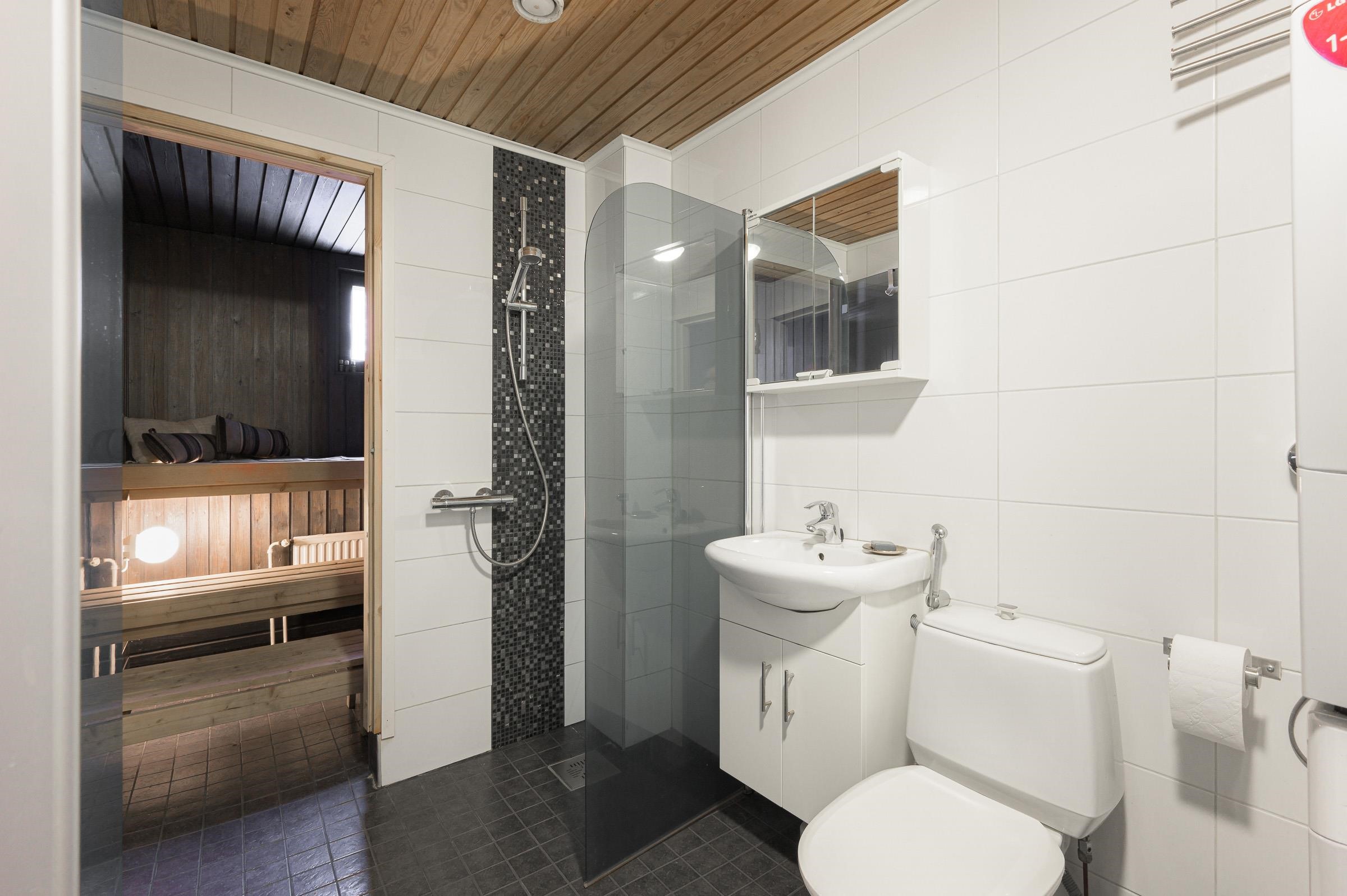 - Sauna lasiovi, lauteet, ikkuna, sähkökiuas, kylpyhuone suihku, suihkuseinä, pesukoneliitäntä, erillinen wc peili, lavuaari, wc-istuin.