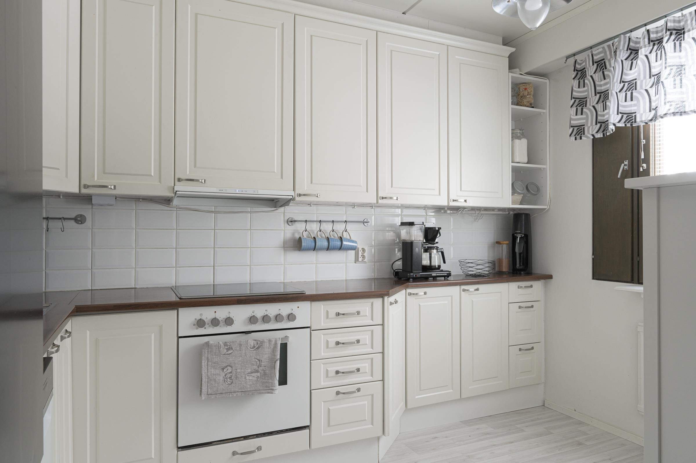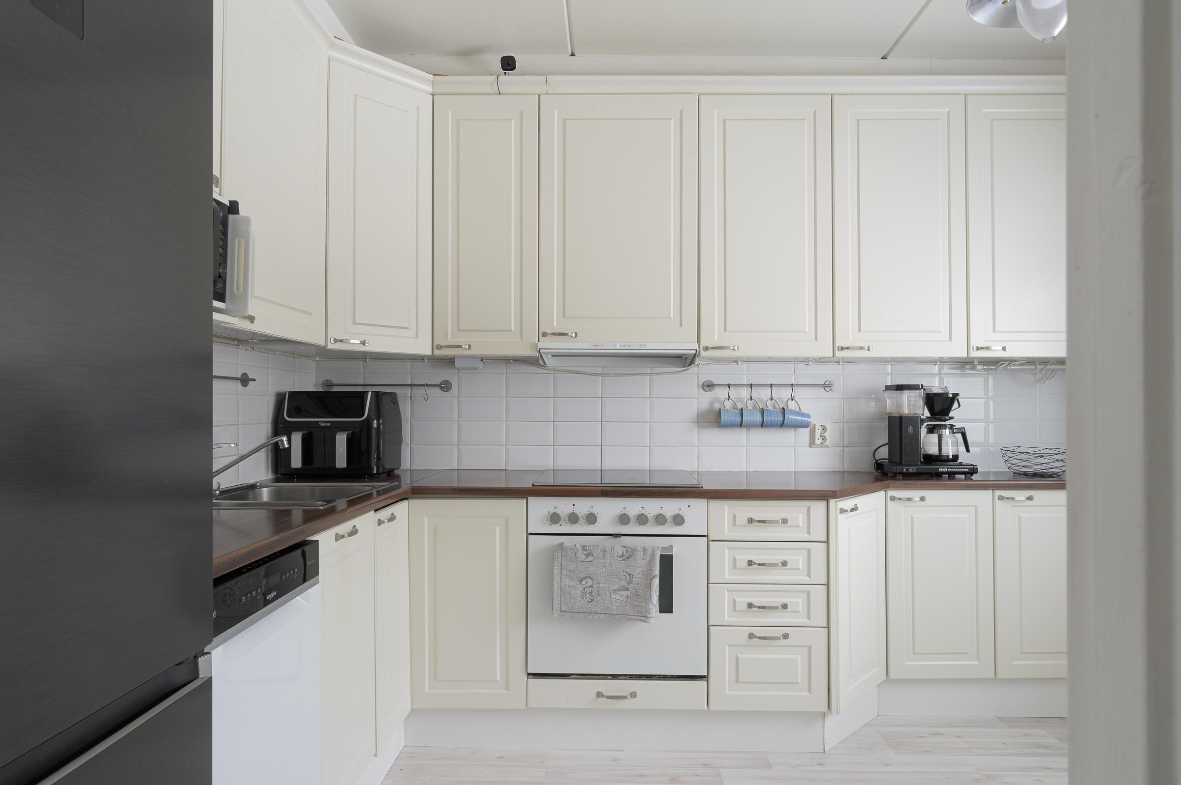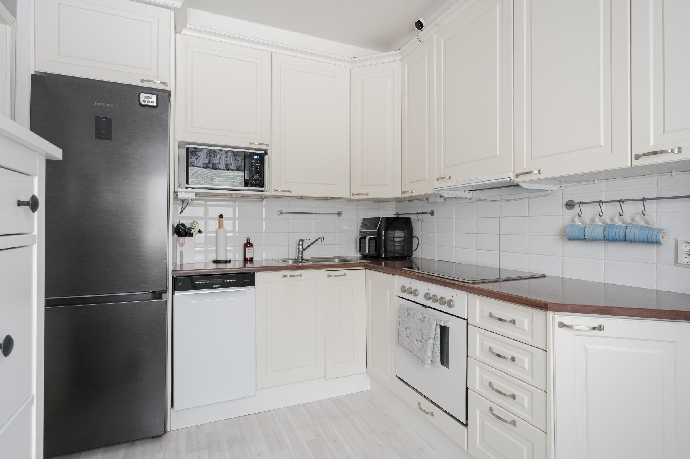 - Jääkaappipakastin, erillisuuni, keraaminen liesi, astianpesukone, kaapistot, kiinteät valaisimet.