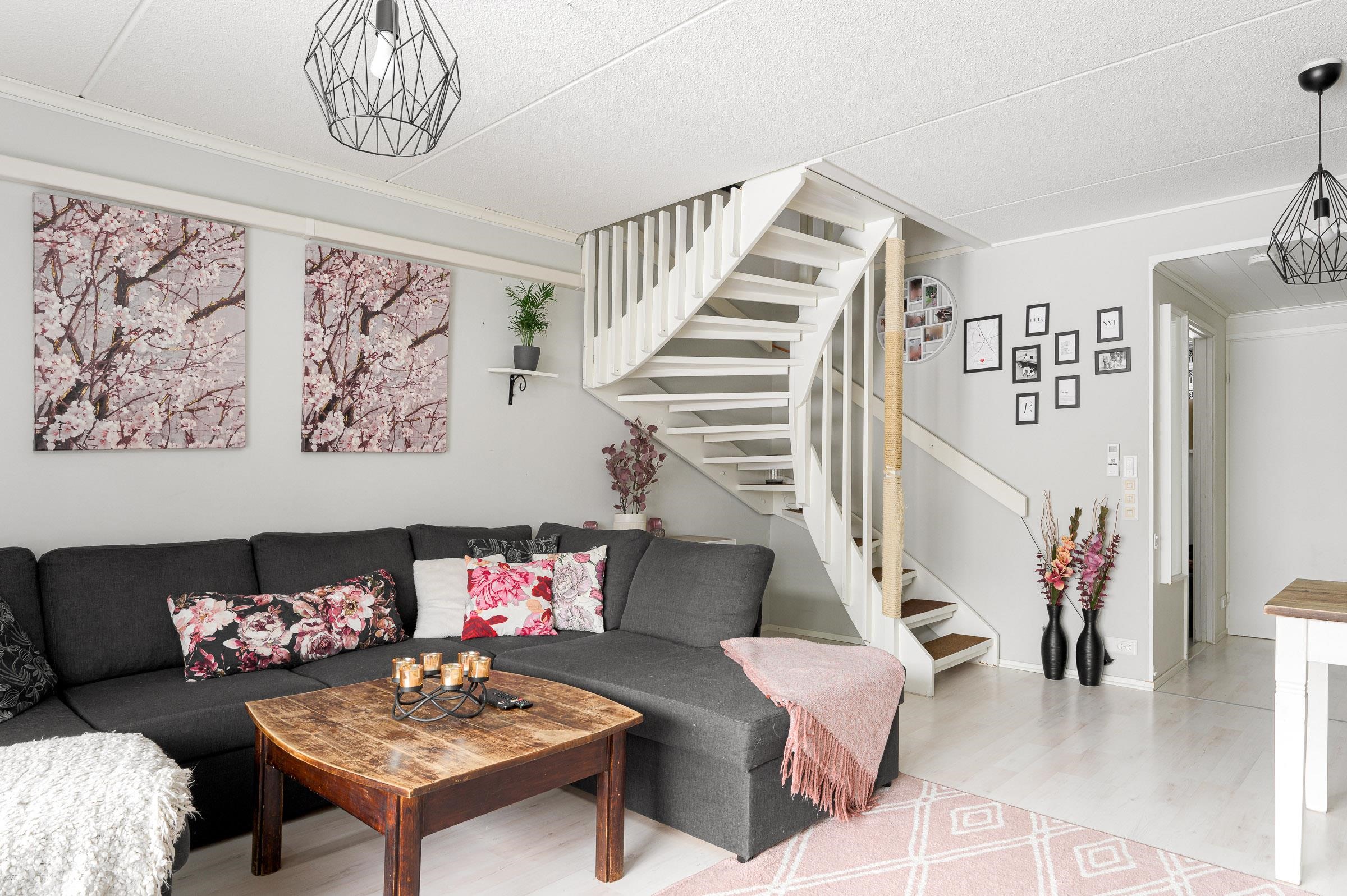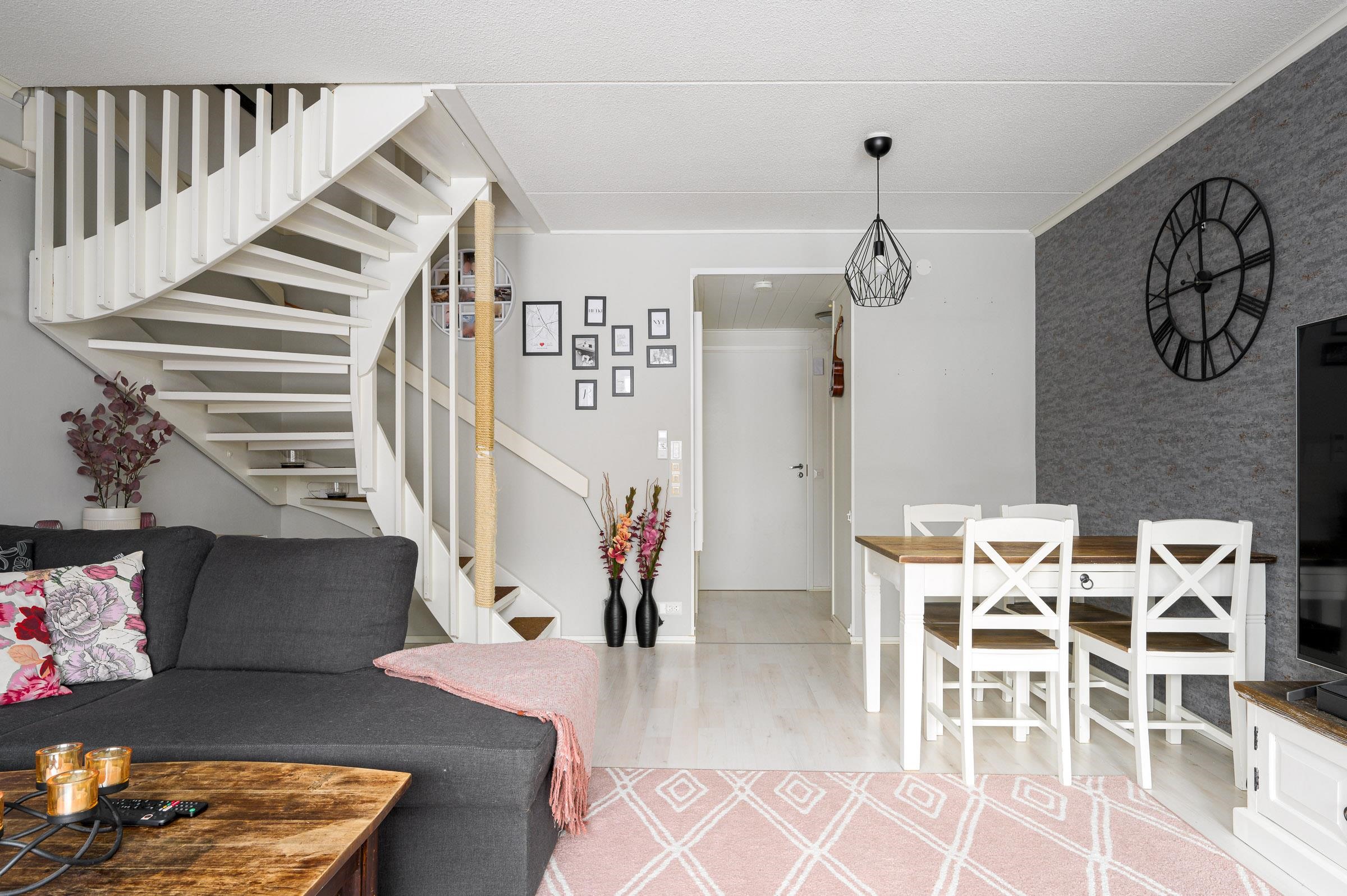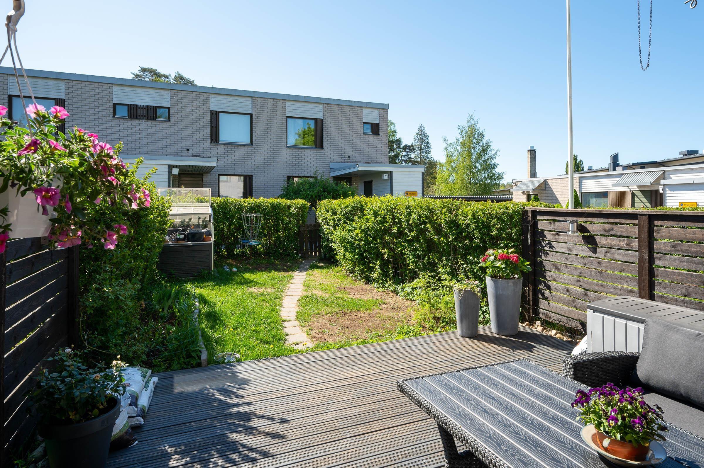 Kahdessa tasossa sijaitsevina asuintiloina alakerrassa kompakti eteisaula, hyvin varusteltu keittiö, erillinen wc, sekä avara olohuone, josta käynti takapihalle. Yläkerrassa kaksi makuuhuonetta ja kylpyhuone/wc, sekä sauna. Asunnossa on runsaasti säilytystilaa kaapistojen, vaatehuoneen ja ulkovaraston muodossa. Auton säilytystä varten on oma autokatospaikka.