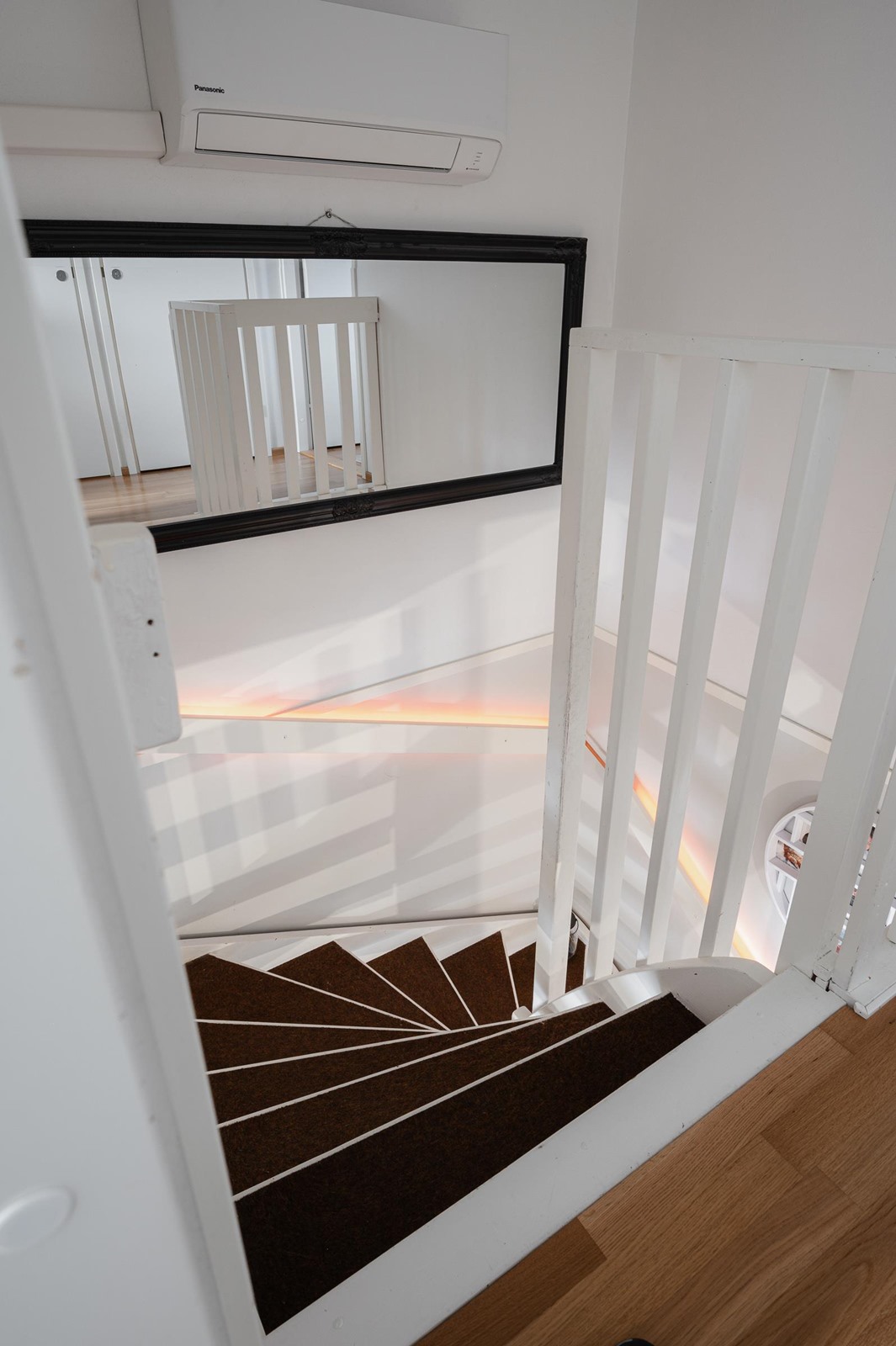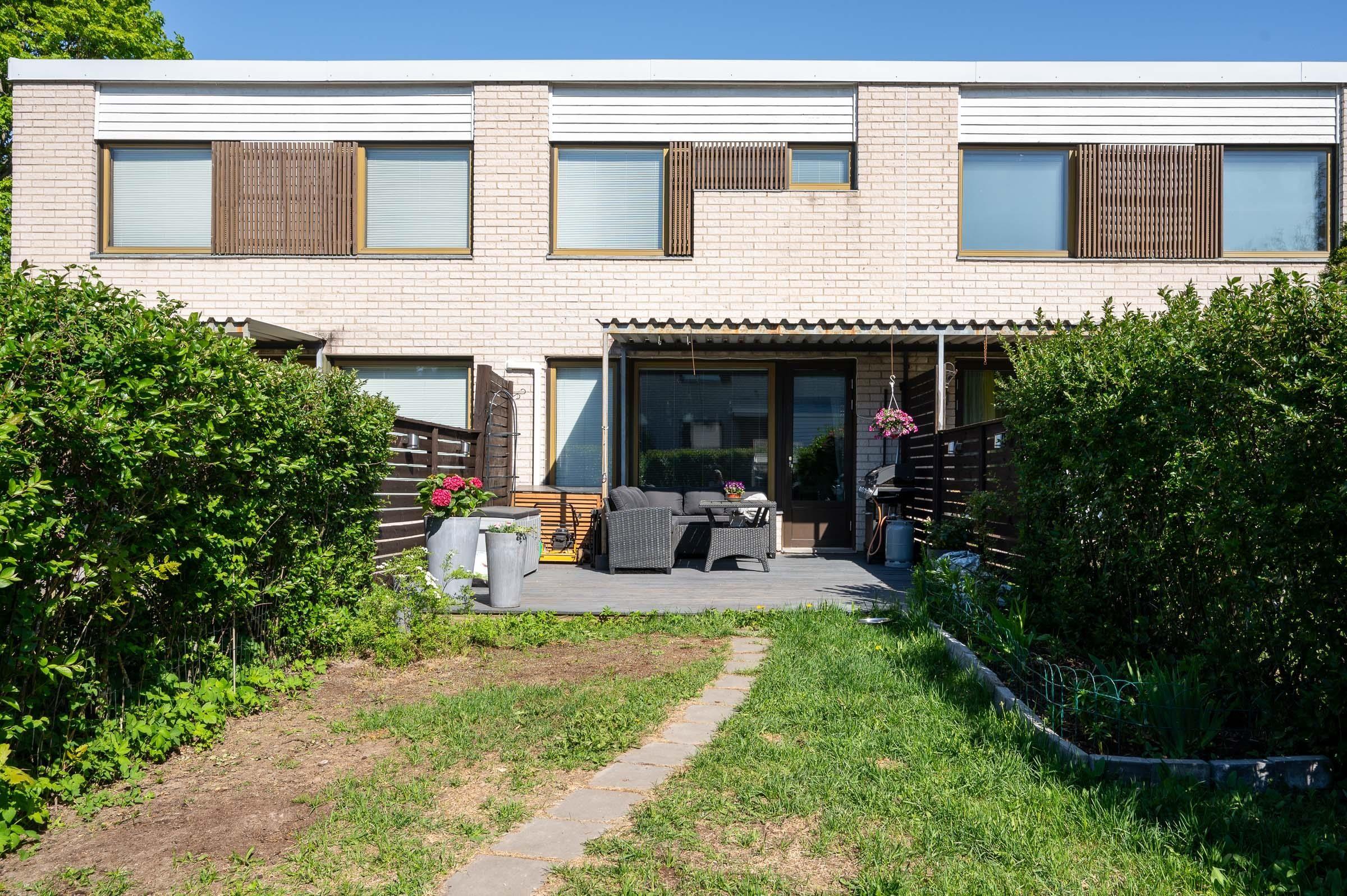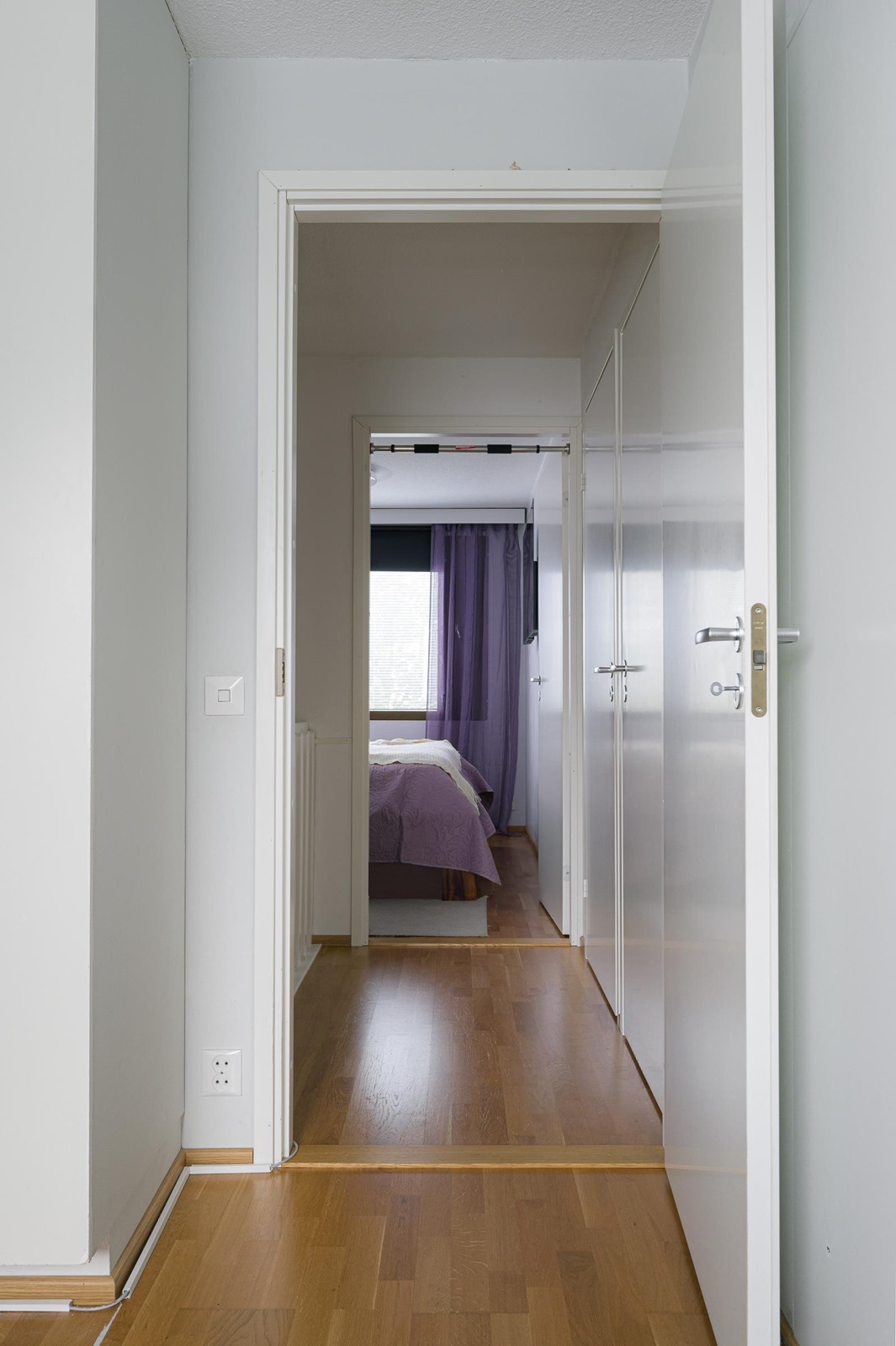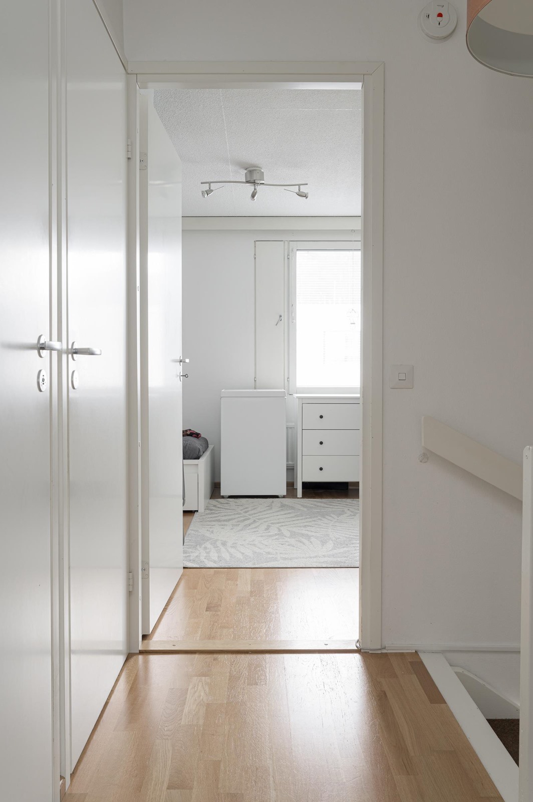 Kahdessa tasossa sijaitsevina asuintiloina alakerrassa kompakti eteisaula, hyvin varusteltu keittiö, erillinen wc, sekä avara olohuone, josta käynti takapihalle. Yläkerrassa kaksi makuuhuonetta ja kylpyhuone/wc, sekä sauna. Asunnossa on runsaasti säilytystilaa kaapistojen, vaatehuoneen ja ulkovaraston muodossa. Auton säilytystä varten on oma autokatospaikka.
