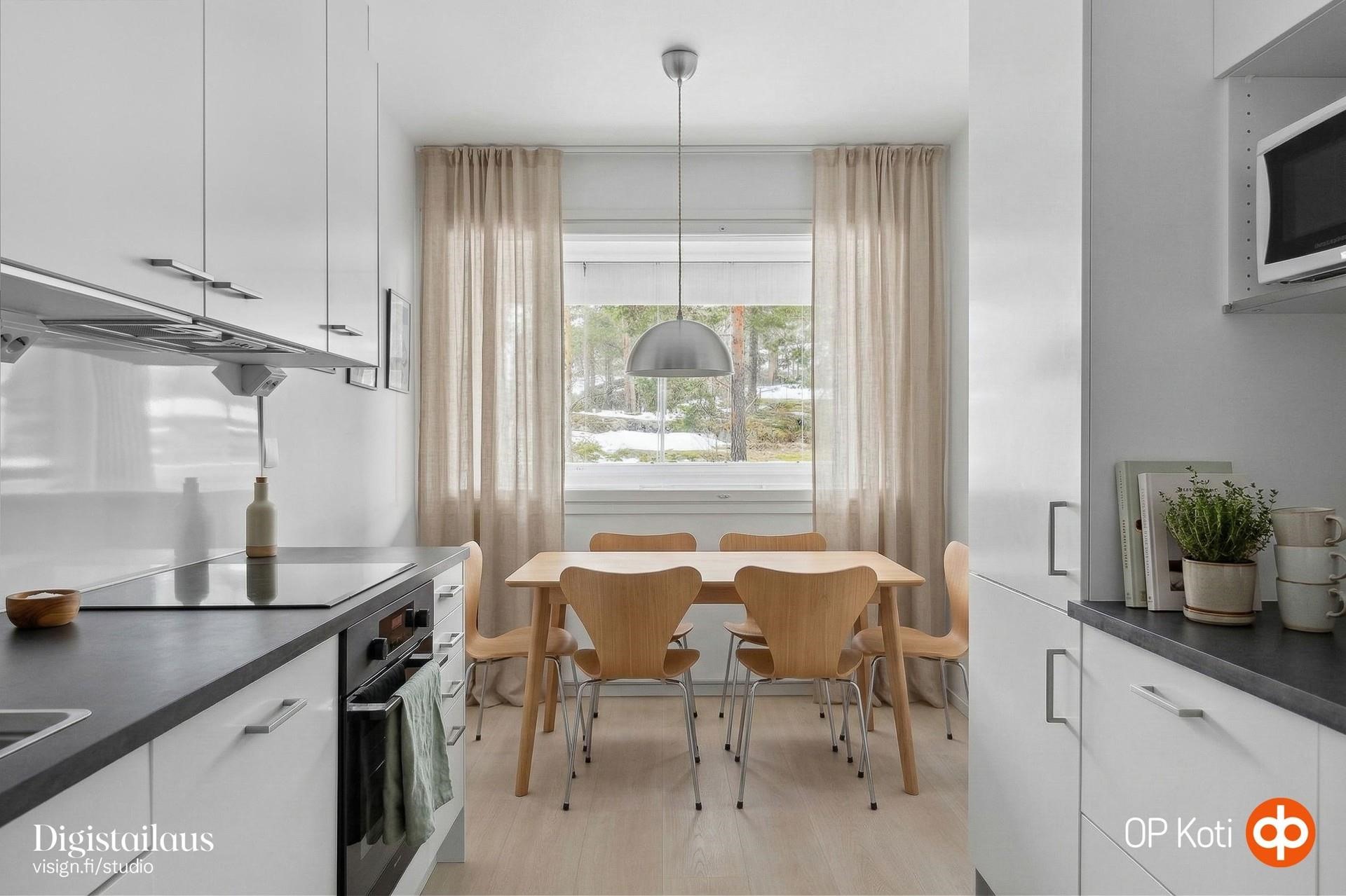 - Jääkaappipakastin, erillisuuni, induktioliesi, liesituuletin (aktiivihiilisuodatin), astianpesukone, kaapistot, kiinteät led valot.