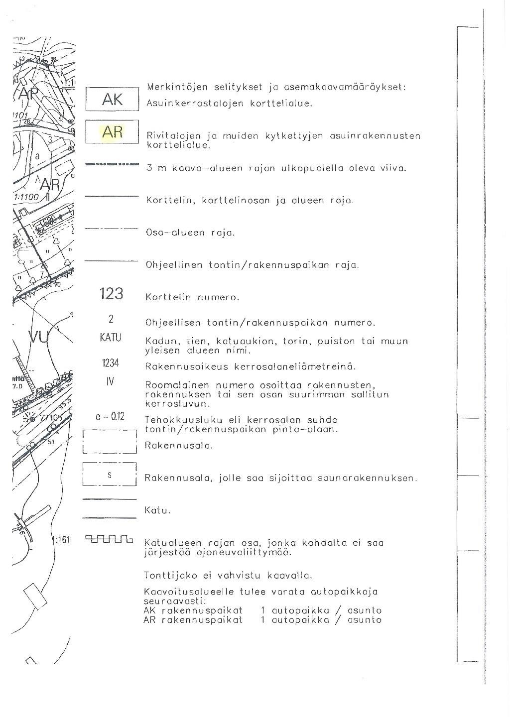 - Asemakaava (ohjeellinen tonttijako). Kaavamerkintä AR, e=0,25. Rivitalojen ja muiden kytkettyjen asuinrakennusten korttelialue. Janakkalan kunta
