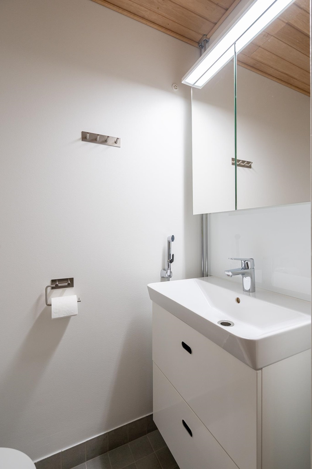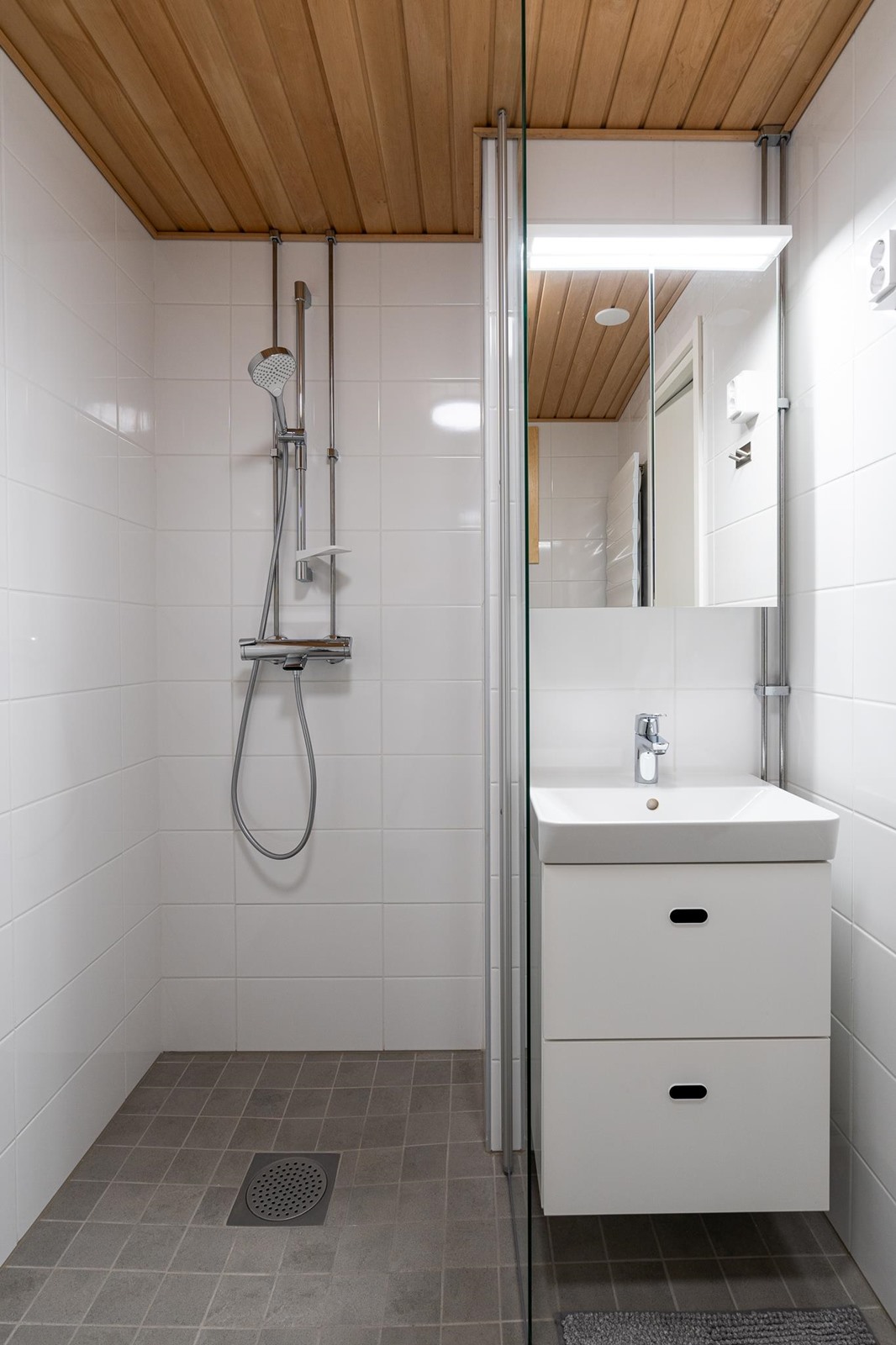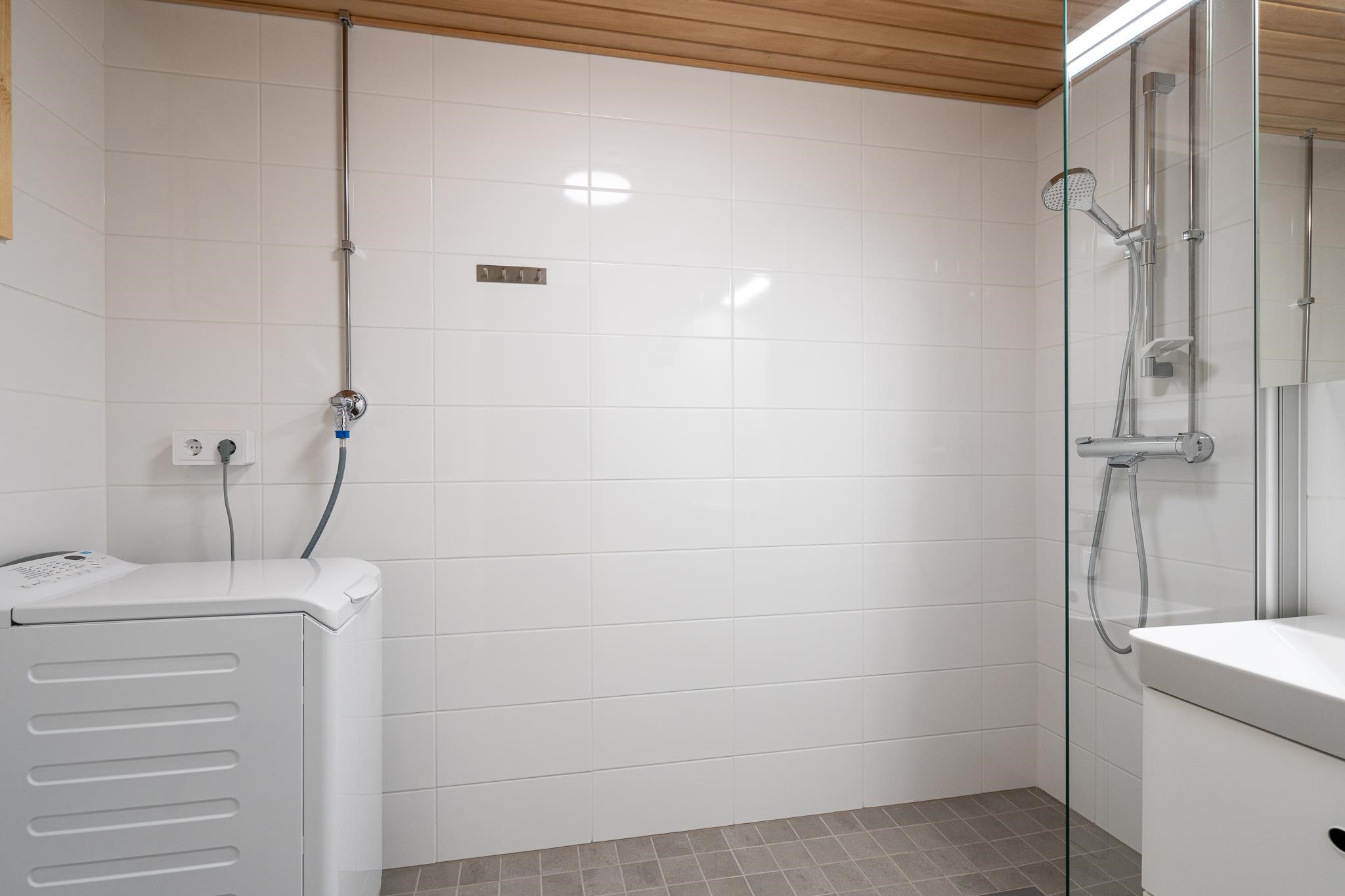 - Kylpyhuone, erillinen wc, suihku, peilikaappi, pesukoneliitäntä.