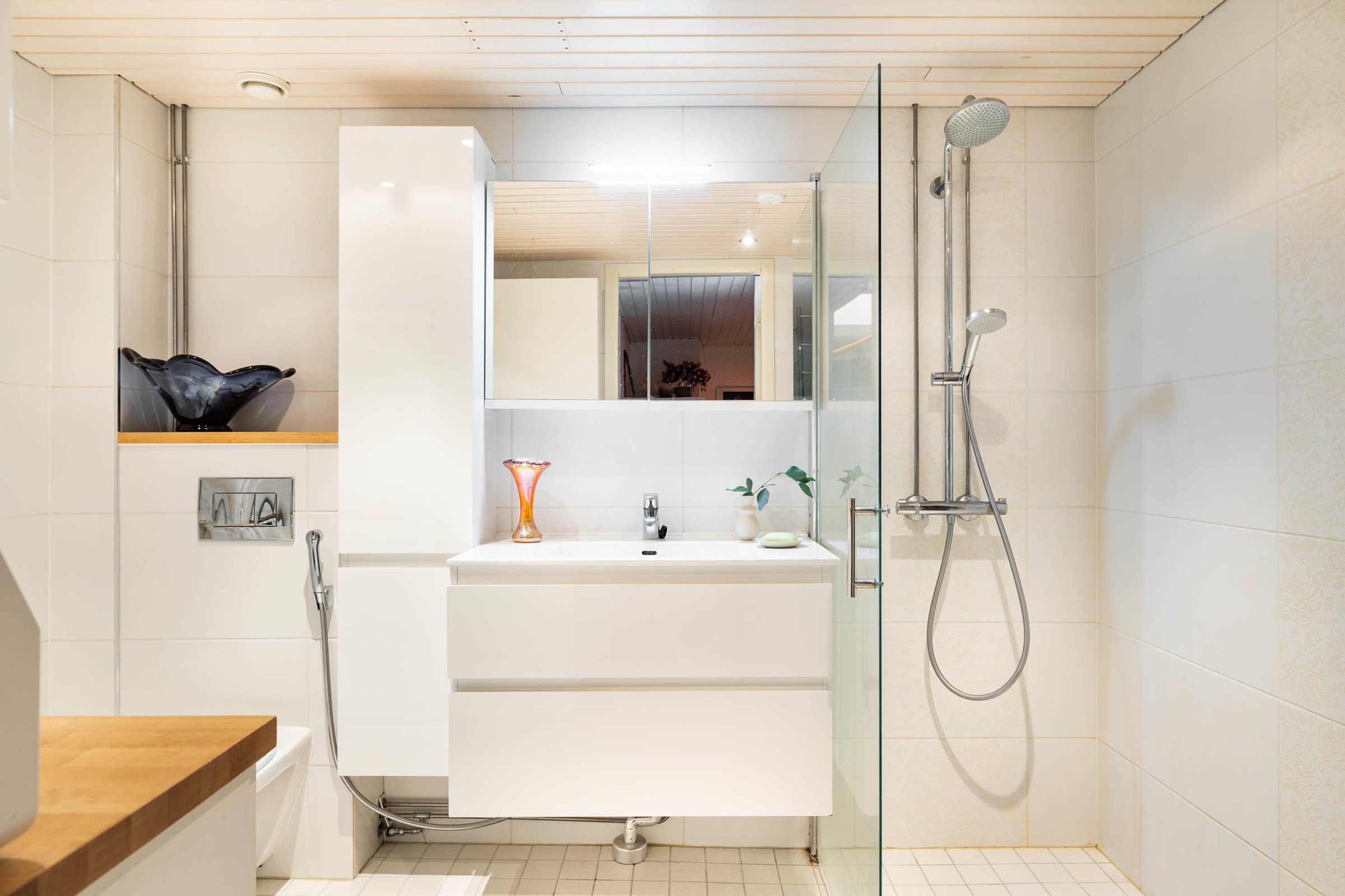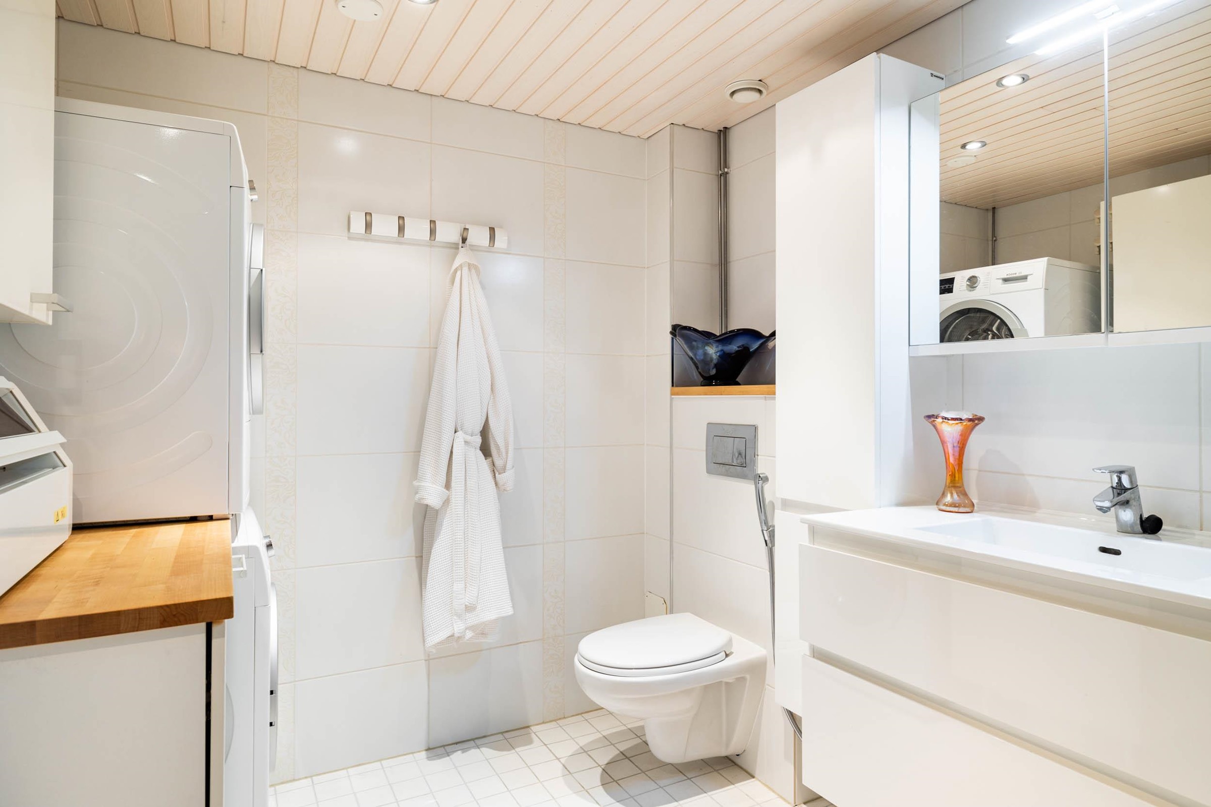 - Sauna, sähkökiuas Pilari Harvia 7 kw, kylpyhuone, erillinen wc yläk, suihku, suihkuseinä, peilit yläk., peilikaappi alak., kaapit, allaskaappi alak. kaapisto/laatikosto, pesukoneliitäntä, lattialämmitys kph, kiinteät valaisimet. Sauna ja kph 2013