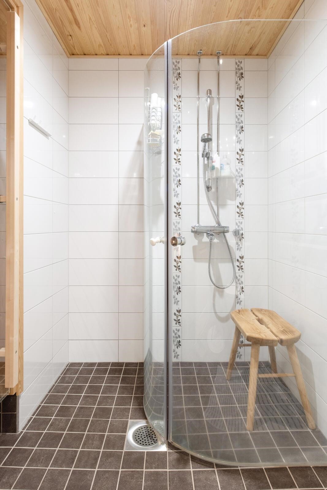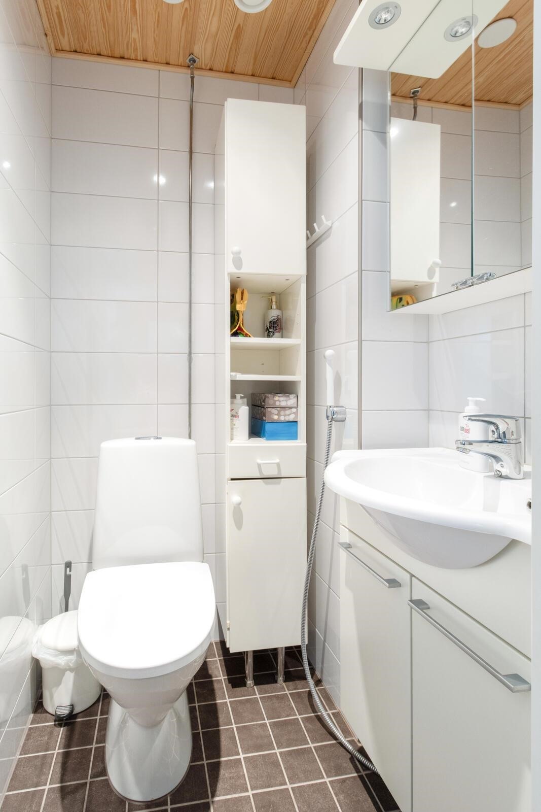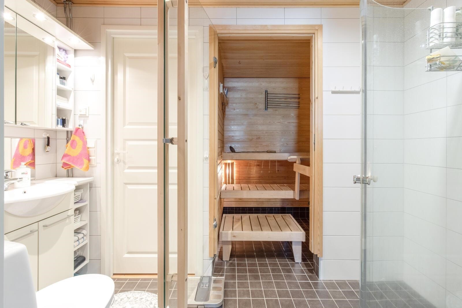 - Sauna, sähkökiuas, kylpyhuone, erillinen wc, suihku, suihkuseinä, peilit, peilikaappi, allaskaappi, pesukoneliitäntä, kiinteät valaisimet. Kylpyhuonekaapisto . Lattialmmitys kylpyhuoneessa,WC;ssä ja kodinhoitohuoneessa.