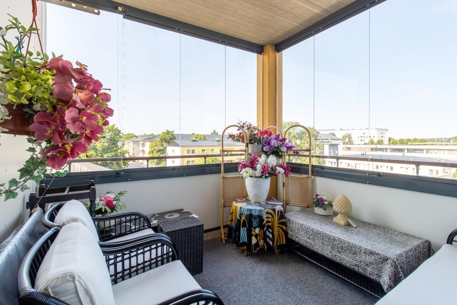 - Tilava ulostyönnetty parveke, joka toimii keshuoneena. Näkymät Haminan kaupungin ylle ja merelle.
