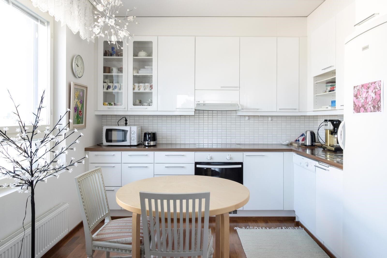 - Jääkaappi, pakastekaappi, liesitaso, induktioliesi, liesikupu, liesituuletin, astianpesukone, kaapistot, kiinteät valaisimet.
