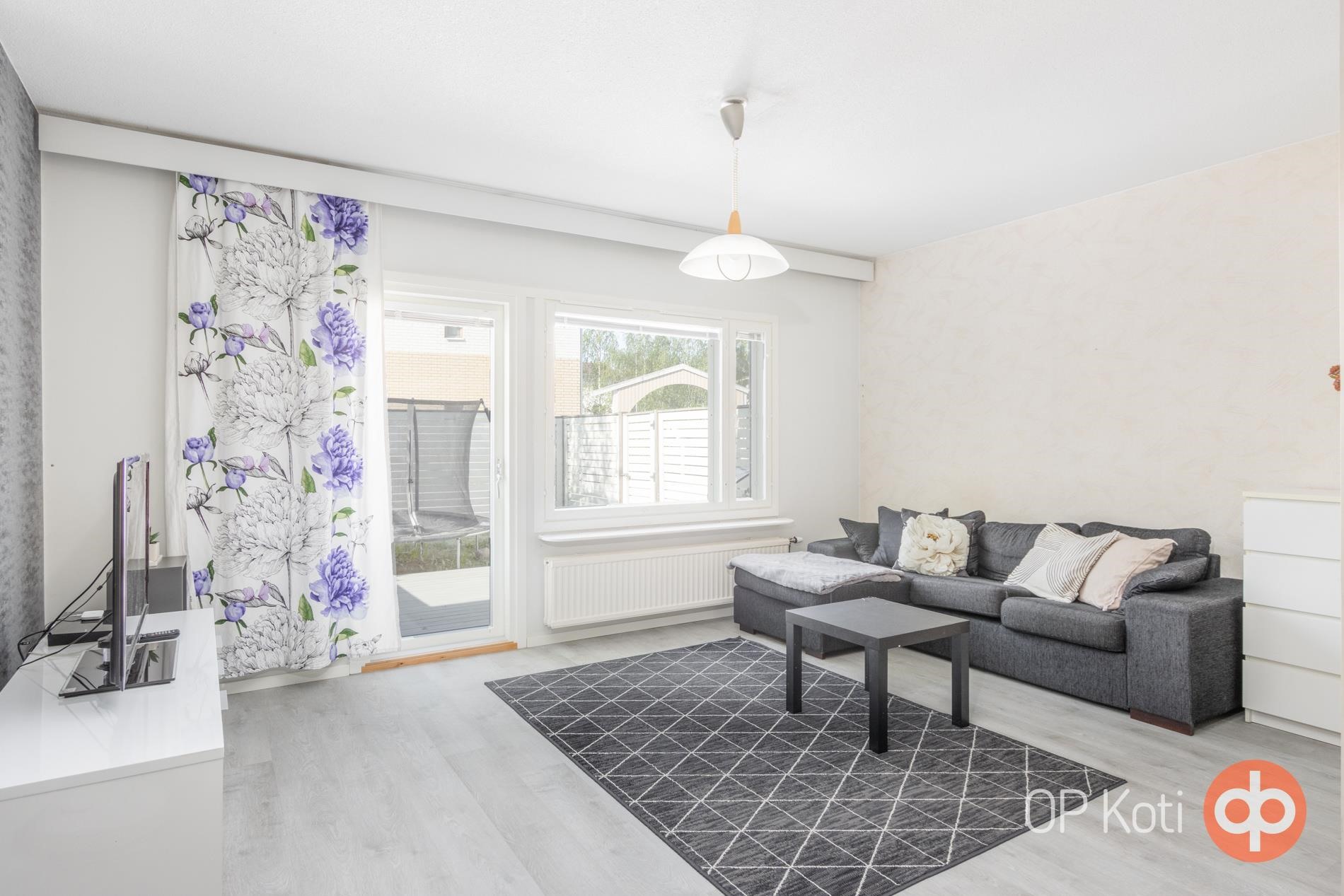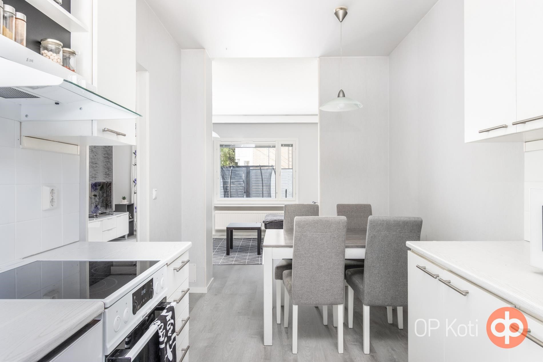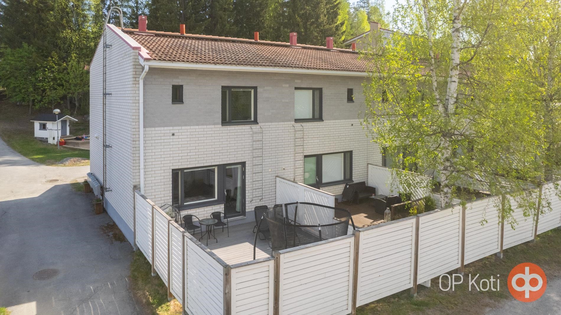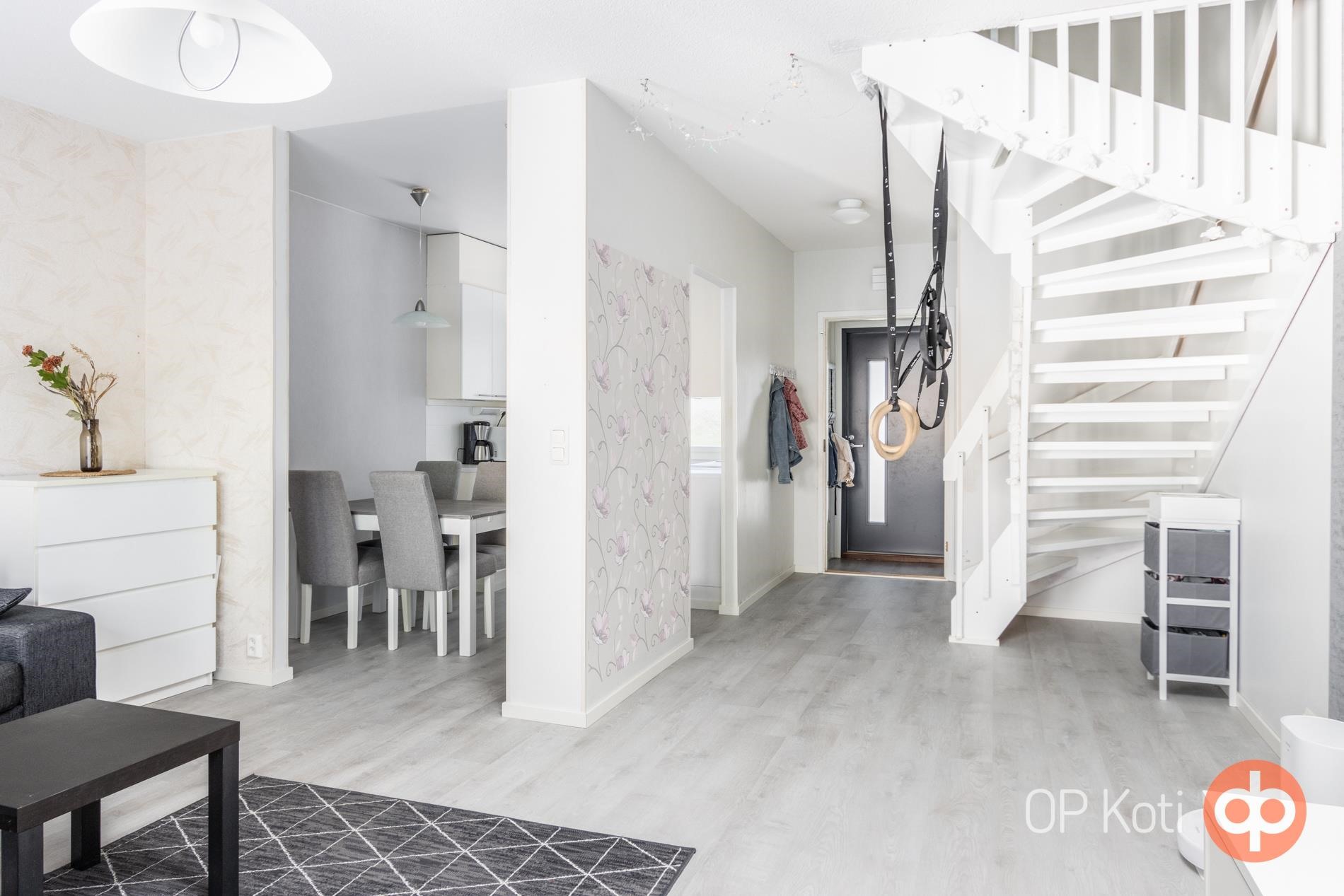 Valoisa päätyhuoneisto tarjoaa perheelle asumisen kahdessa kerroksessa. Alakerrassa sijaitsevat keittiö, olohuone ja erillinen wc. Olohuoneesta pääsee suojaisalle ja aurinkoiselle takapihan terassille.