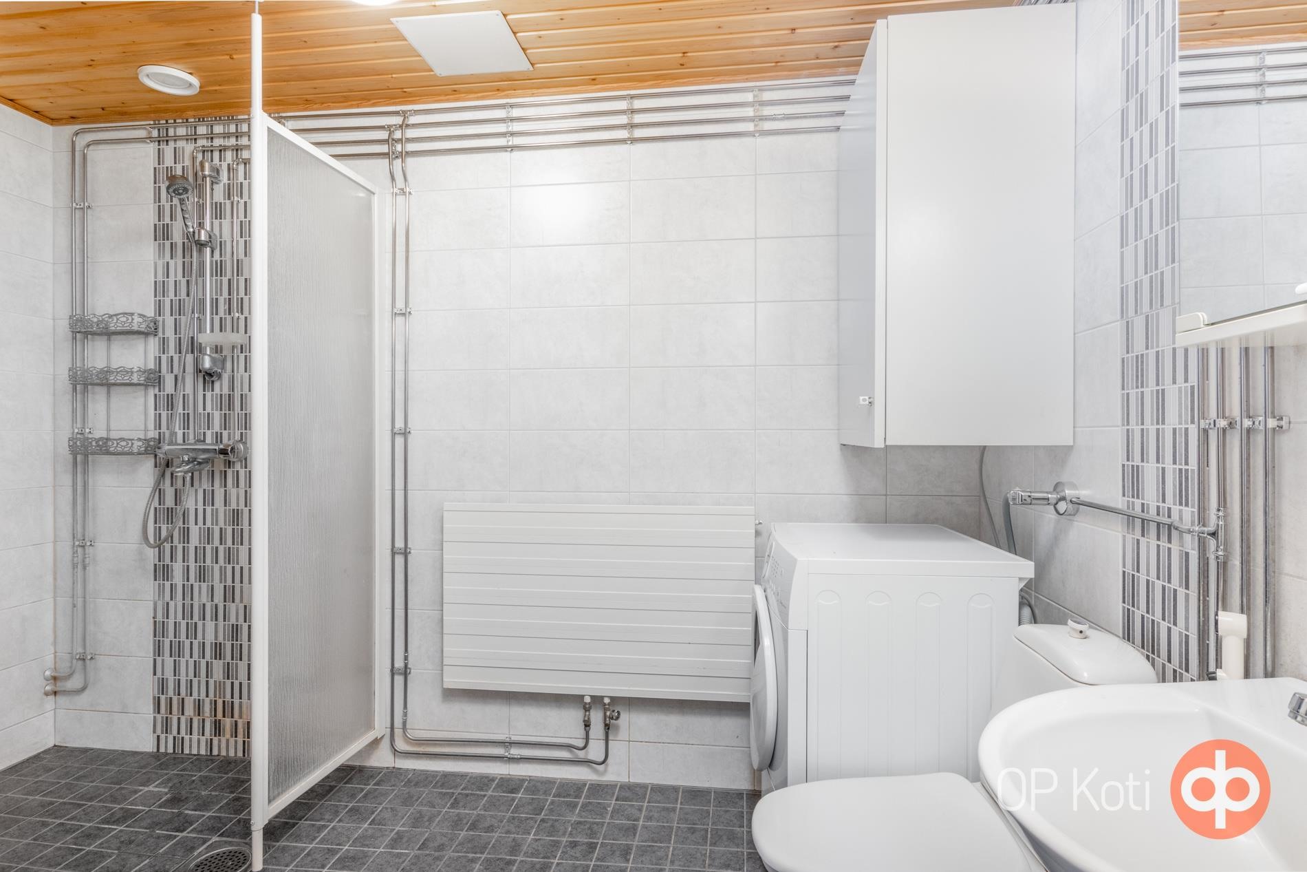 - Sauna, sähkökiuas, kylpyhuone, erillinen wc, suihku, suihkuseinä, peilit, peilikaappi, kaapit, allaskaappi, pesukoneliitäntä, lattialämmitys, kiinteät valaisimet.