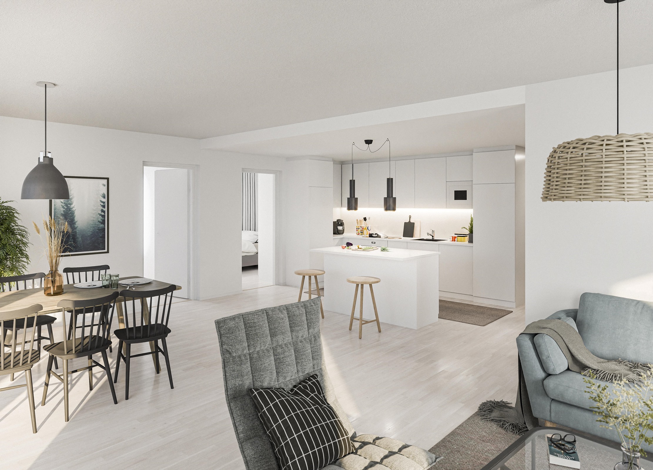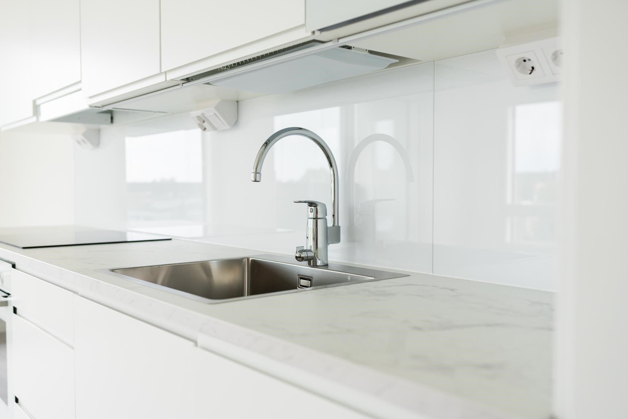- Jääkaappipakastin, erillisuuni, liesitaso, liesituuletin, mikroaaltouuni, astianpesukone, kaapistot, kiinteät valaisimet. Runko melamiinipintainen, ovet valkoisia kalusteovia kalustetoimittajan suunnitelman mukaan, tasot ja välitila laminaattia