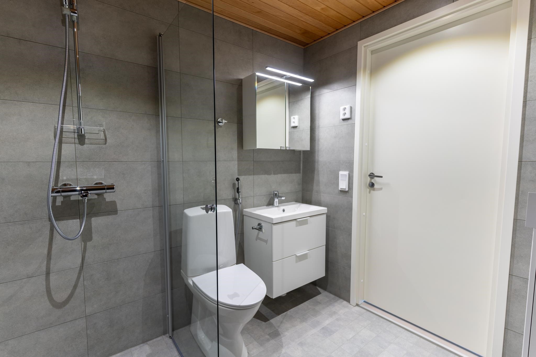 - Kylpyhuone, suihku, suihkuseinä, pesukoneliitäntä, lattialämmitys, kiinteät valaisimet. Kalusteet kalustetoimittajan suunnitelman mukaan.