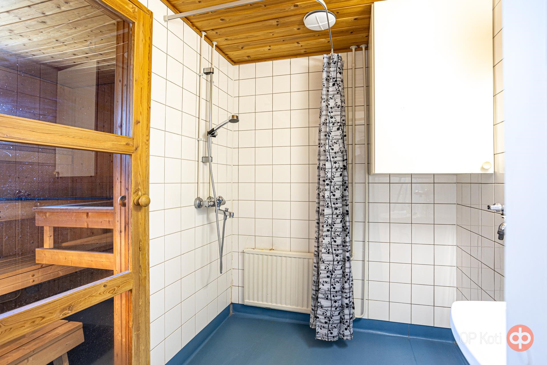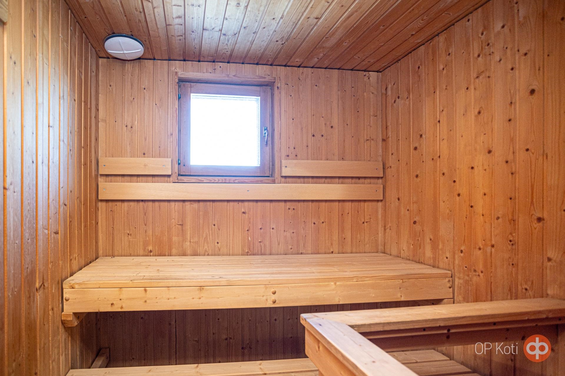 - Sauna, sähkökiuas, kylpyhuone, erillinen wc, suihku, peilikaappi, pesukoneliitäntä, kiinteät valaisimet.