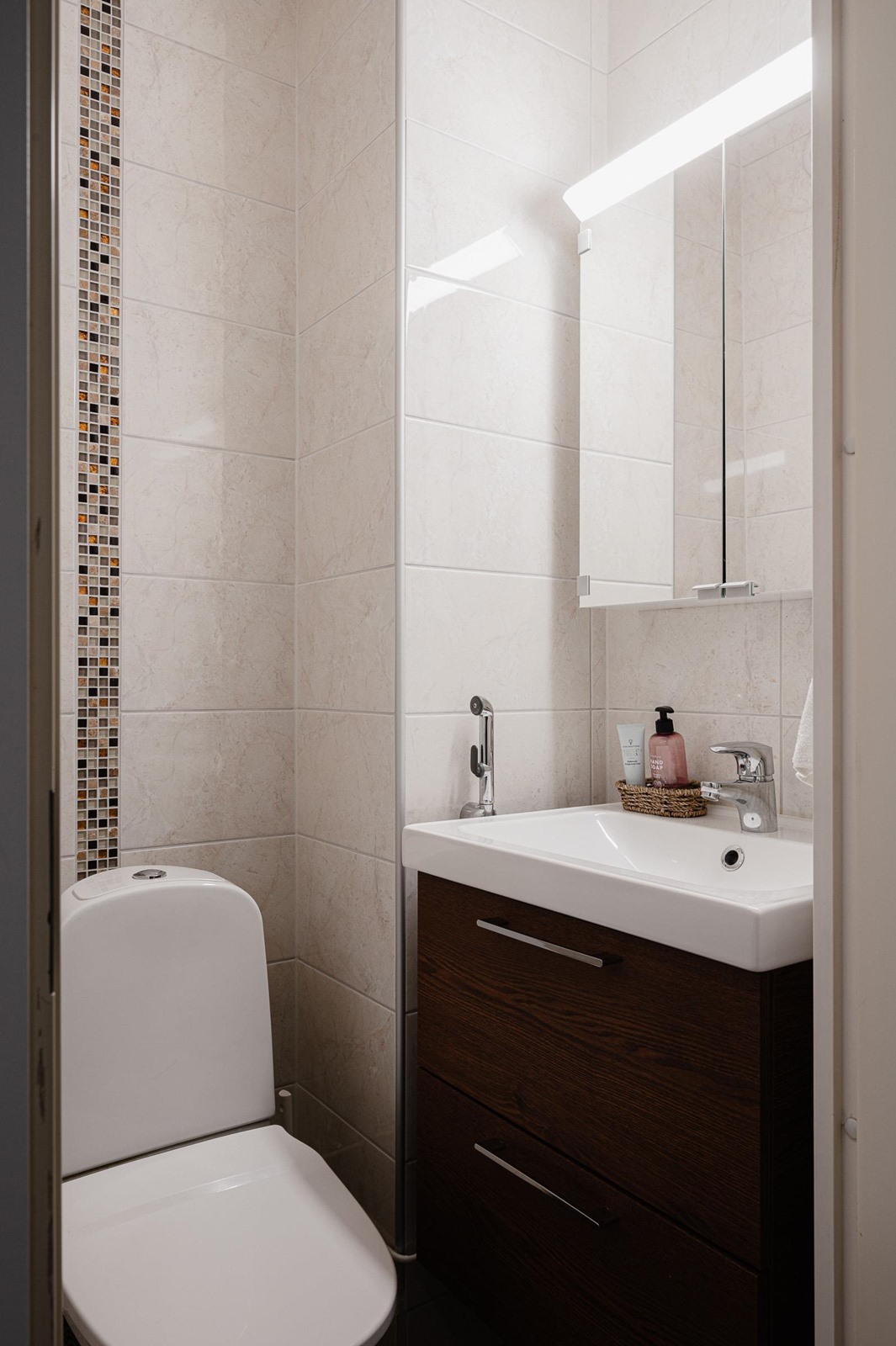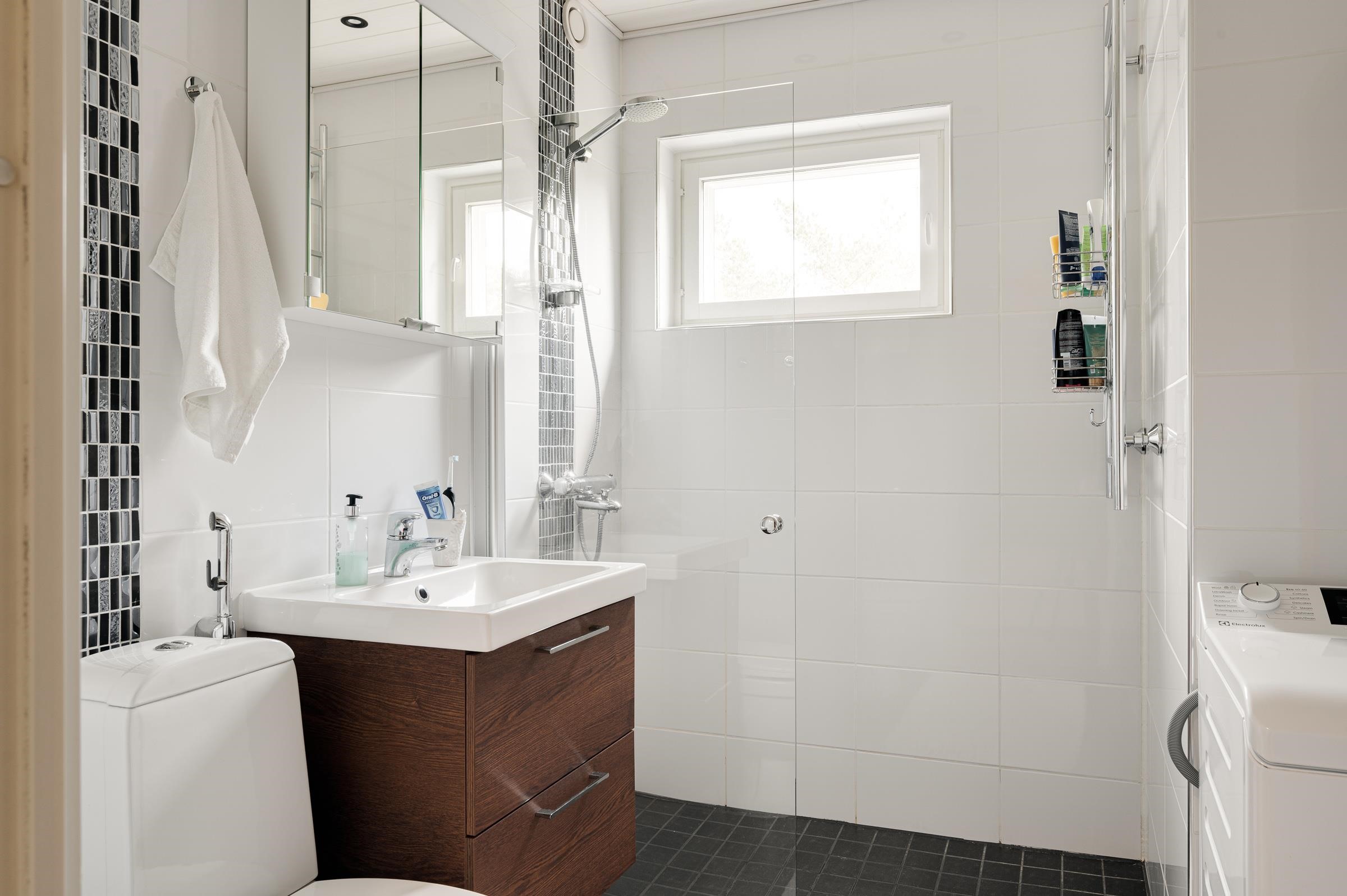 - Sauna sähkökiuas, lasiovi, lasiseinä, lauteet, kylpyhuone suihku, suihkuseinä, pesukoneliitäntä, suihkuseinä, peilikaappi, allaskaappi, lattialämmitys, kiinteät valaisimet, Pyyhekuivain. Erillinen wc, jossa peilikaappi, lavuaari, allaskaappi ja wc-istuin