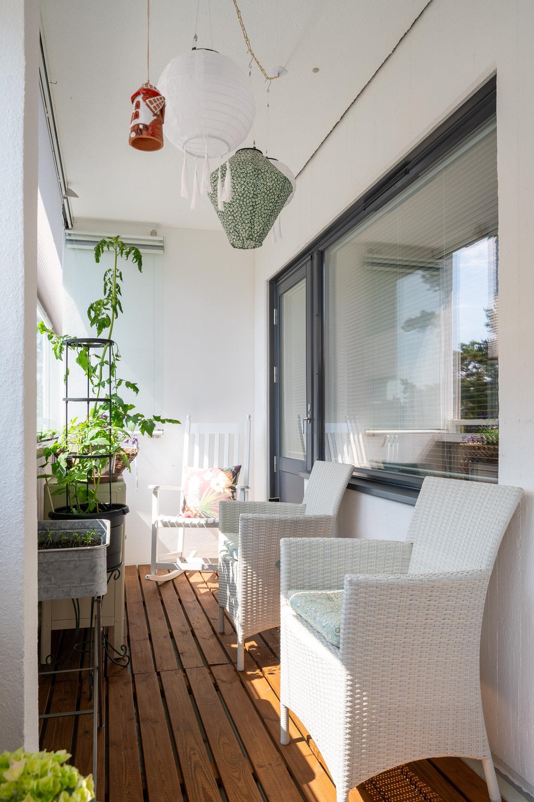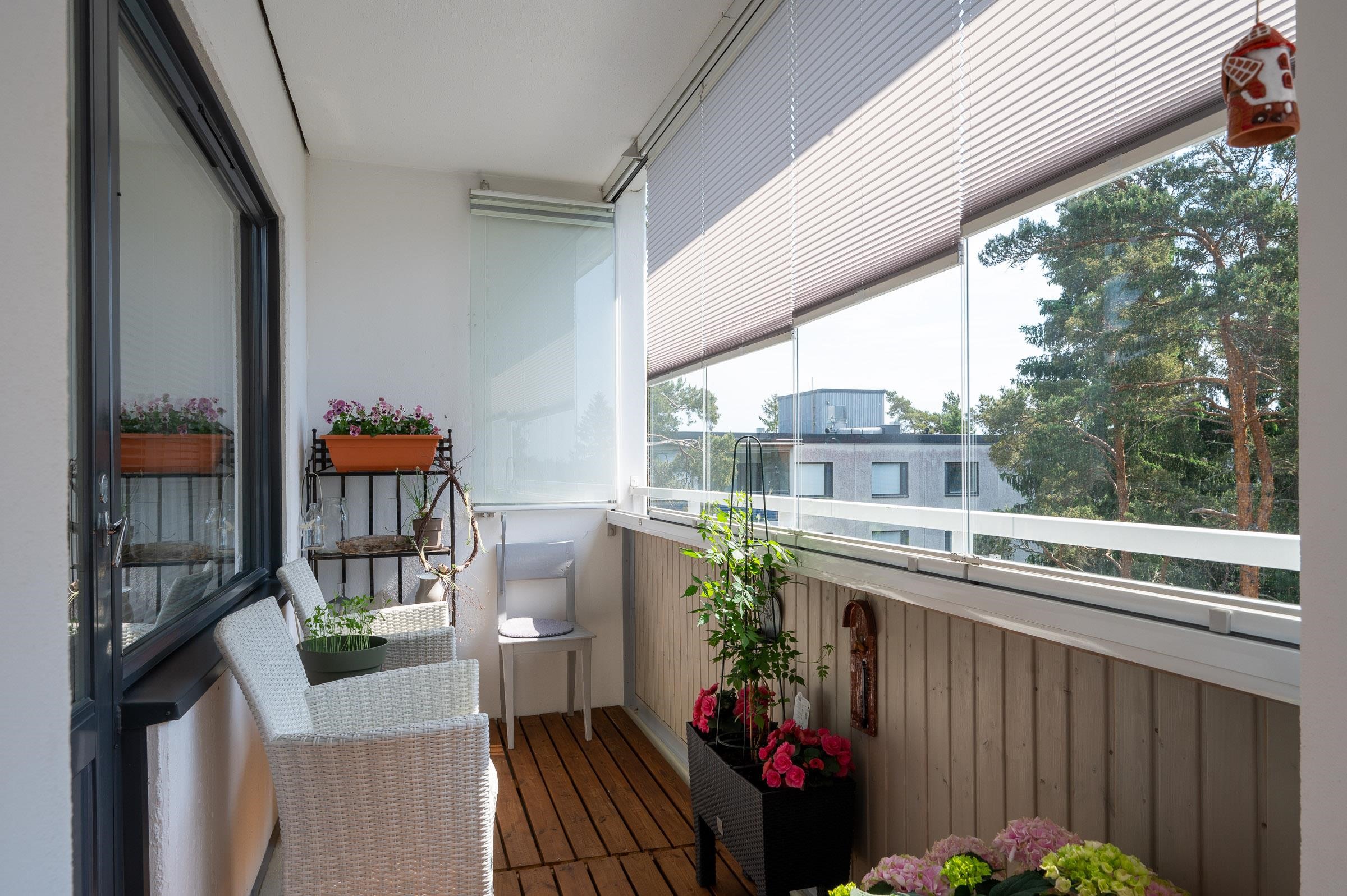 - Lasitettu parveke, josta näkymät Rastaanpolun ja Kapponpuiston ylle.