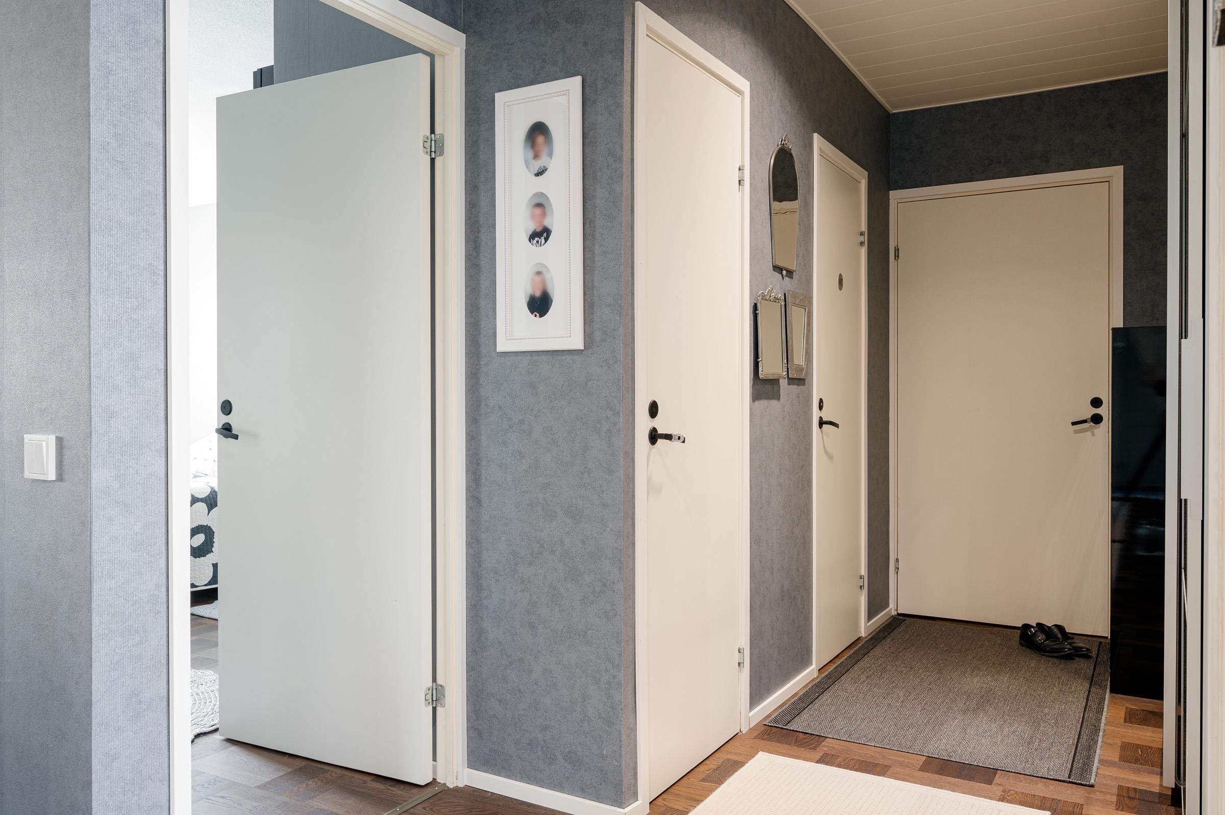 Keittiö: Lattia laatoitettu, seinät tapetoitu ja maalattu, välitila levytetty. Olohuone: Lattia parkettia, seinät tapetoitu ja maalattu. Makuuhuone 1: Lattia parkettia, seinät tapetoitu ja maalattu. Makuuhuone 2: Lattia parkettia, seinät tapetoitu ja maalattu. Makuuhuone 3: Lattia parkettia, seinät tapetoitu ja maalattu. Sauna: Lattia laatoitettu, seinät puupaneelia. Kylpyhuone: Lattia ja seinät laatoitettu. Eteinen: Lattia parkettia, seinät tapetoitu ja maalattu. Wc: Lattia ja seinät laatoitettu.