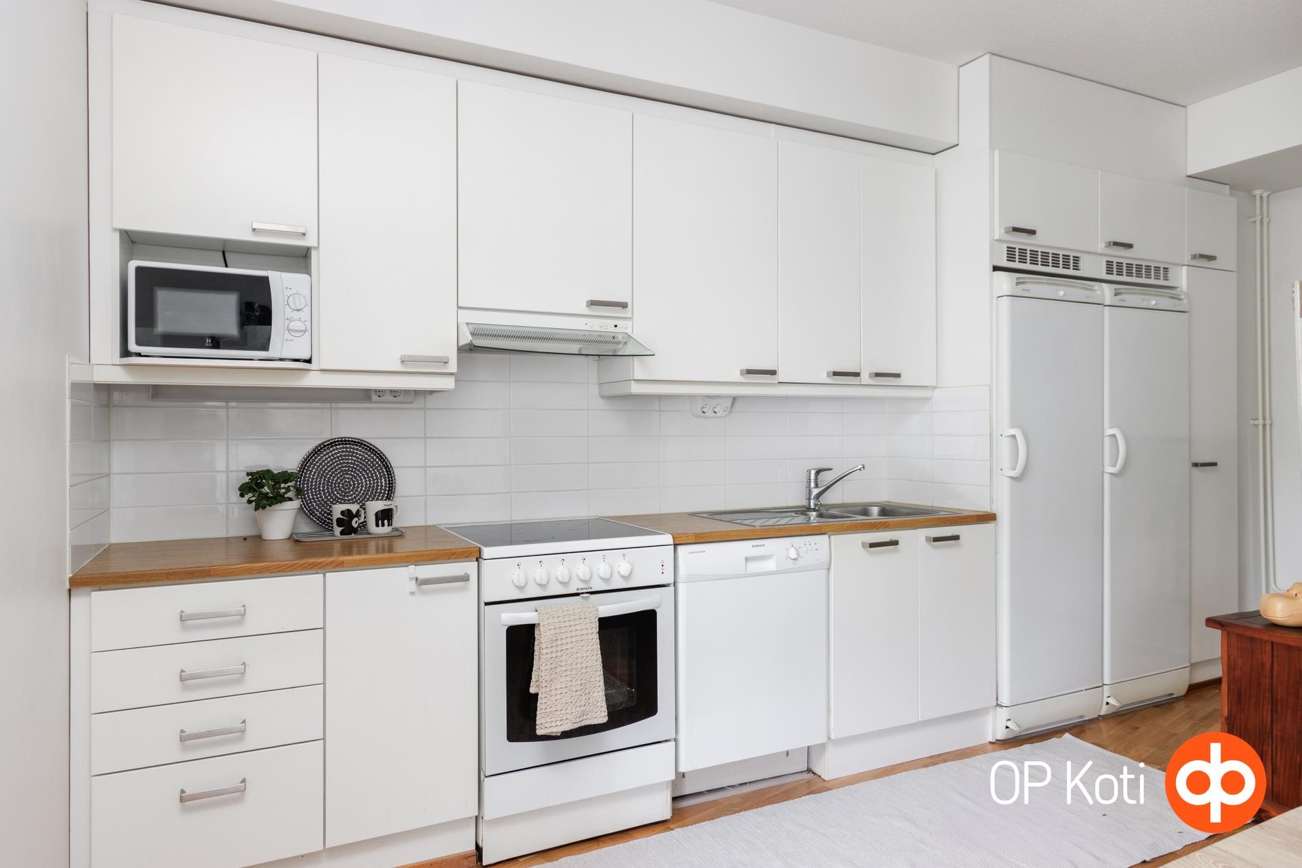 - Jääkaappi, pakastekaappi, keraaminen liesi, liesituuletin, mikroaaltouuni, kaapistot, kiinteät valaisimet.
