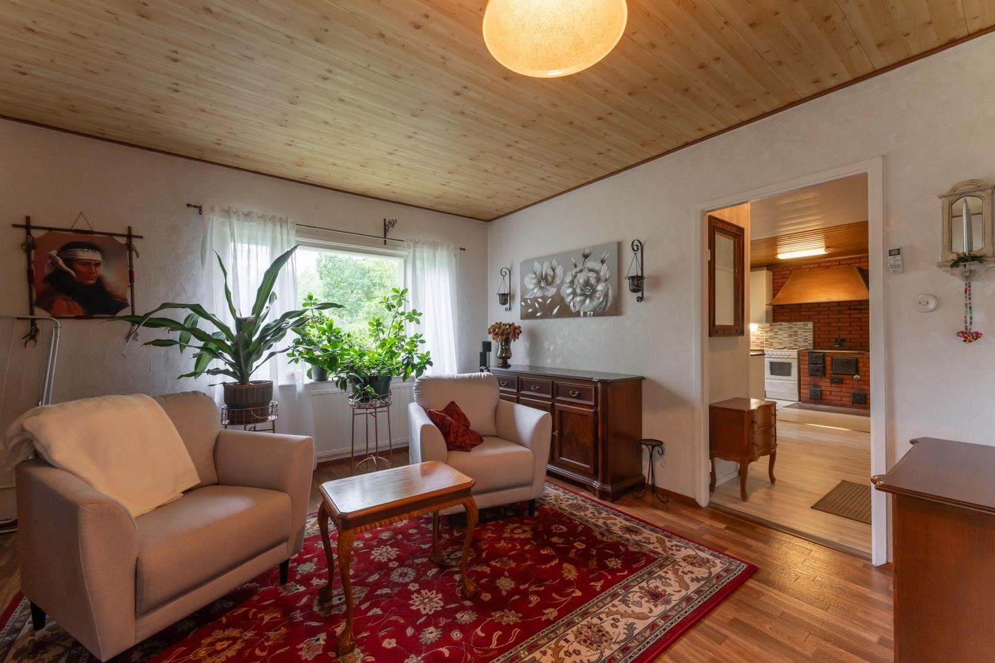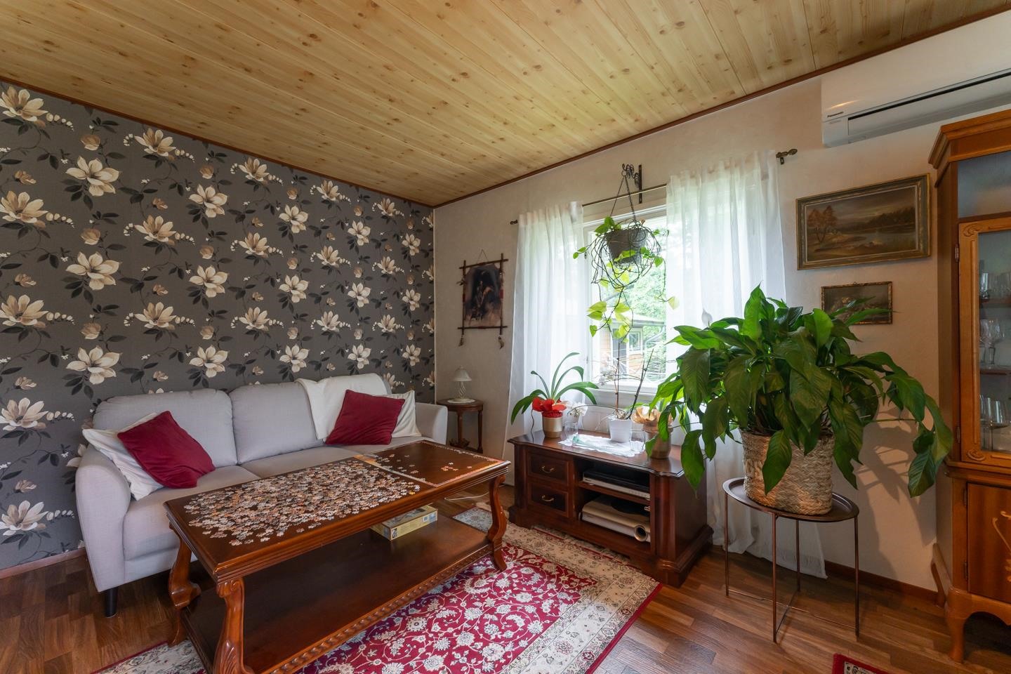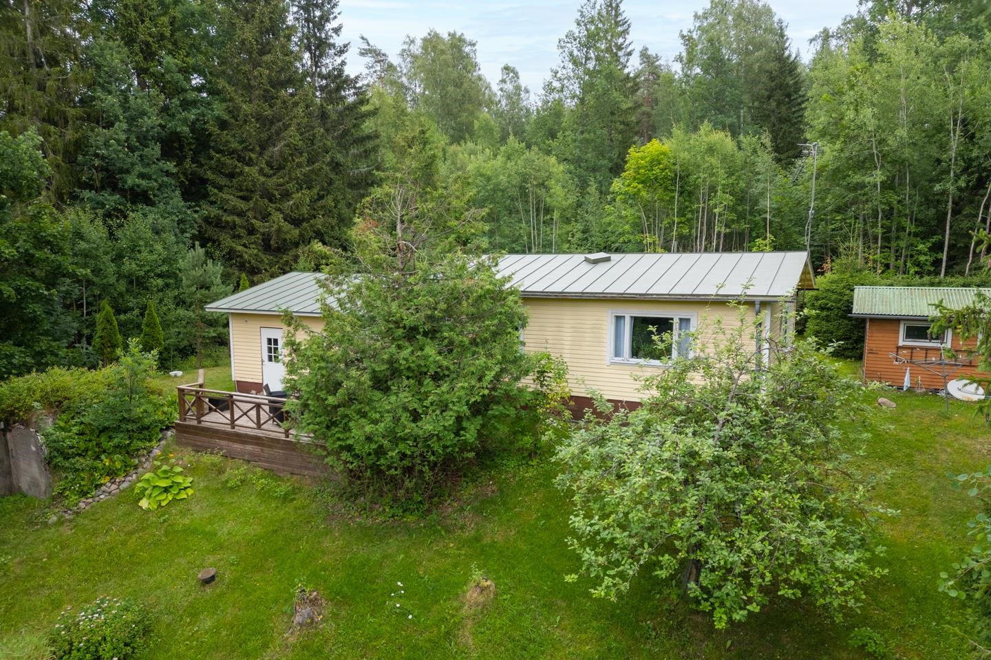 Tämä vuonna 1967 rakennettu talo kätkee sisäänsä 60 m² asuintilat ja 34 m² saunatuvan ja varaston, yhteensä 94 m², tarjoten kaksi huonetta, keittiön, saunan ja pesutilat sekä rauhallisen saunatuvan. Keittiössä on jenkkikaappi ja sähköliesi, ja se tarjoaa tilan niin ruoanlaitolle kuin perheen yhteisille hetkille. Laajennettu saunatupa kutsuu rentoutumaan ja nauttimaan kodikkaasta lämmöstä, jonka puukiuas ja puuhella tarjoavat.