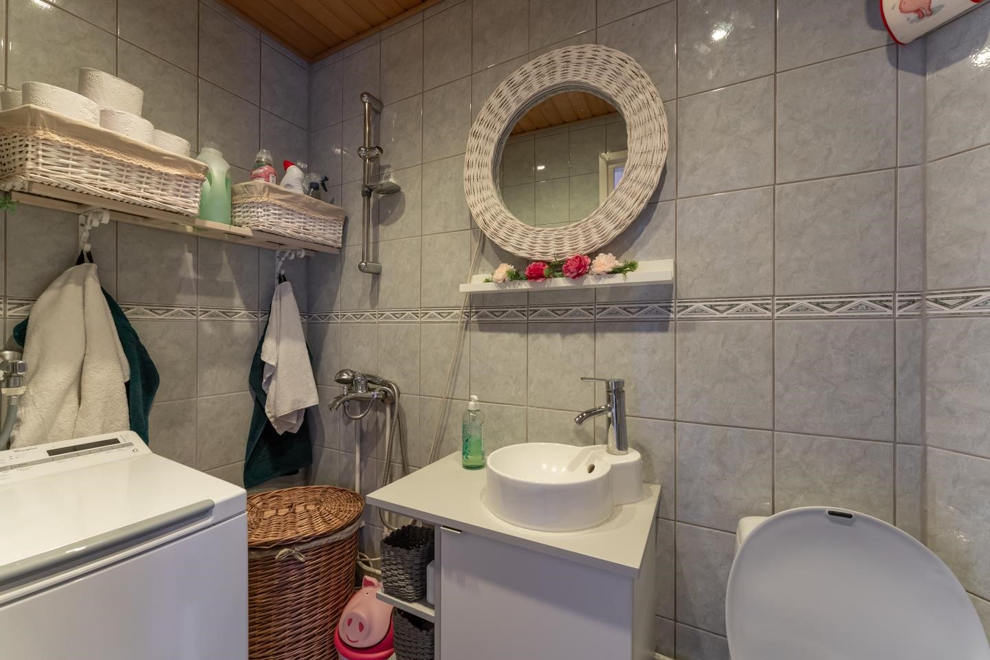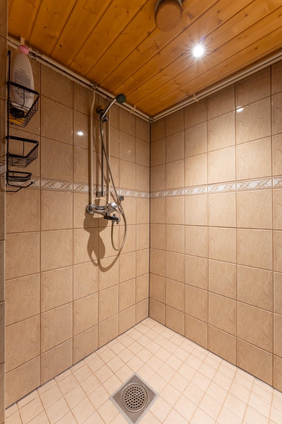 - Saunassa puukiuas. Pesuhuoneessa suihku. Pienessä kylpyhuoneessa suihku, peilit, allaskaappi, pesukoneliitäntä, lattialämmitys, kiinteät valaisimet. Kylpyhuone uusittu 2010