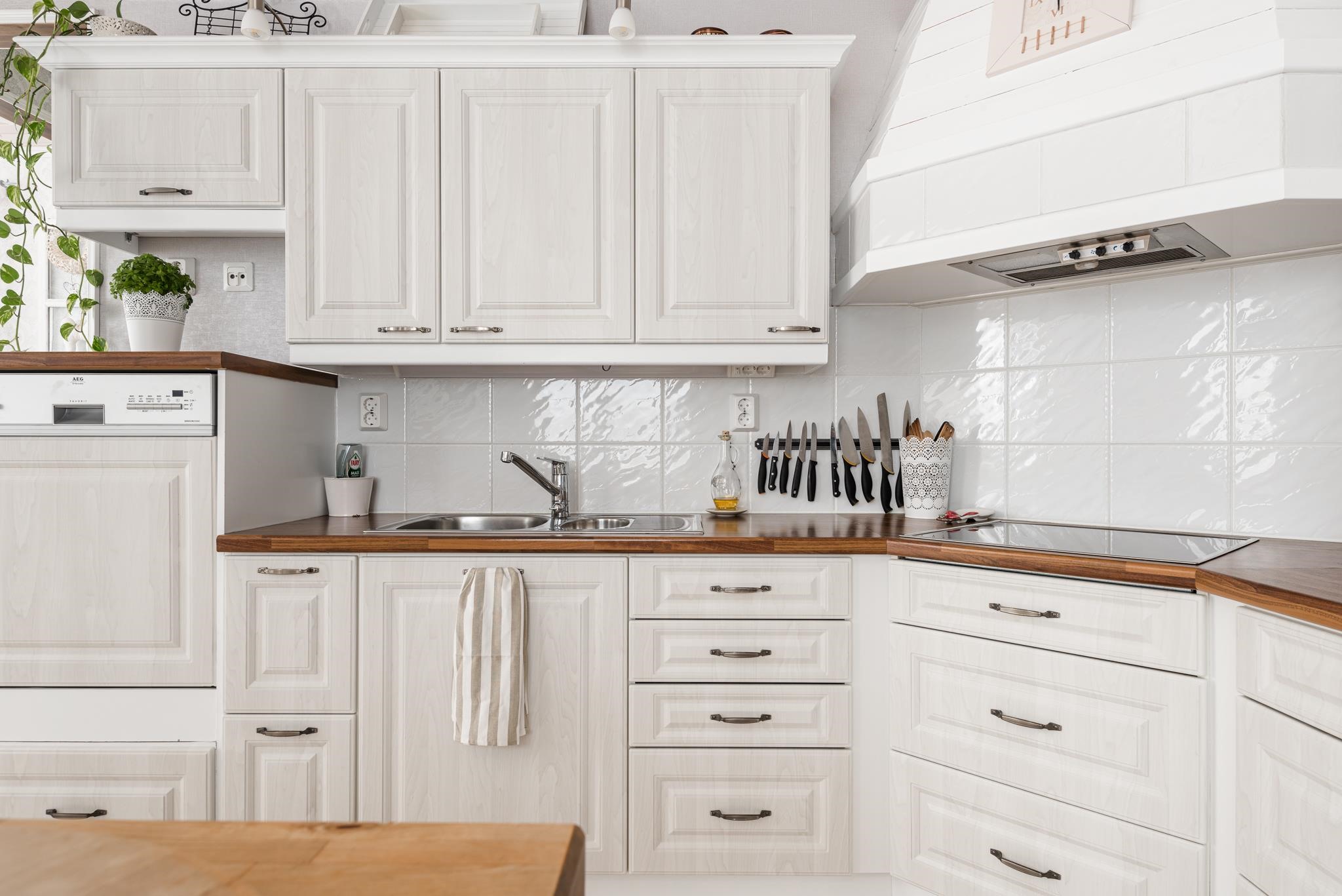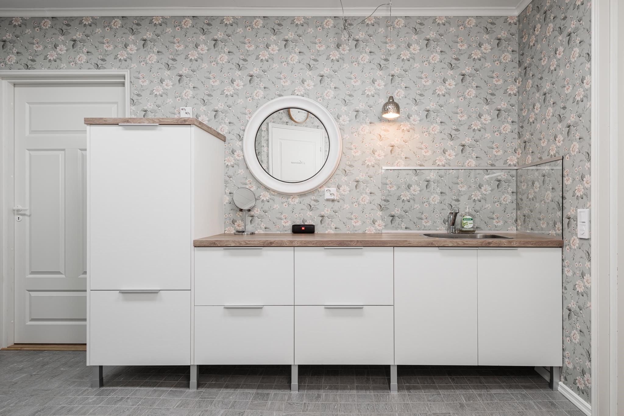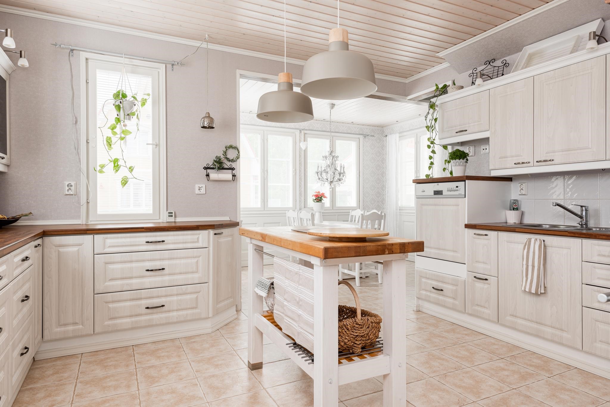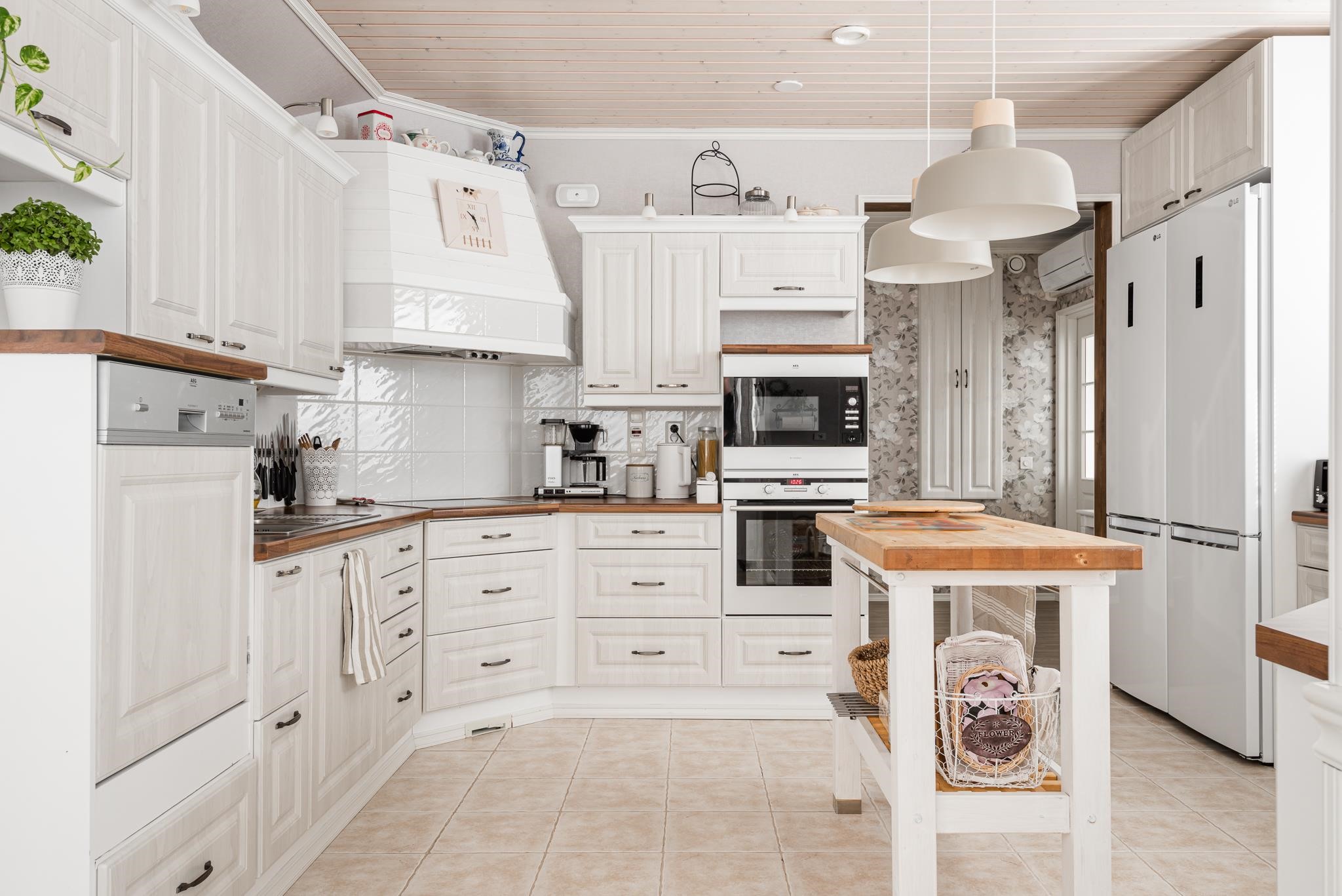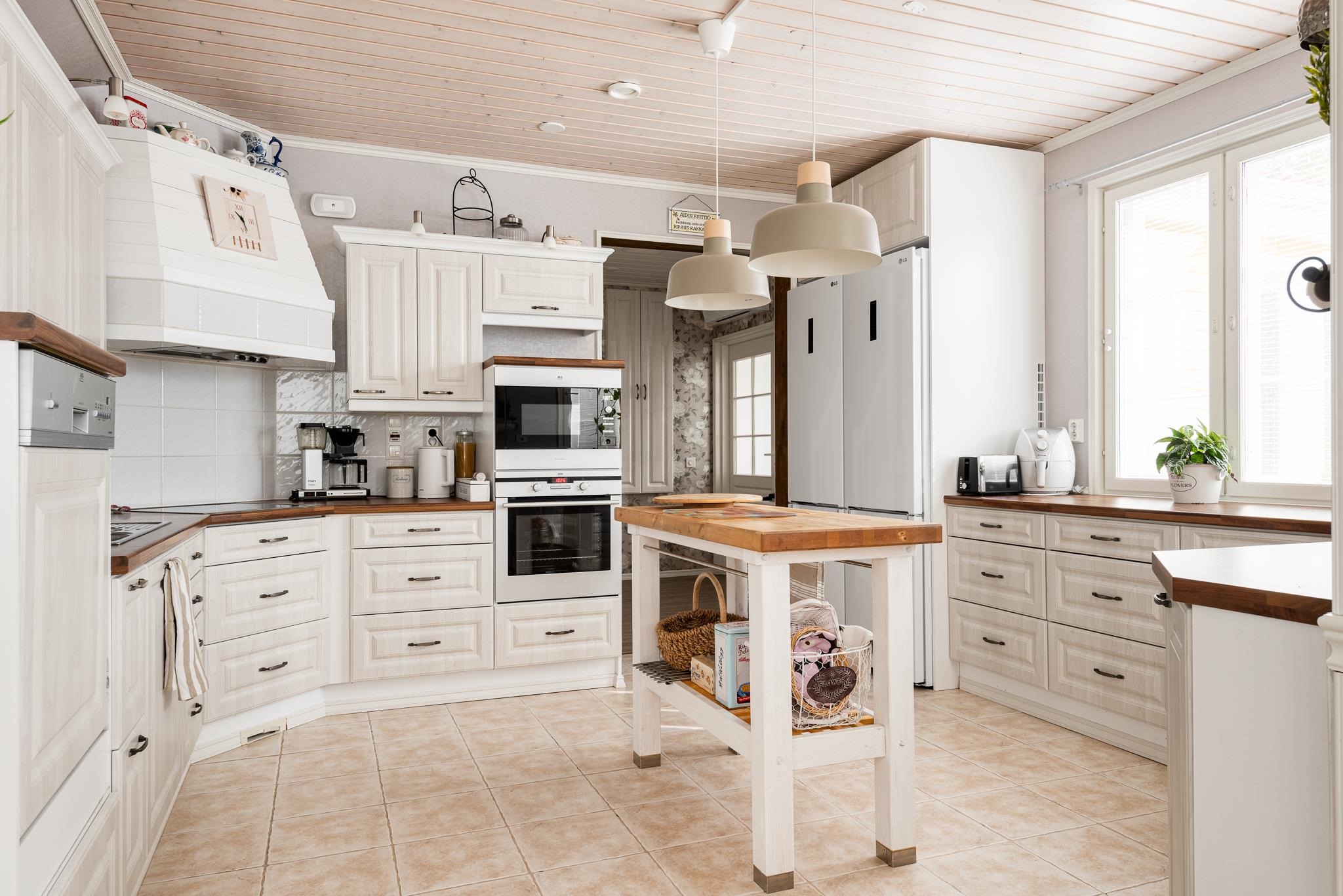 - Jääkaappipakastin, erillisuuni, liesitaso, induktioliesi, liesikupu, liesituuletin, astianpesukone, kaapistot, irralliset saarekkeet, kiinteät valaisimet, pöytätasojen materiaali Laminaatti.