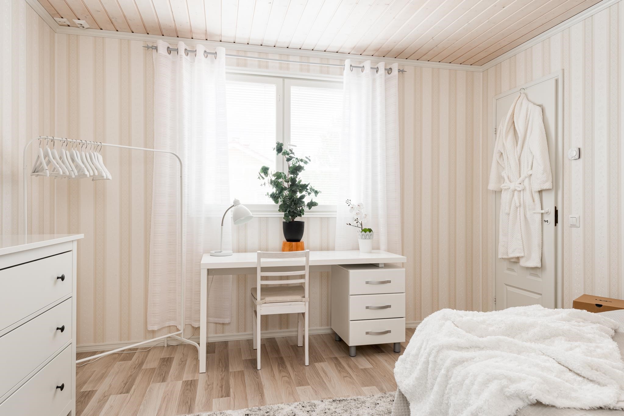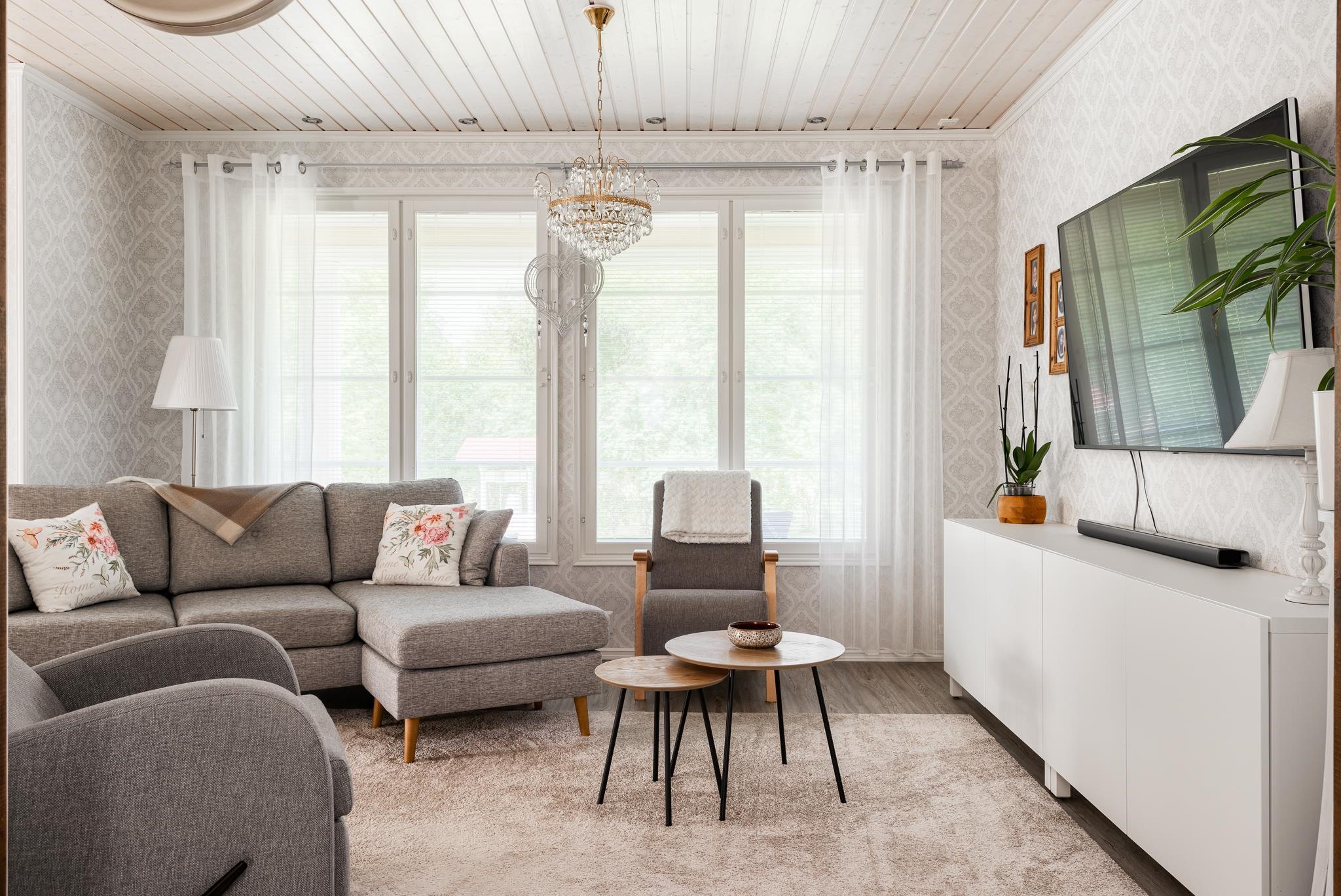 Keittiö: Laatta, tapetti, paneeli. Olohuone: Vinyyli, tapetti, paneeli. Makuuhuone 1: Laminaatti, tapetti, paneeli. Makuuhuone 2: Laminaatti, tapetti, paneeli. Makuuhuone 3: Laminaatti, tapetti, paneeli. Kodinhoitohuone: Laatta, tapetti, paneeli. Sauna: Laatta, paneeli. Kylpyhuone: Laatta, paneeli. Eteinen: Laatta, tapetti, paneeli. Wc: Laatta, tapetti, paneeli. Ruokailutila/erkkeri: Laatta, tapetti, paneeli. Terassi ja portaat: Komposiitti.