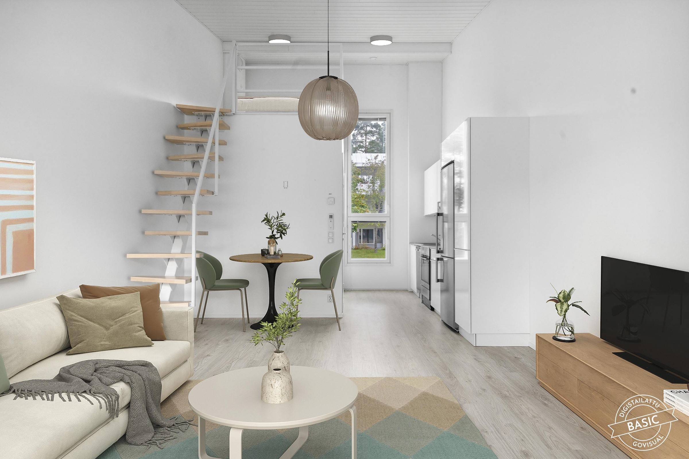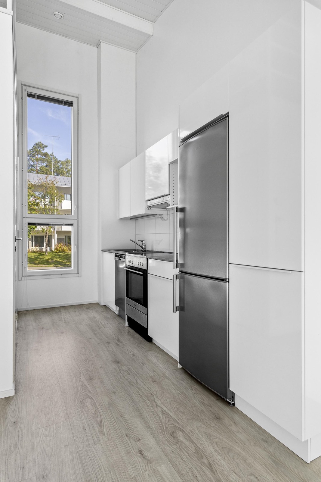 - Jääkaappipakastin, keraaminen liesi, liesituuletin, astianpesukone, kaapistot, kiinteät valaisimet.