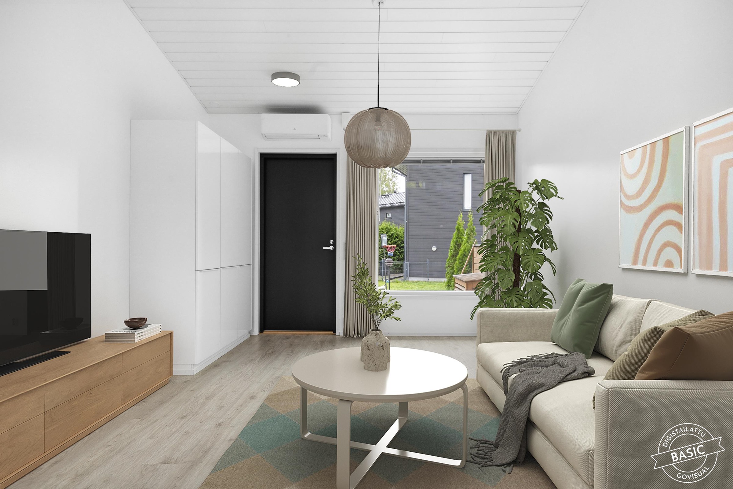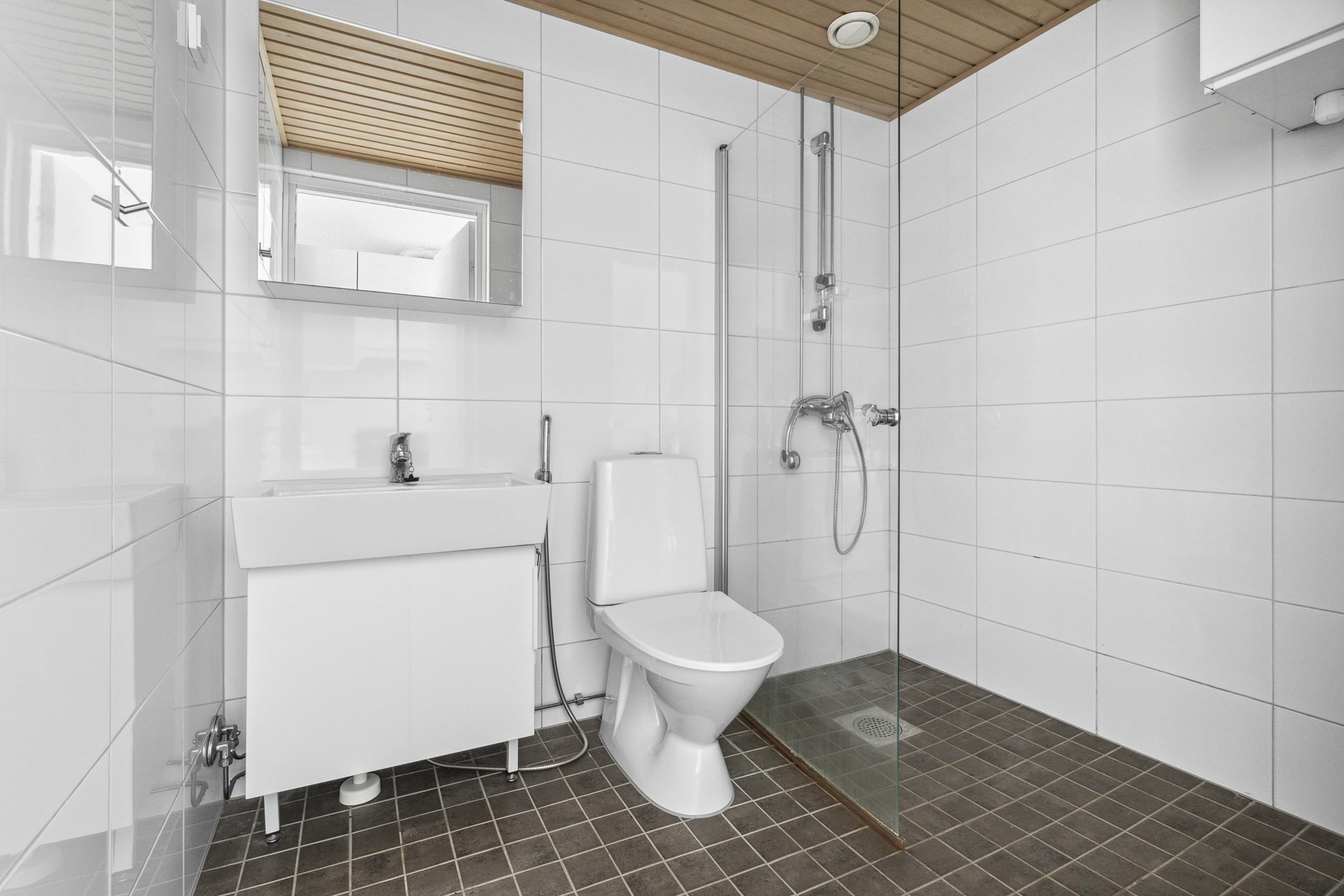 - Kylpyhuone, suihku, suihkuseinä, peilikaappi, allaskaappi, pesukoneliitäntä, lattialämmitys, kiinteät valaisimet.
