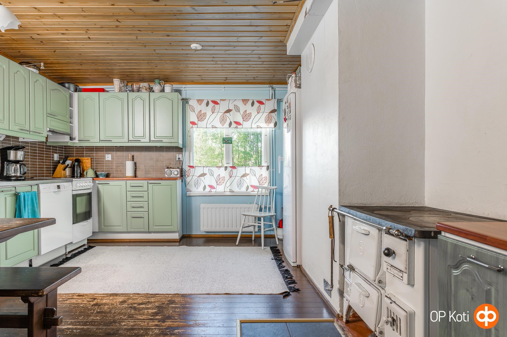 - Jääkaappi, sähköliesi, liesituuletin, astianpesukone. Puuliesi . Keittiökaapistot uusittu n. v. 2009.