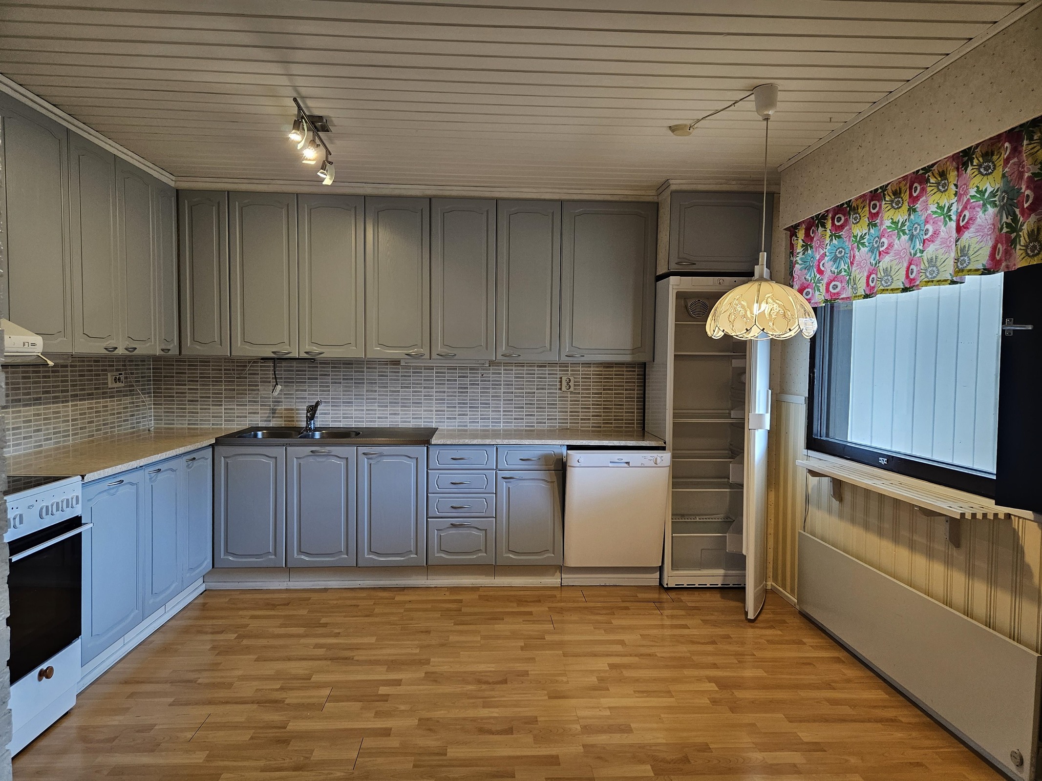 - Jääkaappi, keraaminen liesi, astianpesukone, kaapistot, kiinteät valaisimet, pöytätasojen materiaali laminaatti.