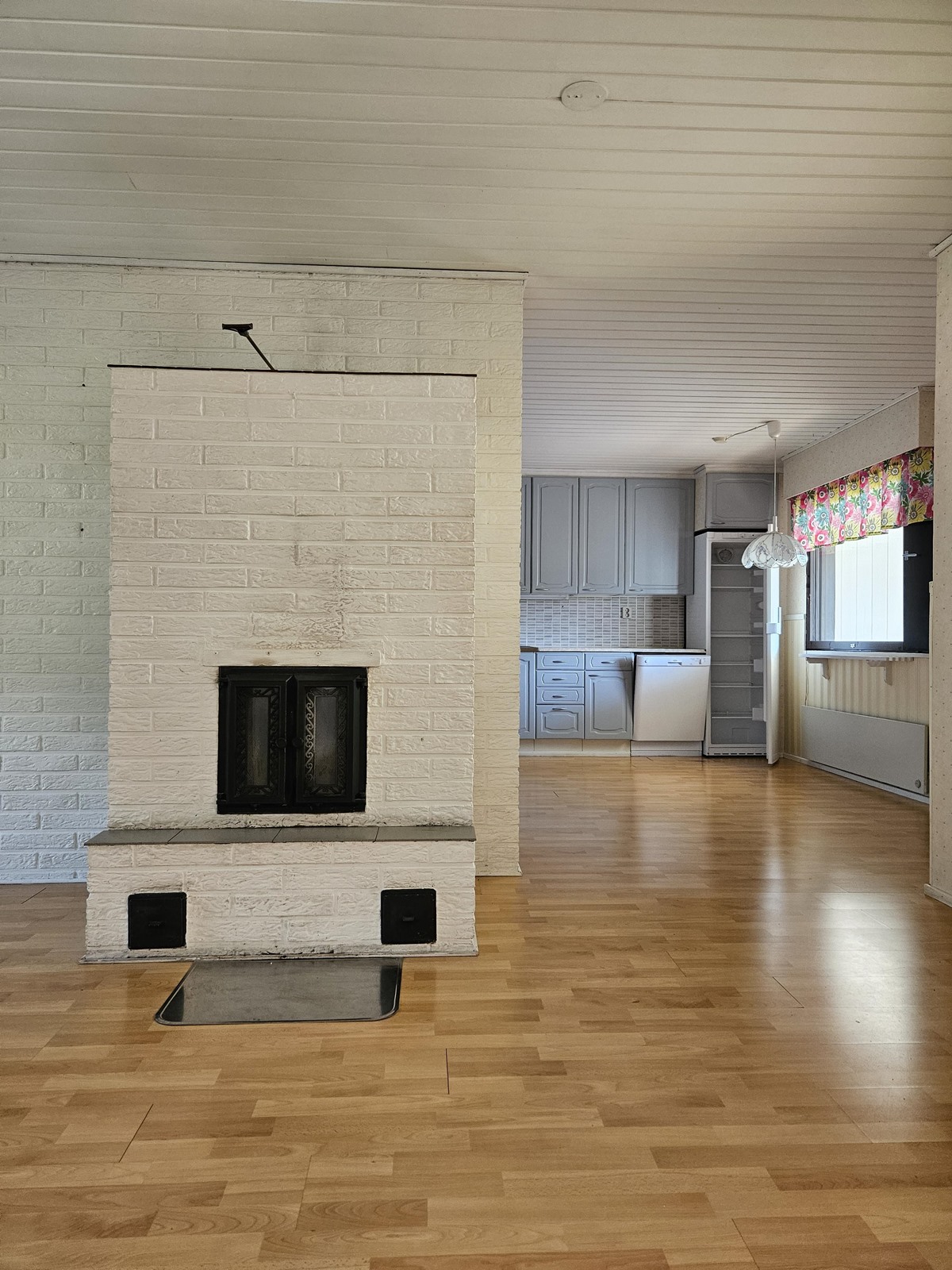 Keittiö: laminaattilattia, seinät tapetti ja puolipaneeli. Olohuone: laminaattilattiat, seinät tapetoitu. Makuuhuone 1: lautalattia, seinät tapetoitu. Makuuhuone 2: lattia muovimattoa, seinät tapetoitu. Makuuhuone 3: lattia muovimattoa, seinät tapetoitu. Sauna: lattia laatoitettu, seinät paneloitu. Kylpyhuone: laatoitettu. Eteinen: laminaattilattia, seinät tapetoitu. Wc: laatoitettu. takkatila: laminaattilattia, seinät tapetoitu.