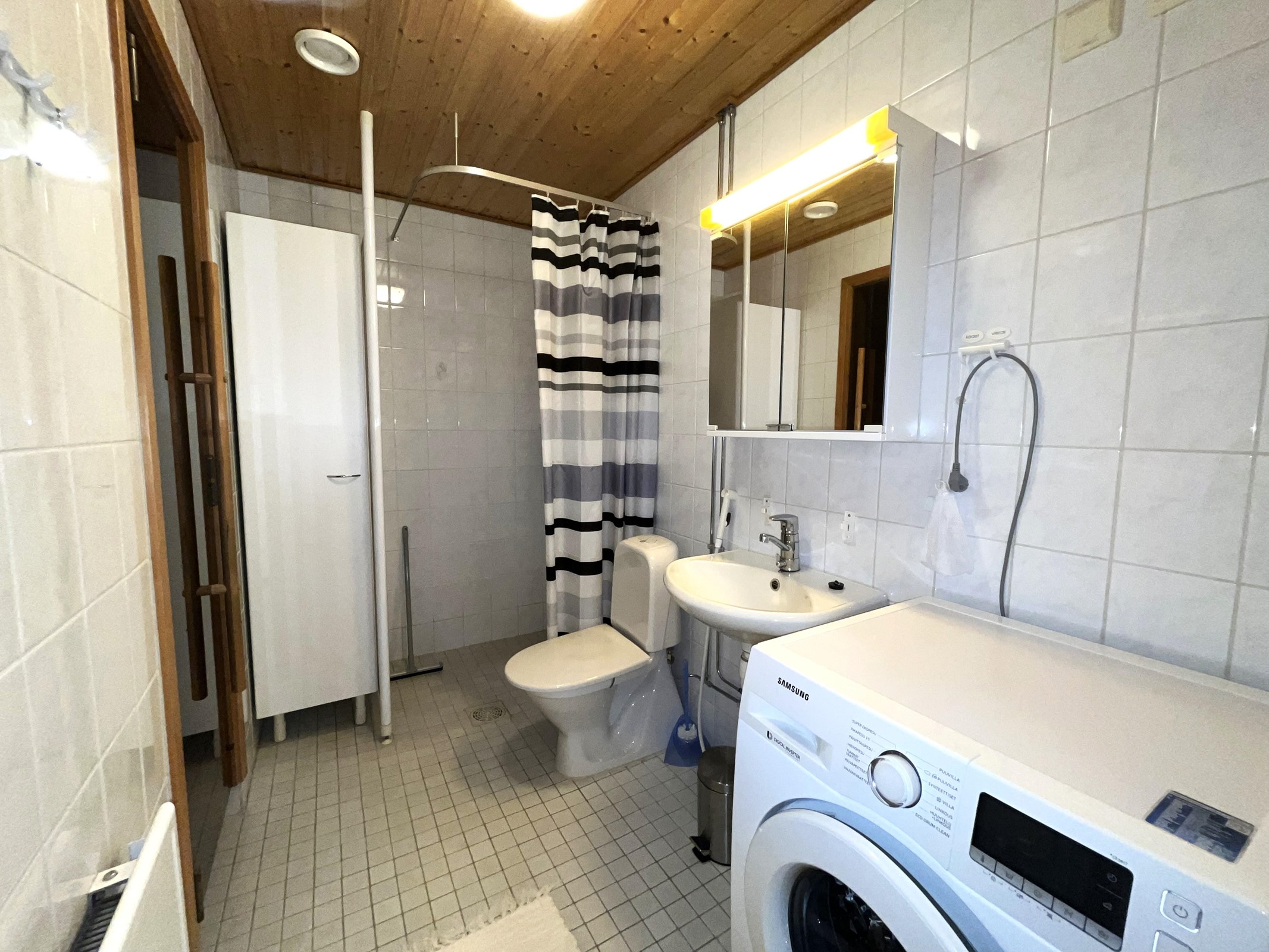 - Sauna, sähkökiuas, kylpyhuone, suihku, suihkuseinä, peilikaappi, pesukoneliitäntä, lattialämmitys.