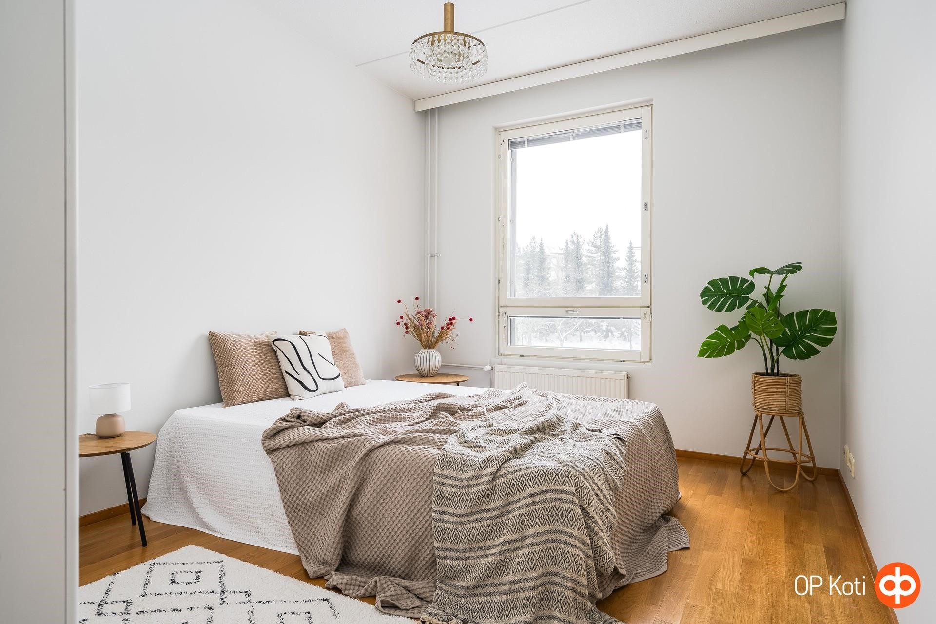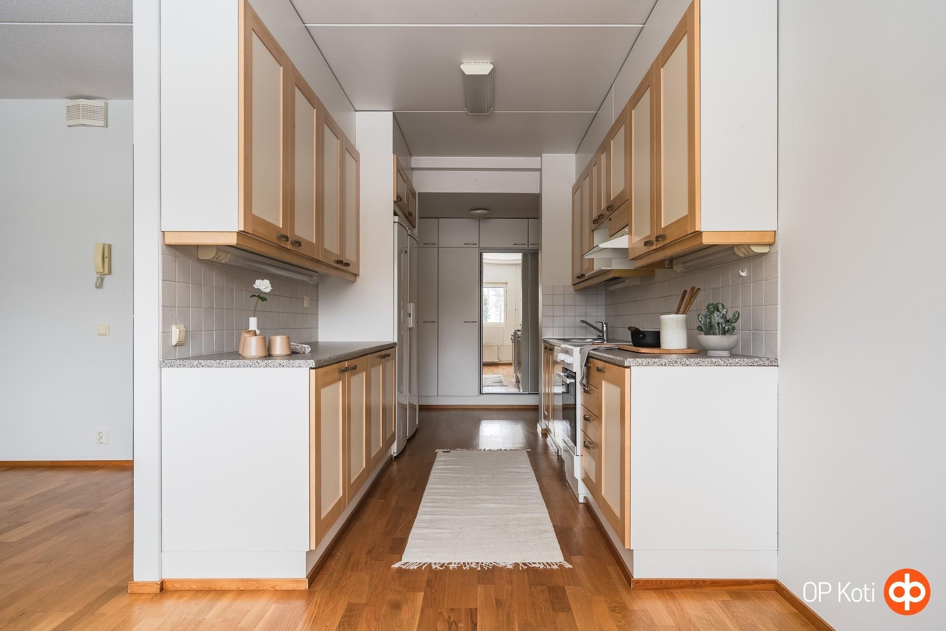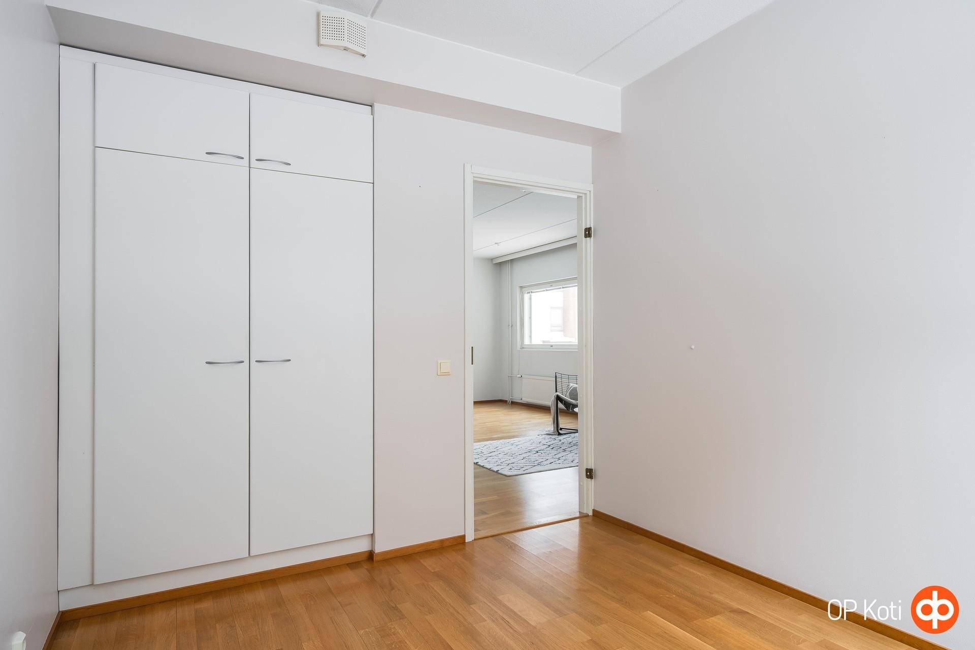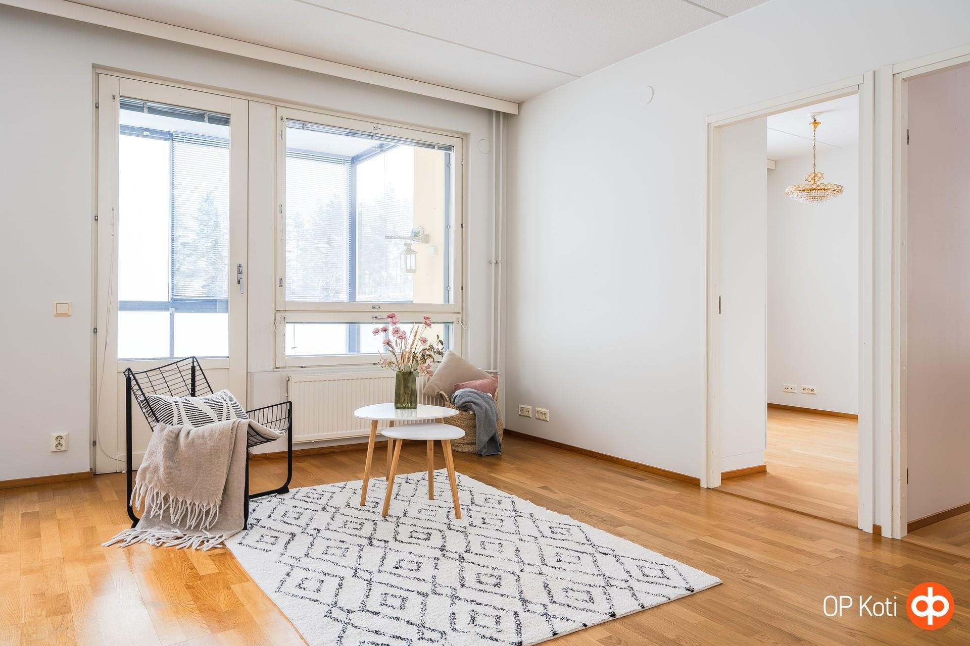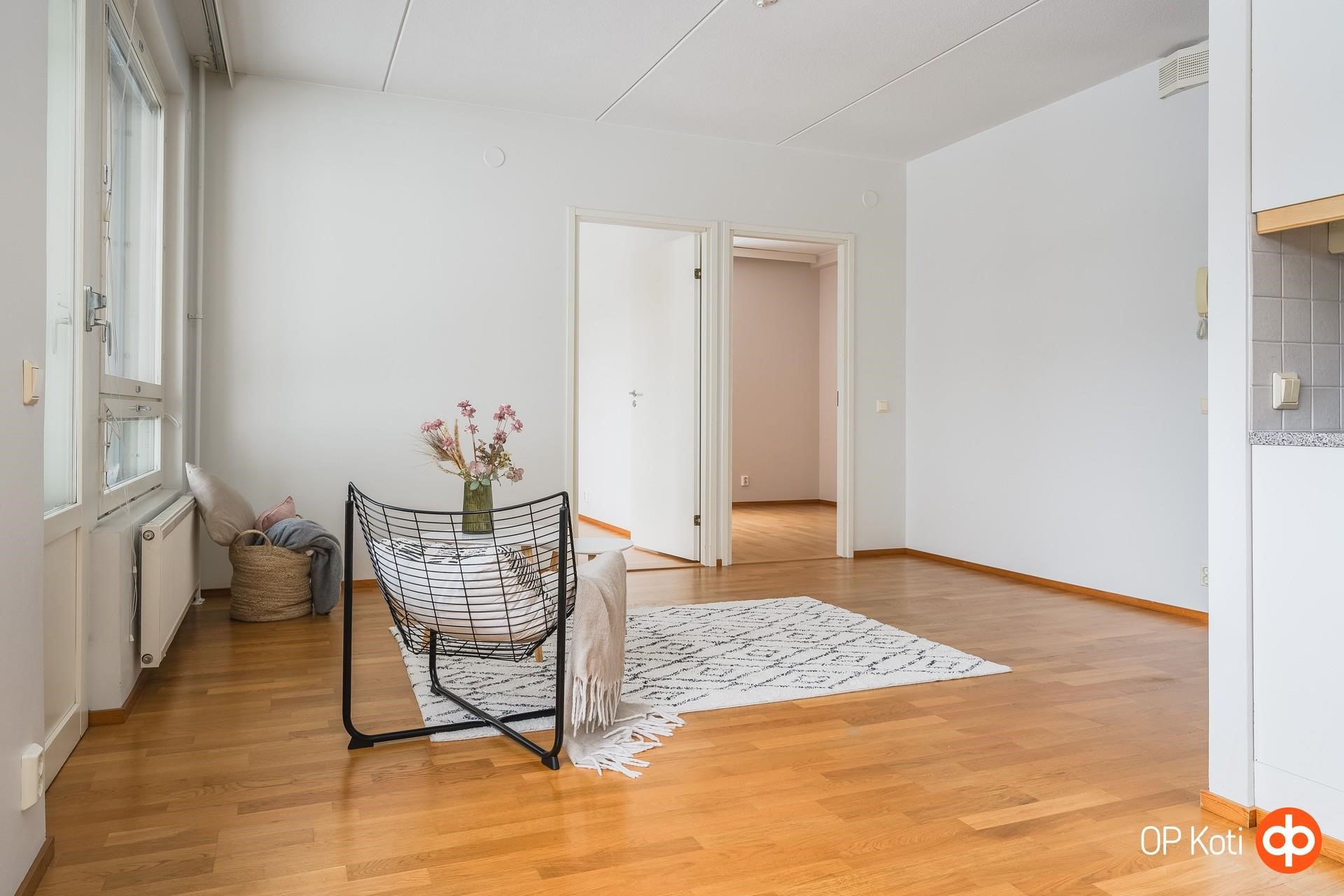 Siistikuntoinen ja muuttovalmis koti hurmaa avaruudellaan. Keittiö, ruokailutila ja olohuone muodostavat yhtenäisen, valoisan kokonaisuuden, jossa on helppo viihtyä ja viettää aikaa yhdessä. Olohuoneesta on käynti lasitetulle, aurinkoiselle parvekkeelle, parvekkeelta on rauhalliset näkymät yhtiön piha-alueelle.
