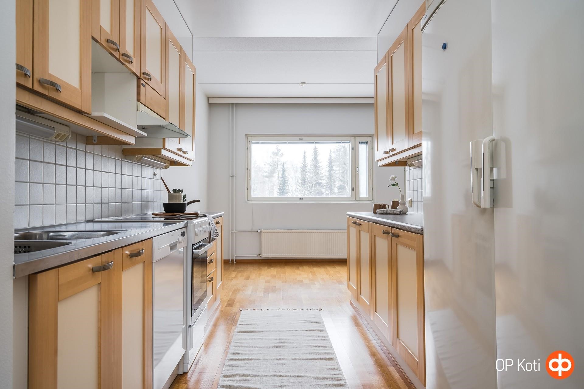 - Keittiön varusteisiin kuuluvat täyskorkeat jää- ja pakastekaapit, keraaminen lattialiesi (2018), liesikupu, astianpesukone (2014) ja kiinteät valaisimet.