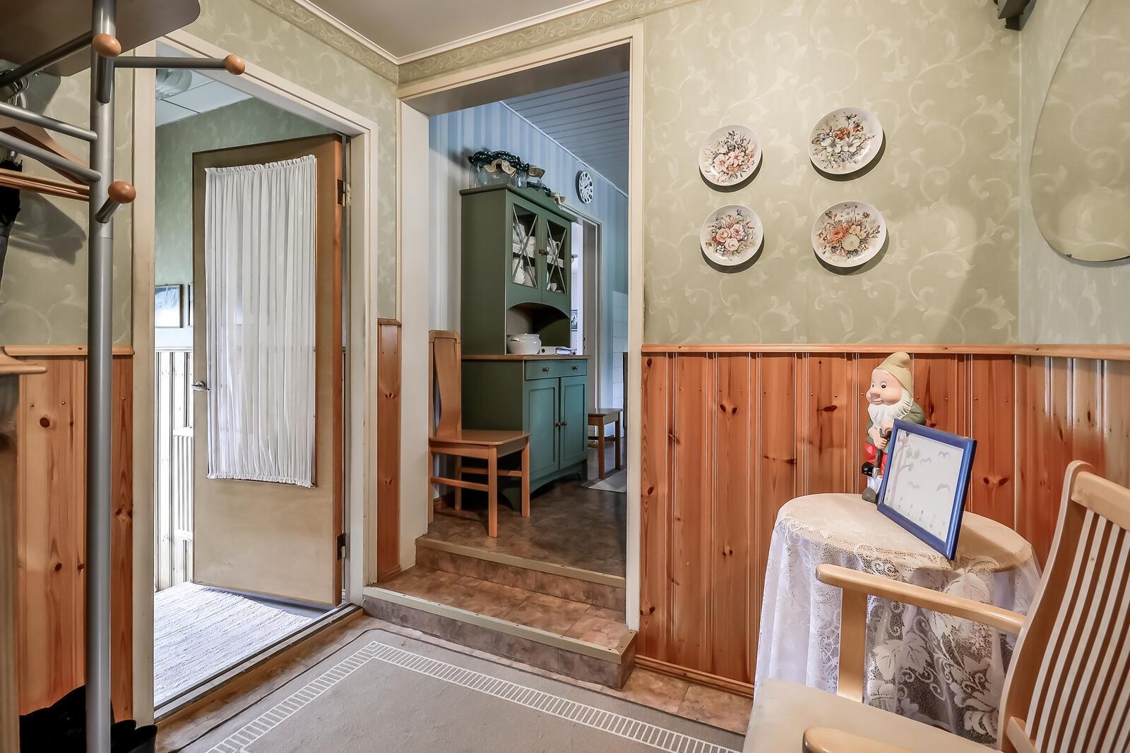 Keittiö: muovimatto lattia/seinät tapetti. Olohuone: parkettilattia/seinät tapetti. Makuuhuone 1: muovimatto lattia/seinät tapetti. Makuuhuone 2: muovimatto lattia/seinät tapetti. Makuuhuone 3: muovimatto lattia/seinät tapetti. Sauna: laatta/paneli. Kylpyhuone: laatta/laatta. Eteinen: muovimatto lattia/seinät tapetti. Wc: muovimatto lattia/seinät tapetti.