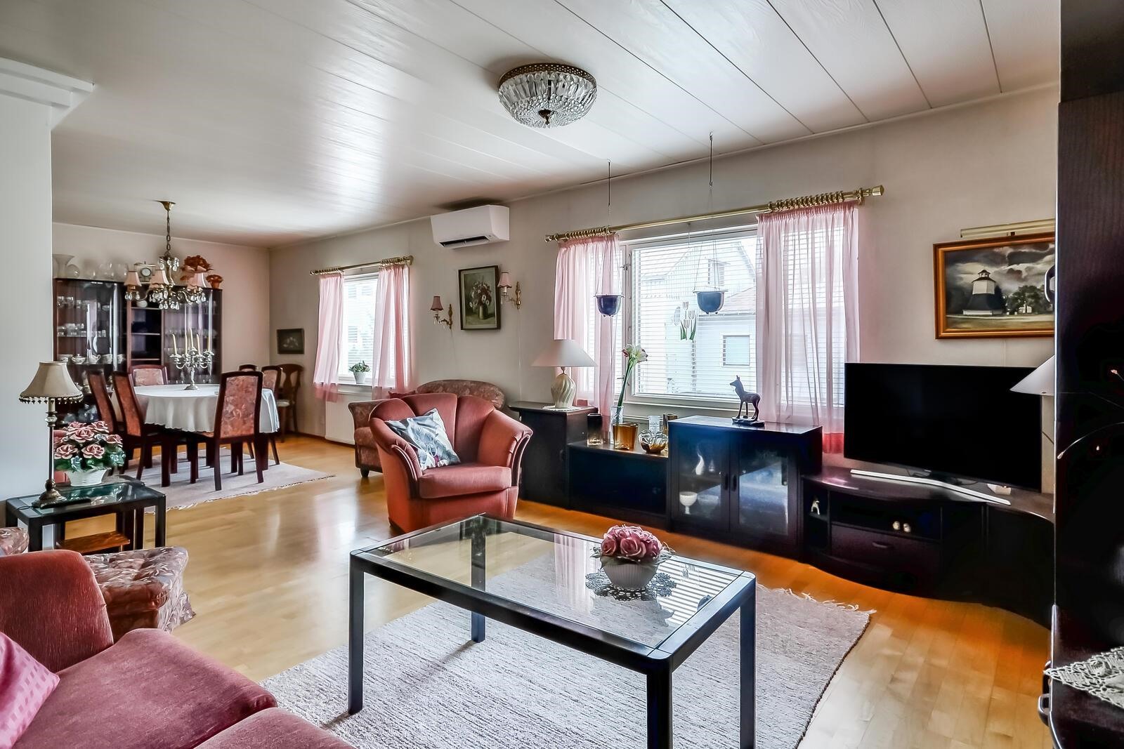- 116 m2Lisäksi kellarikerros jossa pesuhuone, sauna ja varastotilaa. Pinta-ala tiedot myyjältä. Pinta-aloja ei ole tarkistusmitattu