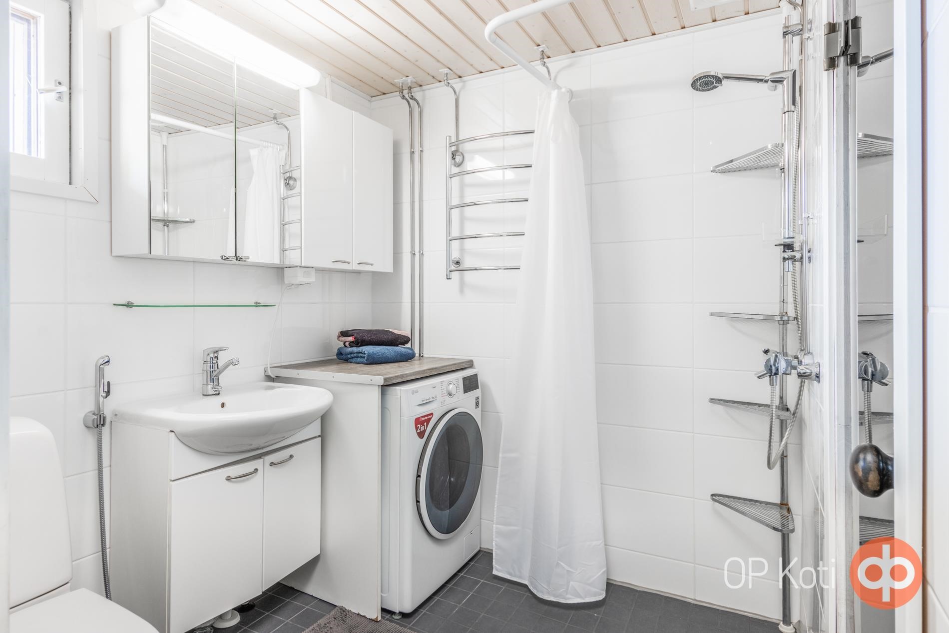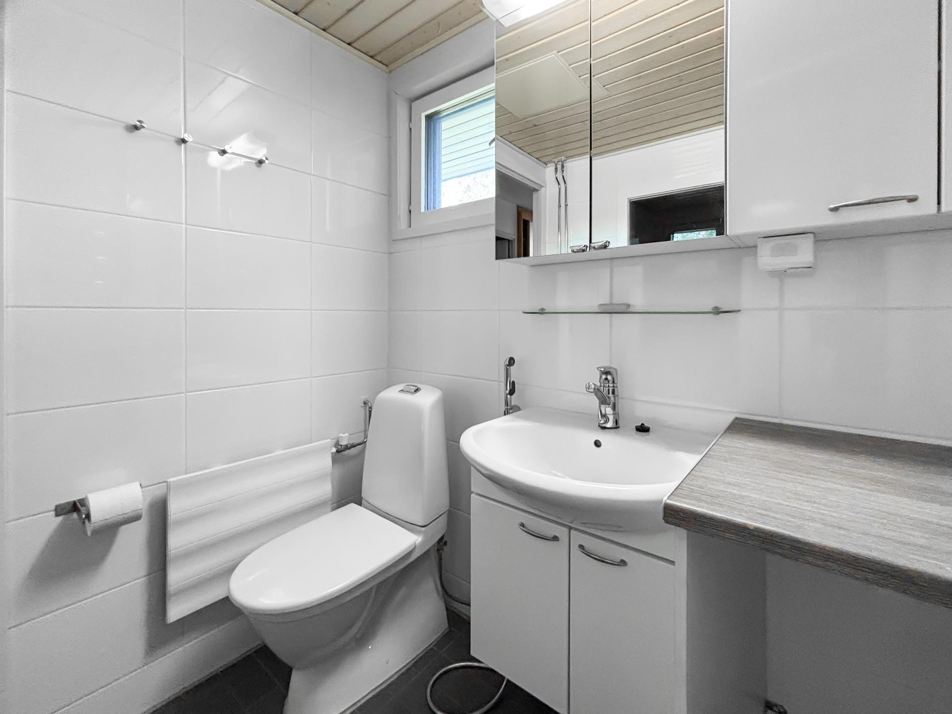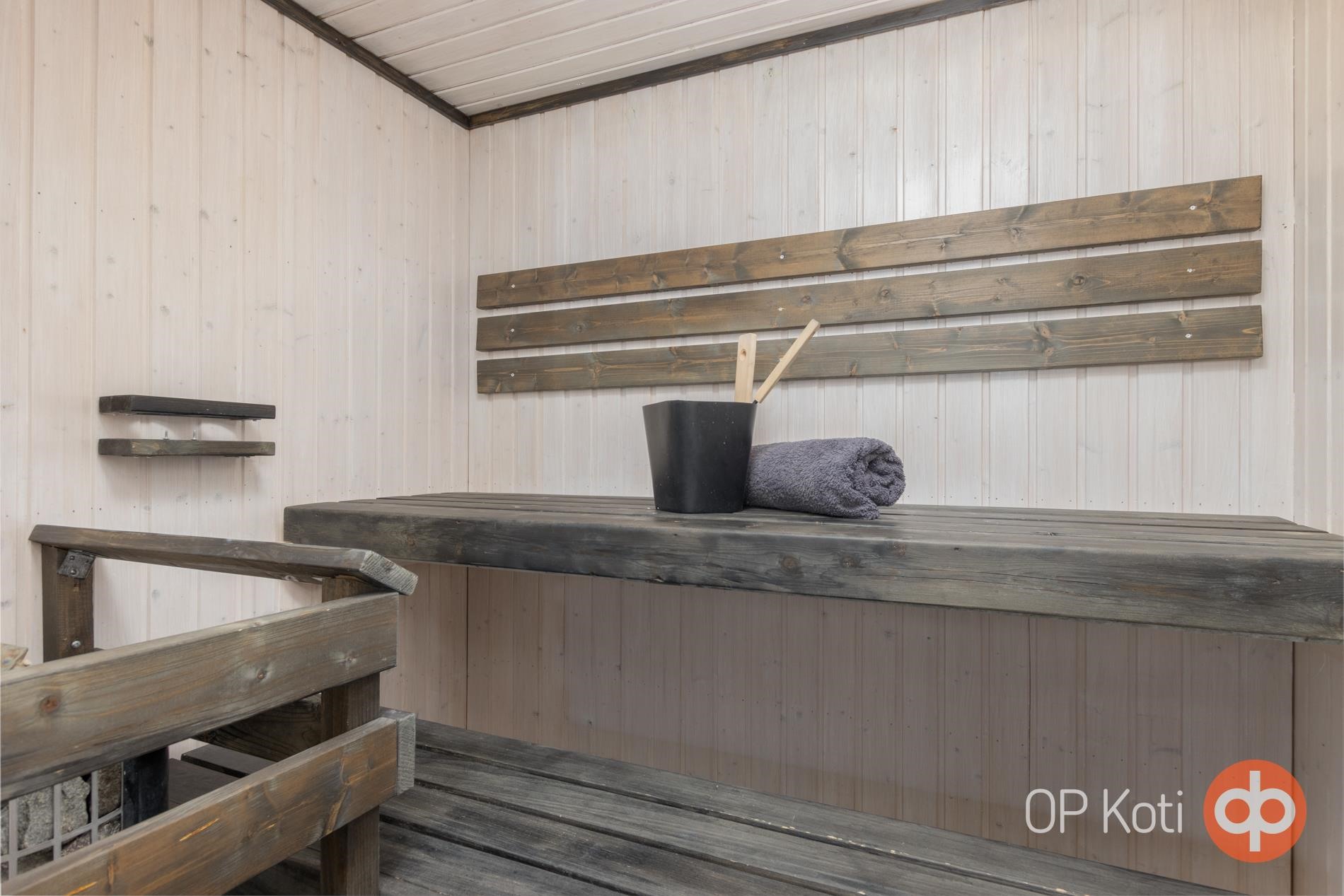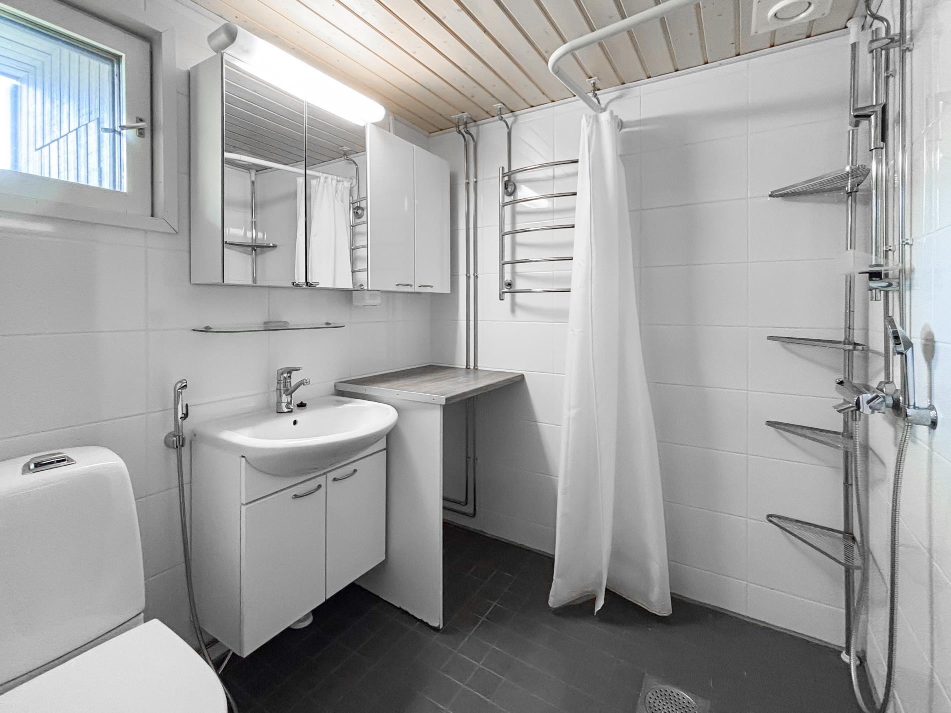- Sauna, sähkökiuas, kylpyhuone, suihku, peilikaappi, allaskaappi, pesukoneliitäntä, lattialämmitys, kiinteät valaisimet.