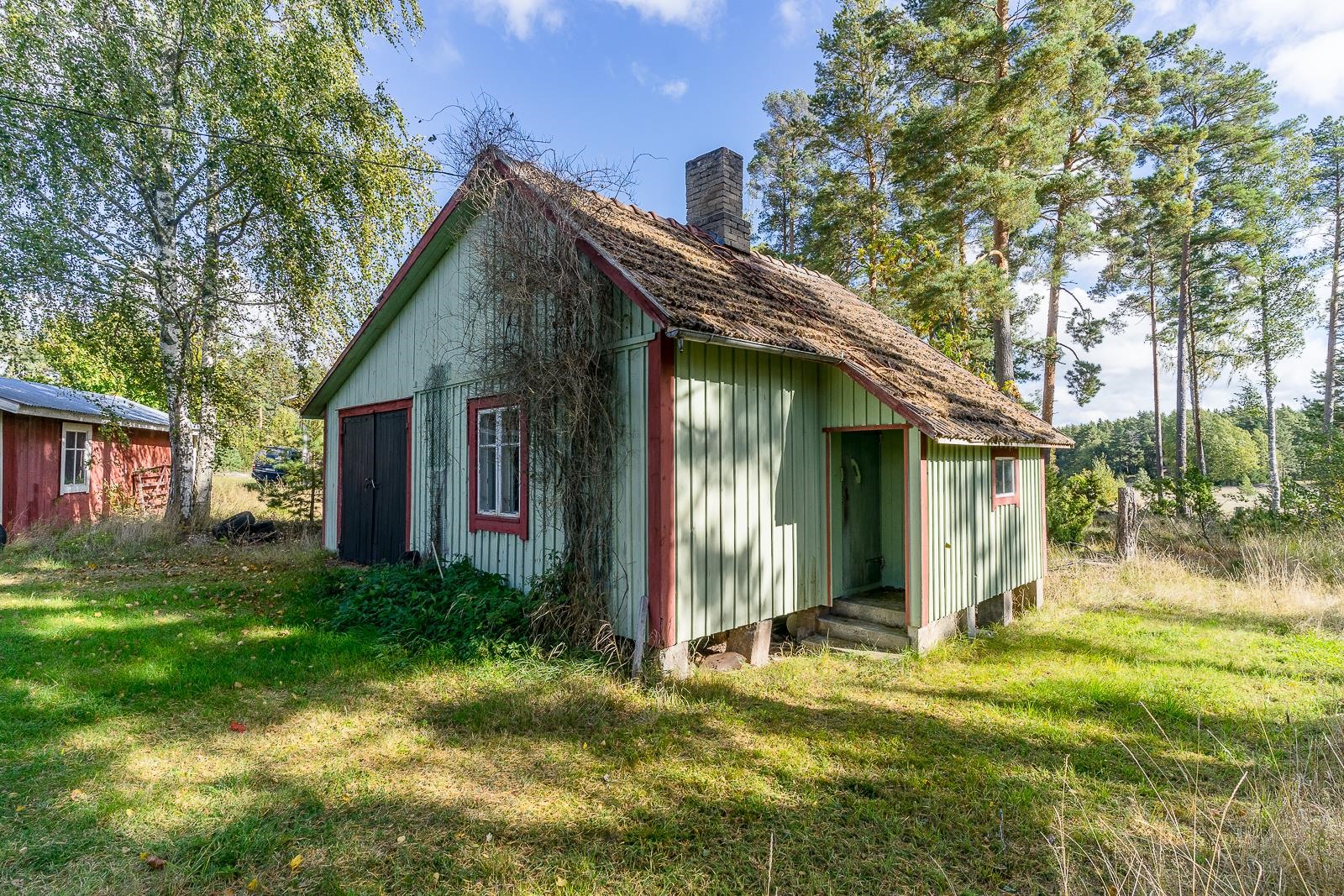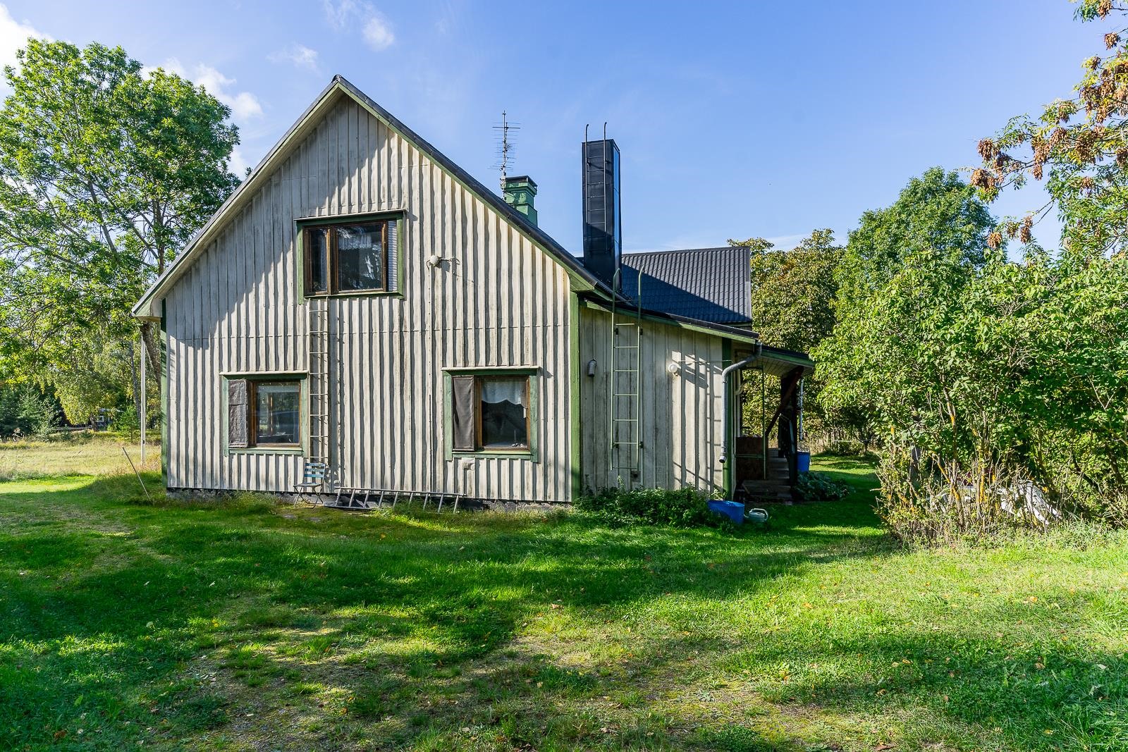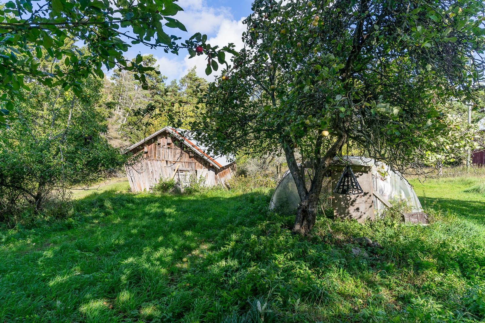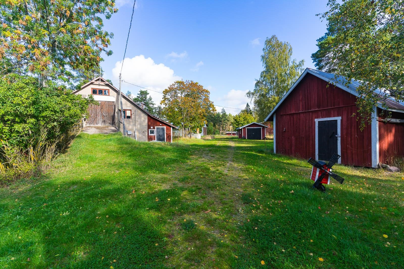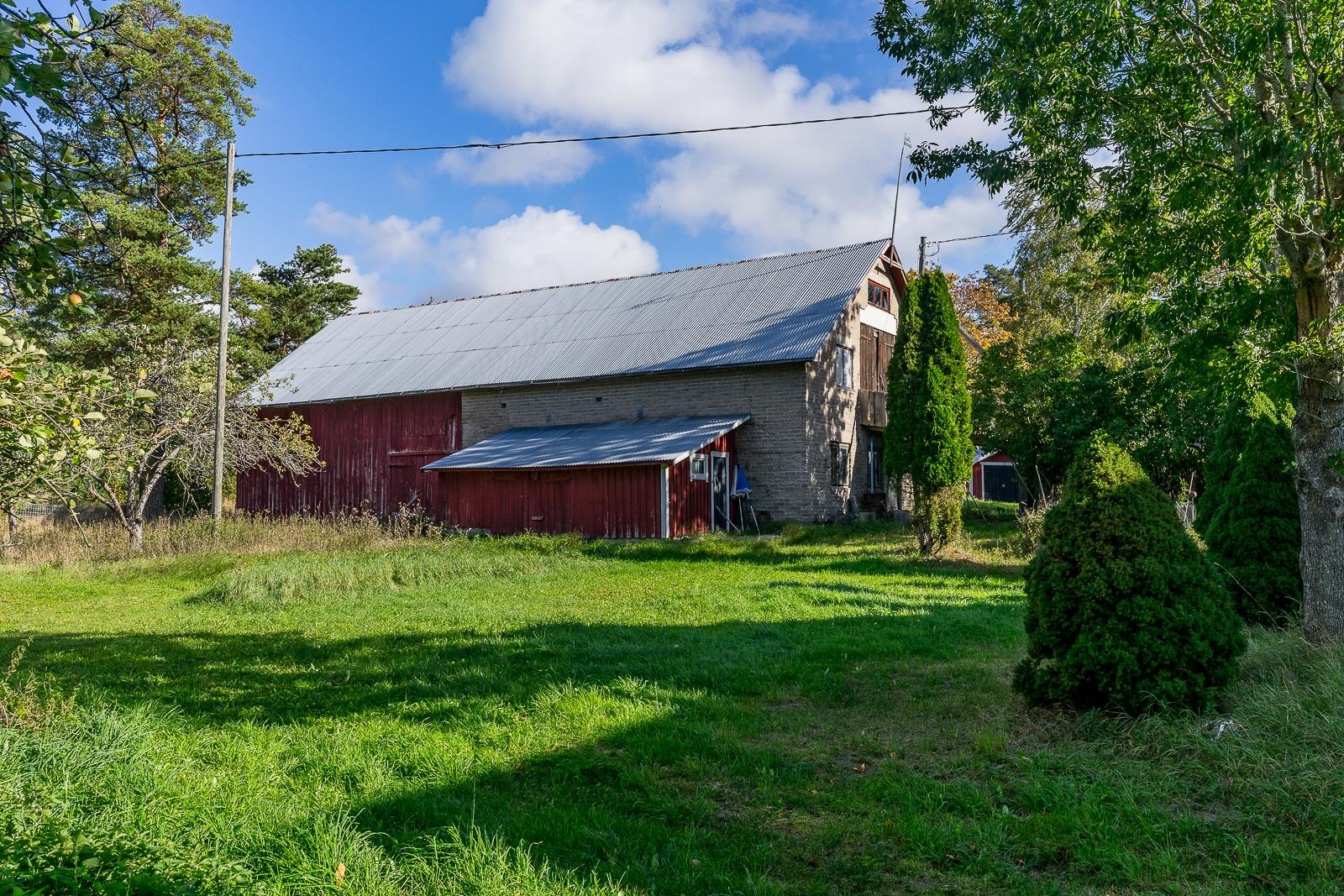 Från fönstret i den gamla storstugan öppnar sig havsutsikt. På gården finns en stor ladugårdsbyggnad, en gammal bastu med ett rum och garage, ett separat garage samt två förrådsbyggnader. Dessutom finns ett uthus i rivningsskick. Byggnaderna möjliggör många användningsmöjligheter. Gården är jämn trädgård med äppelträd och planteringar.