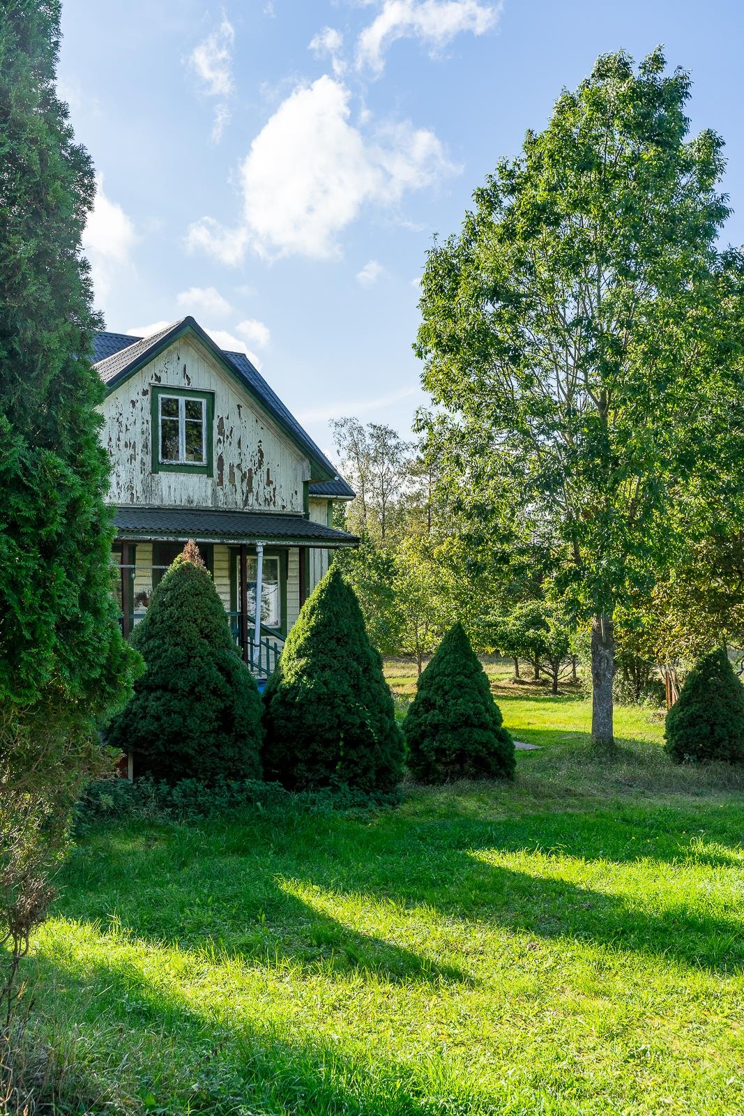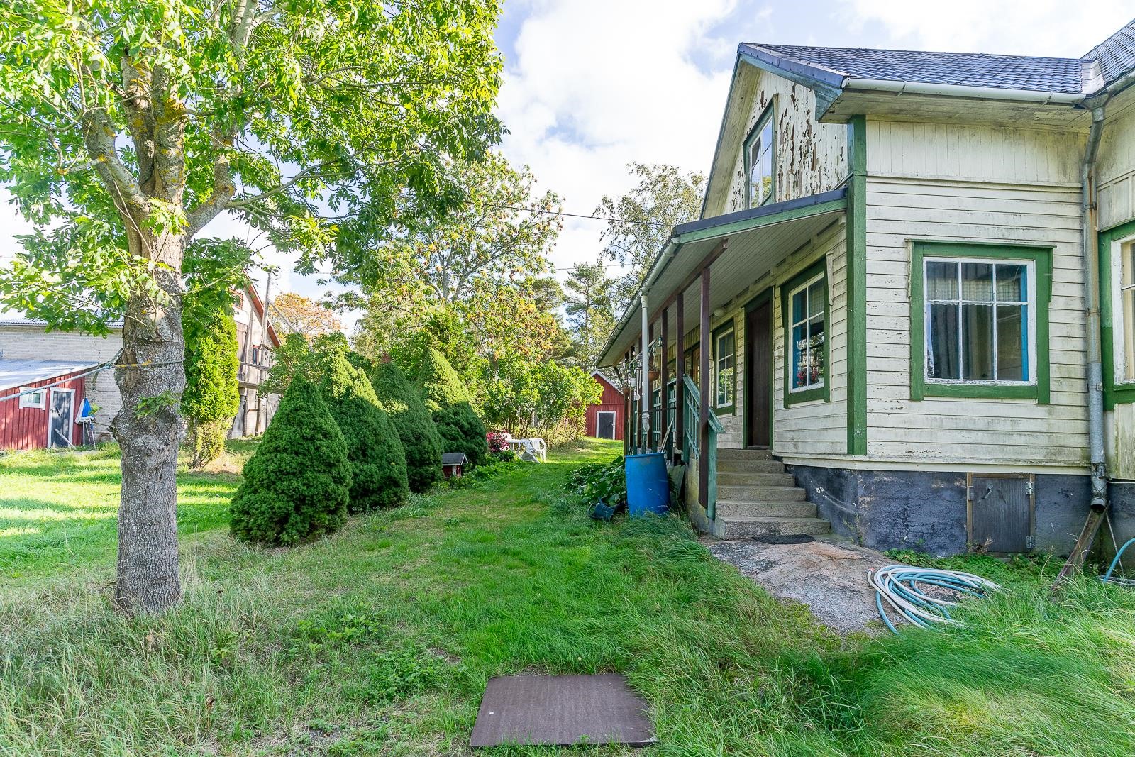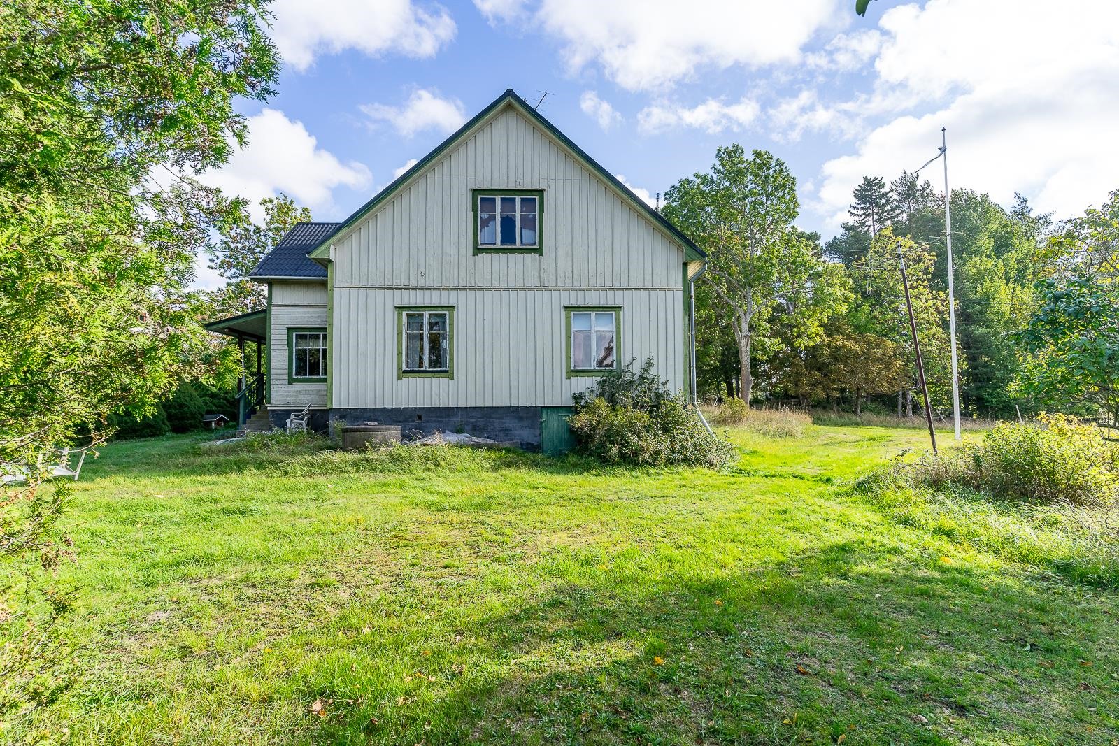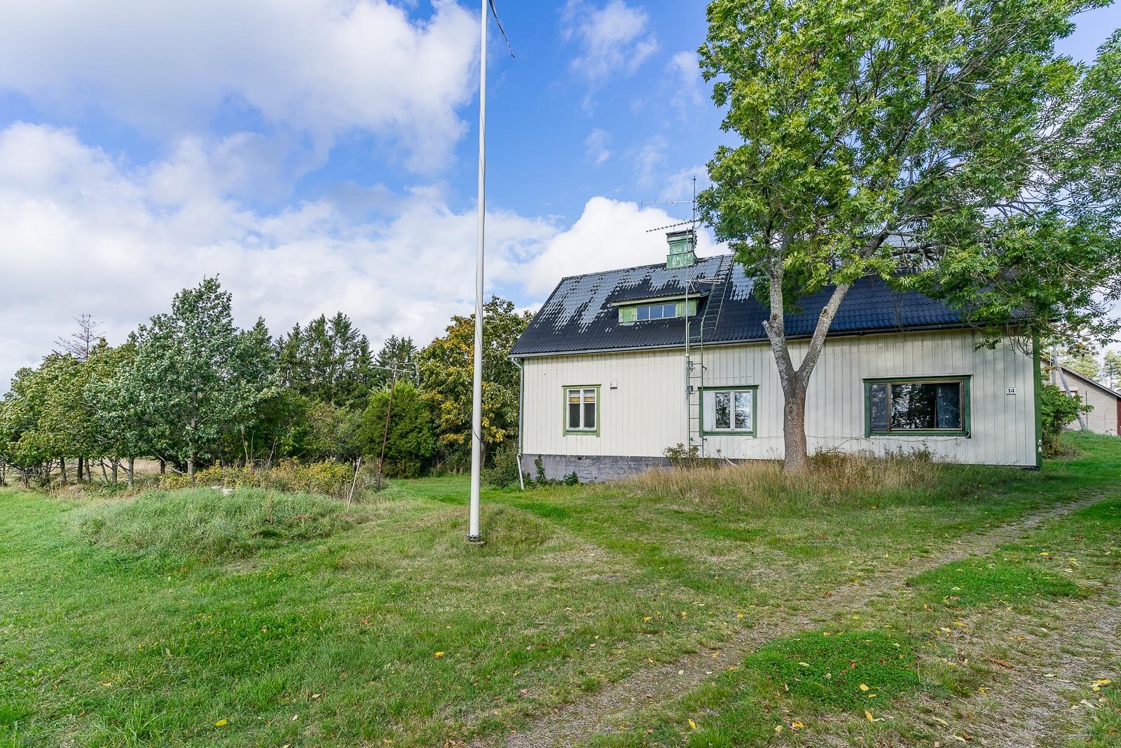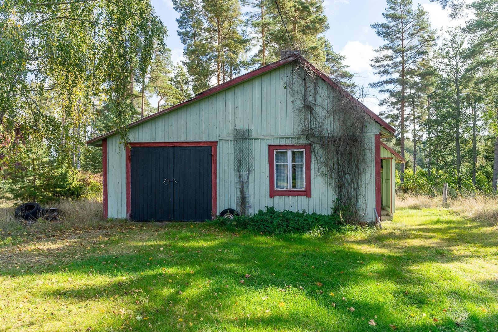 Från fönstret i den gamla storstugan öppnar sig havsutsikt. På gården finns en stor ladugårdsbyggnad, en gammal bastu med ett rum och garage, ett separat garage samt två förrådsbyggnader. Dessutom finns ett uthus i rivningsskick. Byggnaderna möjliggör många användningsmöjligheter. Gården är jämn trädgård med äppelträd och planteringar.